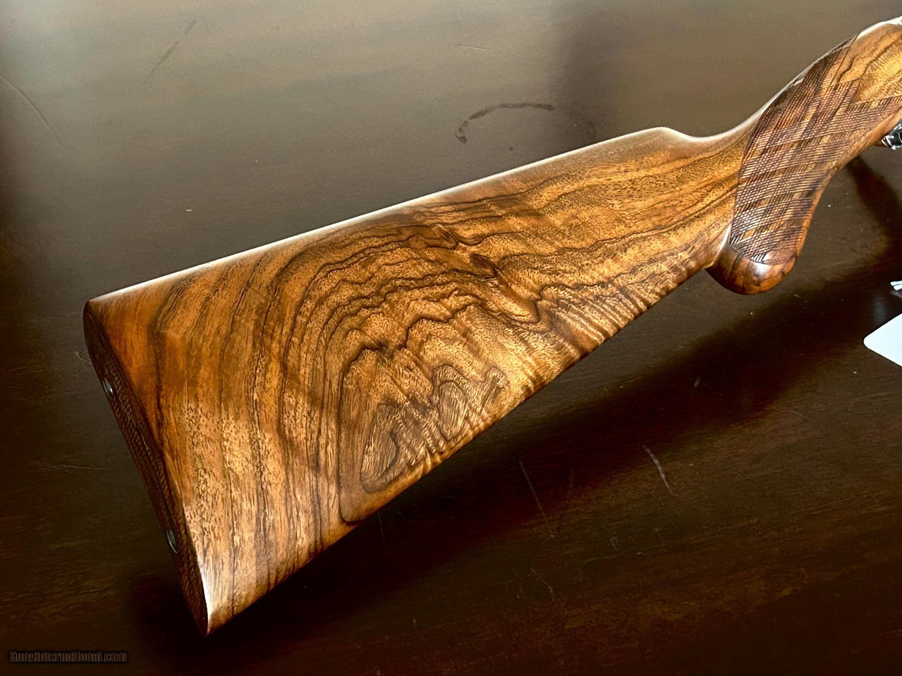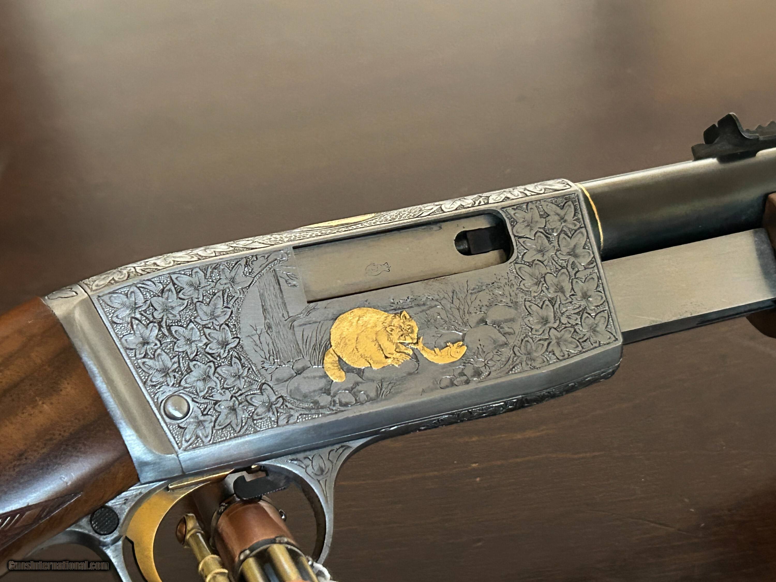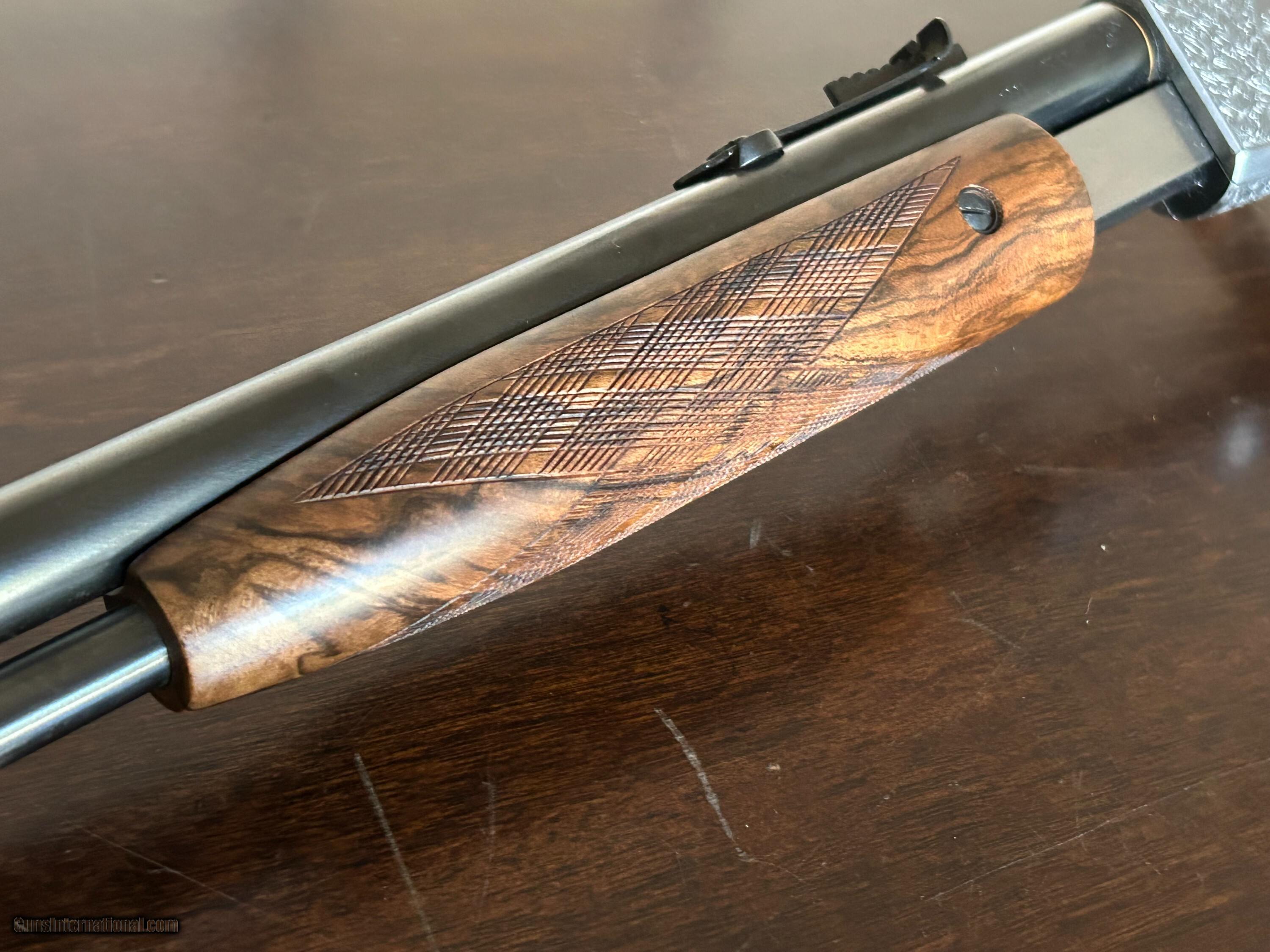 Description: Magnificent Browning Trombone .22lr Gold inlays. checkered butt Amazing wood serial # 143018 Front and rear sights. Superb oil finish Signed on both sides by Angelo Bee. Amazing deep engraving Rifle Caliber: .22 Long Rifle Manufacturer: Browning Model: Trombone Condition: Exc Metal Condition: Exc Wood Condition: Exc Bore Condition: Exc Triggers: single Stock: ROUND KNOB Price: $13,500.00 Contact Seller |