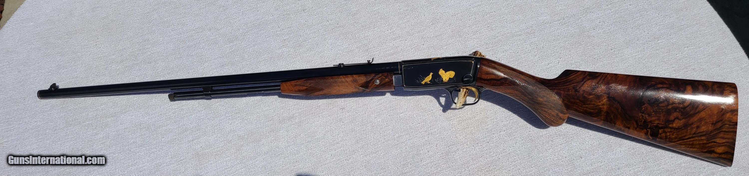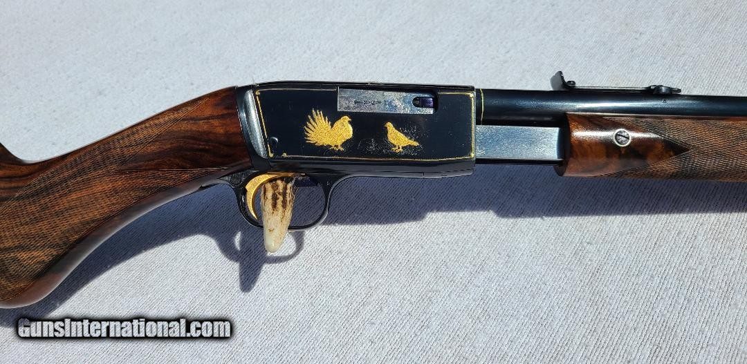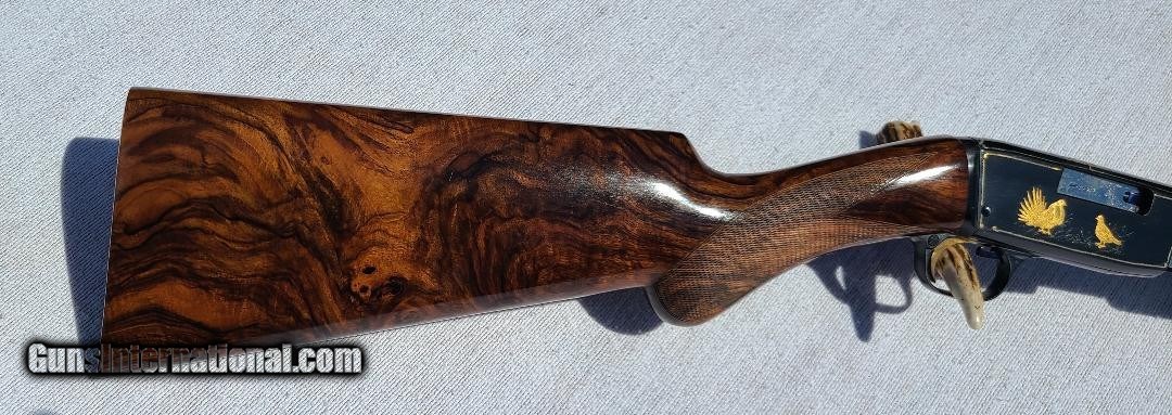 Description: Offers Considered---Trombone Grouse/Woodcock Exhibition Grade. This rifle is truly a one of a kind pattern with pheasants on 1 side, Woodcock on top of receiver, and Grouse head on trigger guard. Sage Grouse on the right side and Greater Parrie Chicken on the left side. The finest high grade walnut with spectacular wood grain with Fine checkering on stock, forearm and butt butt plate. Gold animals with fine detail edge line and gold trigger. Receiver is double signed. Screws in forearm and butt plate are also engraved. Scroll engraving with gold fill on the barrel and gold ring around end of barrel. The dark black bluing really shows off the high quality of engraving with gold. Bore is bright and shiny with excellent rifling.This fine rifle has not been fired since aquisition and has been carefully stored. Rifle is for sale as is in the finest condition. For those who may not know..Angelo Bee has retired and is finishing up the inventory that he had already received and is no longer accepting new requests. $9750.00 shipped SOLD Rifle Caliber: .22 Long Rifle Manufacturer: Browning FN Model: Trombone Serial Number: 64200 Barrel Length: 22 Bore: Bright Shiny Condition: Excellent Metal Condition: Excellent Wood Condition: Excellent Bore Condition: Excellent Action: Pump Triggers: Gold Stock: Excellent Fore End: Excellent Finish: Excellent Engraving: Presentation Grade |