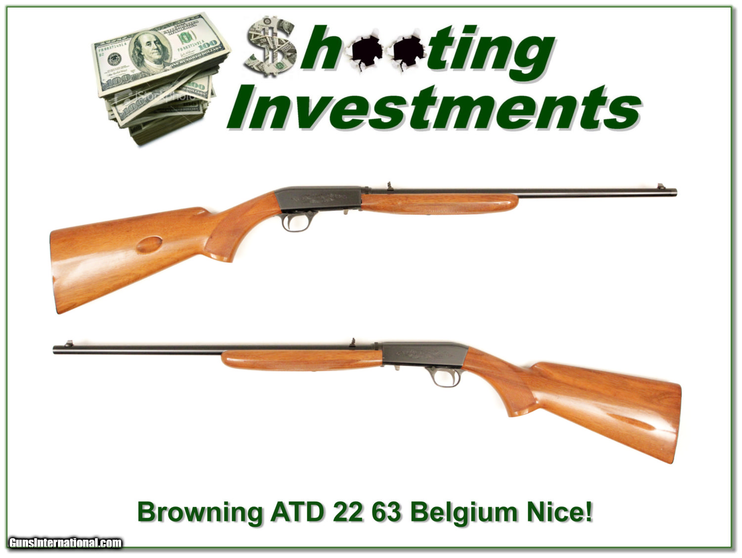 Description: This is a Browning 22 Auto. It was made in Belgium in 1963 and has the desirable blond wood. It is in excellent condition. The blue has no edge wear and I am sure not shot many rounds. The blond wood has only a couple minor marks. It will make a nice addition to your collection and is one you can use and still expect to increase in value over time. It is a real Shooting Investment! Shipping and insurance is $35 or $15 more if you want it shipped in a new Plano hard case. Please email me with any questions or larger pictures. (I now consign quality firearms only 10%! Let me know if you have any you would like to sell!) [16-0179] Payment: Payment is by Money Order, Cashiers Check or Personal Check. I can now also accept MasterCard and Visa with a 3% convenience fee. PayPal can be used for some items but never firearms. Please let us know if you would like to pay via PayPal. Shipping: The shipping charge will be listed in each description. It is $35 for most guns. Some heavy guns or those insured for over $2000 will be higher. Shipments to Alaska and Hawaii are higher because air shipment is required. Most firearms are shipped within 5 days of receipt of payment. We prefer shipping at the beginning of the week to avoid firearms in transit over weekends. We package all shipments carefully and insure them for the full purchase price, rounded up to the next $100. In the unlikely event that damage occurs, it is important that you save all packaging material for the claims process. Optics are shipped Priority Mail and most other non-firearm shipments are shipped First Class. Returns: Our return policy is simple. If for any reason you are not pleased with your purchase, you may return your item for a refund. The only exception is ammunition, it cannot be returned. It is important to us that you are happy. Guns cannot be fired or dissembled before returning them and must be returned in the same condition as received. Notification of a return must occur with-in 3 days of receipt at your dealer. Shipping, convenience and dealer fees are not refundable and are the responsibility of the buyer. Lay-a-way: If needed, we offer a 60 day lay-a-way option on most firearms. It is 1/3 now, 1/3 in 30 days and 1/3 in 60 days. Lay-a-way firearm sales are final. Consigning your firearms with Shooting Investments: We will help you get top dollar for your firearms. While most local guns shops charge 20% or more, our fee is only 10% with a minimum of $50. At your local gun shop it might take months to sell. Selling on-line provides instant access to thousands of interested buyers. You won’t find any other on-line dealer willing to sell your firearms for only 10% or listing every gun on 4 separate s. Selling through an House typically costs the seller 15% and the buyer an addition 15% (so 30%) and you have to wait several months to sell and longer to receive funds. If properly priced, we will sell your firearms in a week or two. Send us an email or give us a call and we’ll explain how easy it is for you to get top dollar. Trading: We collect guns and usually just trade for guns we want to add to our collections. We often sell guns for others wanting to purchase one of ours. We find this the most fair to both of us. Our Commission is only 10% and we hold the gun you want until yours sells. Please contact us if you want to sell one of yours to buy one of ours. Help for California Buyers: We are happy to ship to California. It is the buyer’s responsibility to make sure any item you buy is legal in your state. We are also happy to help with your purchase of a firearm from someone other than us. If you see a gun you would like to buy but the seller can’t or won’t ship to California we can help. You buy the gun and have it shipped to us. We’ll then ship it to your California dealer. The cost for this service is only $30 + shipping. Let me know if we can help! SOLD |
