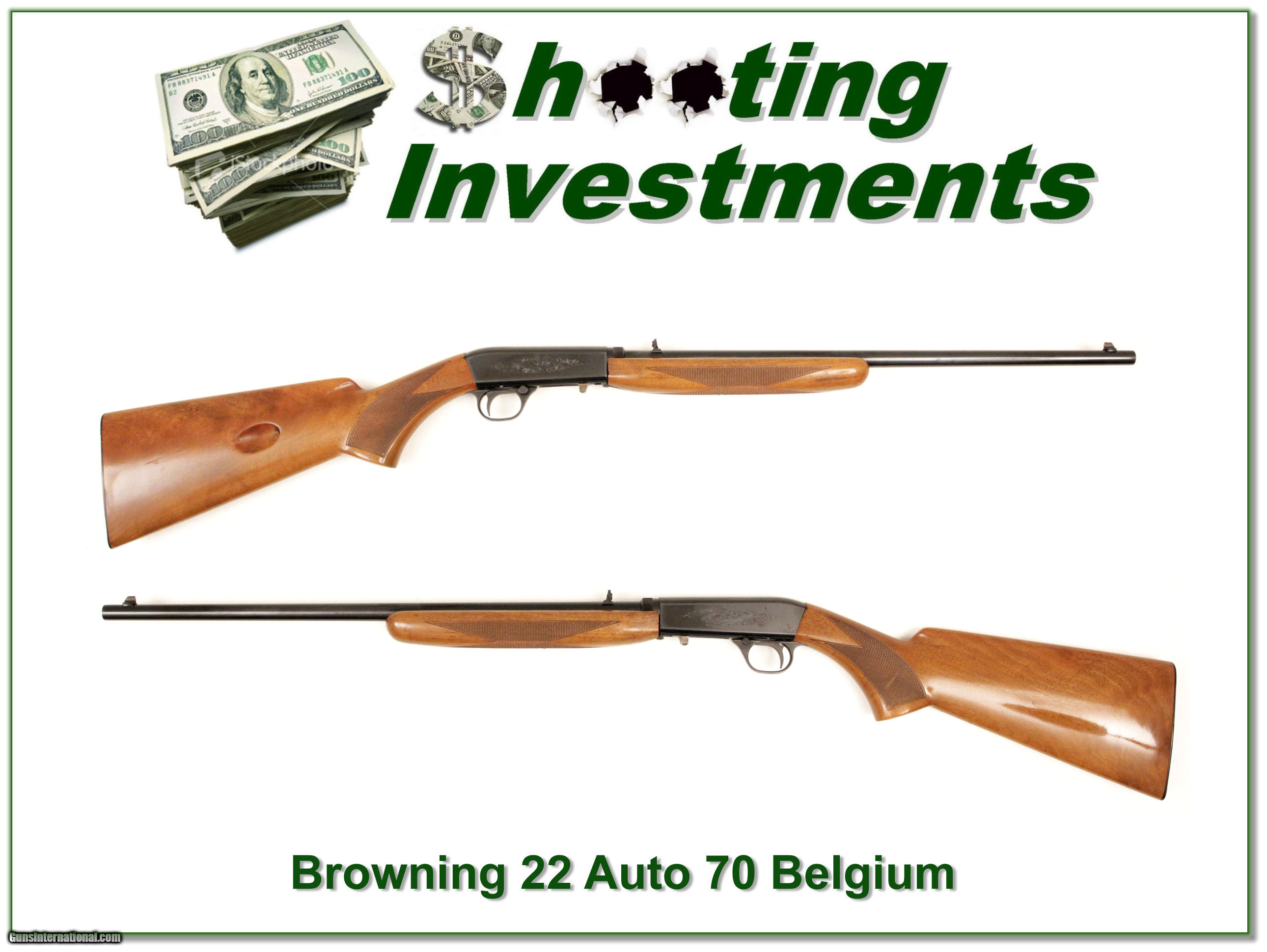 Description: This Browning 22 auto takedown was made in Belgium in 1970. It has very nice honey blond wood. Blue shows little use. Only a few minor marks this is one you can use yet still expect to increase in value over time. It is a real Shooting Investment! Shipping and insurance is $35 or $15 more if you want it shipped in a new Plano hard case. Please email me with any questions or larger pictures. (I now consign quality firearms only 10%! Let me know if you have any you would like to sell!) [16-0215] Payment: Payment is by Money Order, Cashiers Check or Personal Check. I can now also accept MasterCard and Visa with a 3% convenience fee. PayPal can be used for some items but never firearms. Please let us know if you would like to pay via PayPal. Shipping: The shipping charge will be listed in each description. It is $35 for most guns. Some heavy guns or those insured for over $2000 will be higher. Shipments to Alaska and Hawaii are higher because air shipment is required. Most firearms are shipped within 5 days of receipt of payment. We prefer shipping at the beginning of the week to avoid firearms in transit over weekends. We package all shipments carefully and insure them for the full purchase price, rounded up to the next $100. In the unlikely event that damage occurs, it is important that you save all packaging material for the claims process. Optics are shipped Priority Mail and most other non-firearm shipments are shipped First Class. Returns: Our return policy is simple. If for any reason you are not pleased with your purchase, you may return your item for a refund. The only exception is ammunition, it cannot be returned. It is important to us that you are happy. Guns cannot be fired or dissembled before returning them and must be returned in the same condition as received. Notification of a return must occur with-in 3 days of receipt at your dealer. Shipping, convenience and dealer fees are not refundable and are the responsibility of the buyer. Lay-a-way: If needed, we offer a 60 day lay-a-way option on most firearms. It is 1/3 now, 1/3 in 30 days and 1/3 in 60 days. Lay-a-way firearm sales are final. Consigning your firearms with Shooting Investments: We will help you get top dollar for your firearms. While most local guns shops charge 20% or more, our fee is only 10% with a minimum of $50. At your local gun shop it might take months to sell. Selling on-line provides instant access to thousands of interested buyers. You won’t find any other on-line dealer willing to sell your firearms for only 10% or listing every gun on 4 separate s. Selling through an House typically costs the seller 15% and the buyer an addition 15% (so 30%) and you have to wait several months to sell and longer to receive funds. If properly priced, we will sell your firearms in a week or two. Send us an email or give us a call and we’ll explain how easy it is for you to get top dollar. Trading: We collect guns and usually just trade for guns we want to add to our collections. We often sell guns for others wanting to purchase one of ours. We find this the most fair to both of us. Our Commission is only 10% and we hold the gun you want until yours sells. Please contact us if you want to sell one of yours to buy one of ours. Help for California Buyers: We are happy to ship to California. It is the buyer’s responsibility to make sure any item you buy is legal in your state. We are also happy to help with your purchase of a firearm from someone other than us. If you see a gun you would like to buy but the seller can’t or won’t ship to California we can help. You buy the gun and have it shipped to us. We’ll then ship it to your California dealer. The cost for this service is only $30 + shipping. Let me know if we can help! SOLD |
