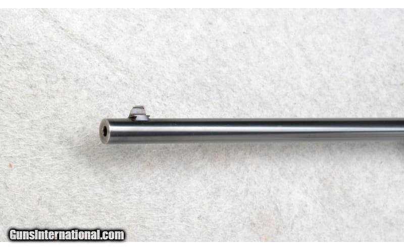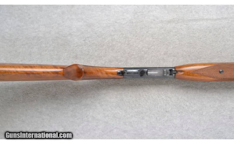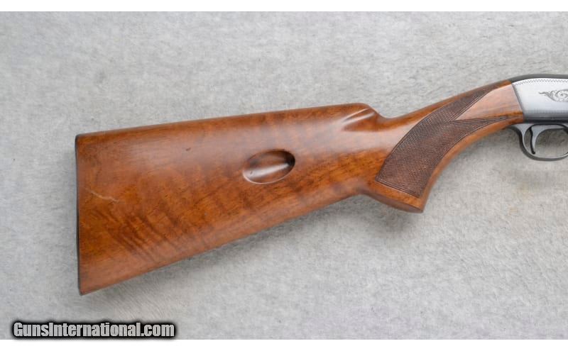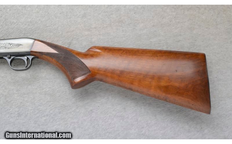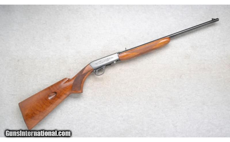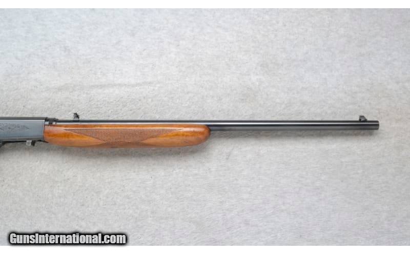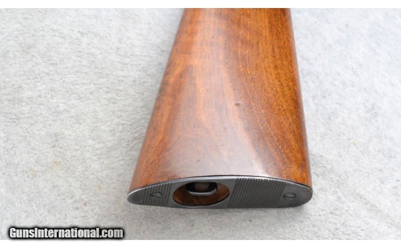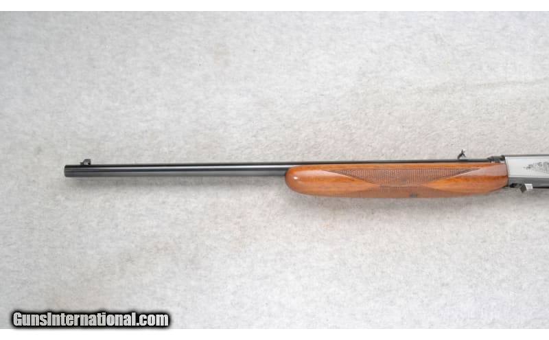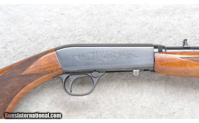 Description: This Browning Model .22 Semi-Auto is a take-down rifle in .22 Long Rifle. It has a 19 inch barrel. A blade front sight and an adjustable notch middle sight. The butt stock is a checkered grip walnut pistol grip with a right side quick loading port. The forearm is a checkered grip walnut. The receiver is lightly engraved. Made in Belgium. .22 Long Rifle SOLD Metal Condition: Very Good. Minor handling marks and very minor freckling. Wood Condition: Good. Some light handling marks. Very fine hairline cracks in the surface finish. Bore Condition: Excellent. Barrels: 19 inch. Stock Dimensions: LOP 13 3/4 inches. Fore End: Checkered grip walnut. Butt Pad: Grooved steel plate with a loading port. Weight: 4 lb. 12 oz. Sights: Blade front. Adjustable notch middle. Item Location: Richfield, WI |