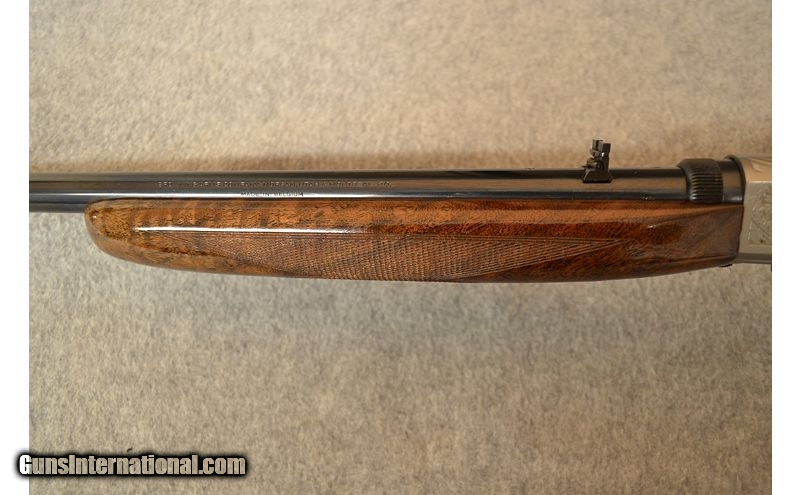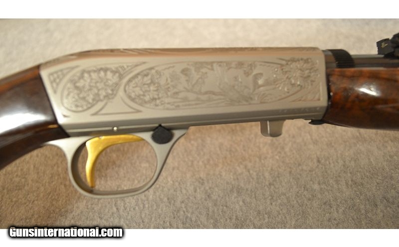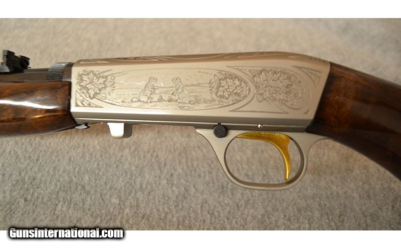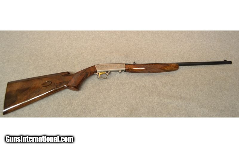 Description: Grade II with engraver's initials ' AM ' on top of receiver, excellent metalwork; a beautiful specimen except for slight damage to fore arm underside at barrel catch, seen in photos SOLD Manufacturer: SN: 72T67684 ; made in Belgium Caliber Info: .22 LR Metal Condition: Excellent, long mark on slide; Grade II 'AM ' initialed engraving Wood Condition: Excellent overall, a few light finish dings; NOTE fore end damage Bore Condition: Clean Barrels: 19 inches Triggers: Factory 'gold' trigger, semi-automatic Stock: Factory Grade II wood Stock Dimensions: LOP 13 3/4 Fore End: Factory takedown wood forearm, with damage at barrel catch, see photos Butt Pad: Factory metal buttplate Weight: 4 lb 13 oz Sights: Factory folding rear and fixed front sights Item Location: Greenville, SC |