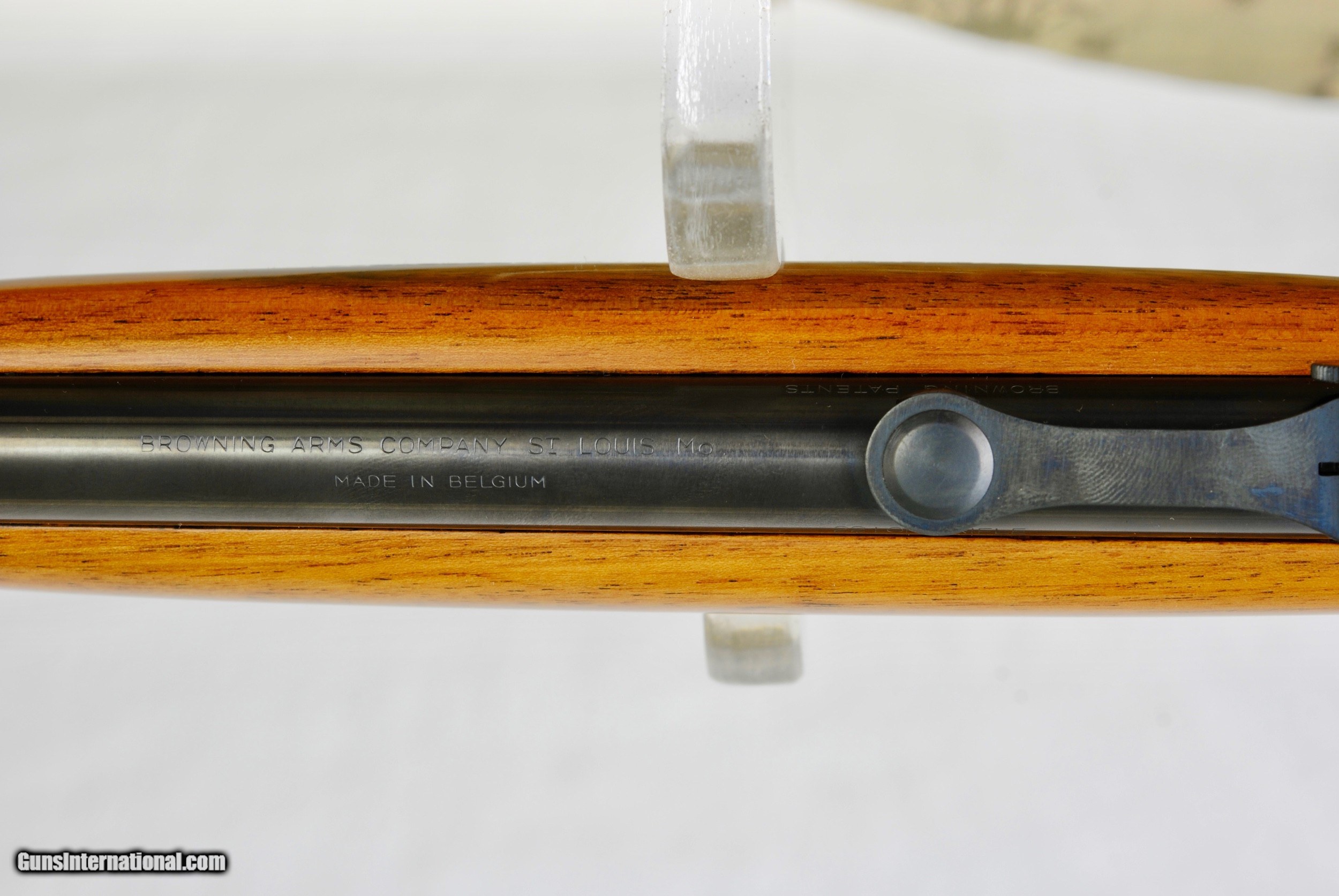 Description: Belgian Browning Semi Auto in 22 Long Rifle. This was the 126th Semi Auto produced (serial number T126) in the first year of production of 1956. Full restoration by authorized Browning Dealer, Arts Gun Shop. Four step adjustable wheel sight. Barrel is 19 1/2". No holes for scope mount. no groved receiver. Top of barrel lettering reads - Browning Arms Company, St. Louis, MO. Caliber is 22 Long Rifle. Weight of gun is 4 LBS 14 1/4 OZ. Shipping is $50. SOLD Curio/Relic: Yes Rifle Caliber: .22 Long Rifle |