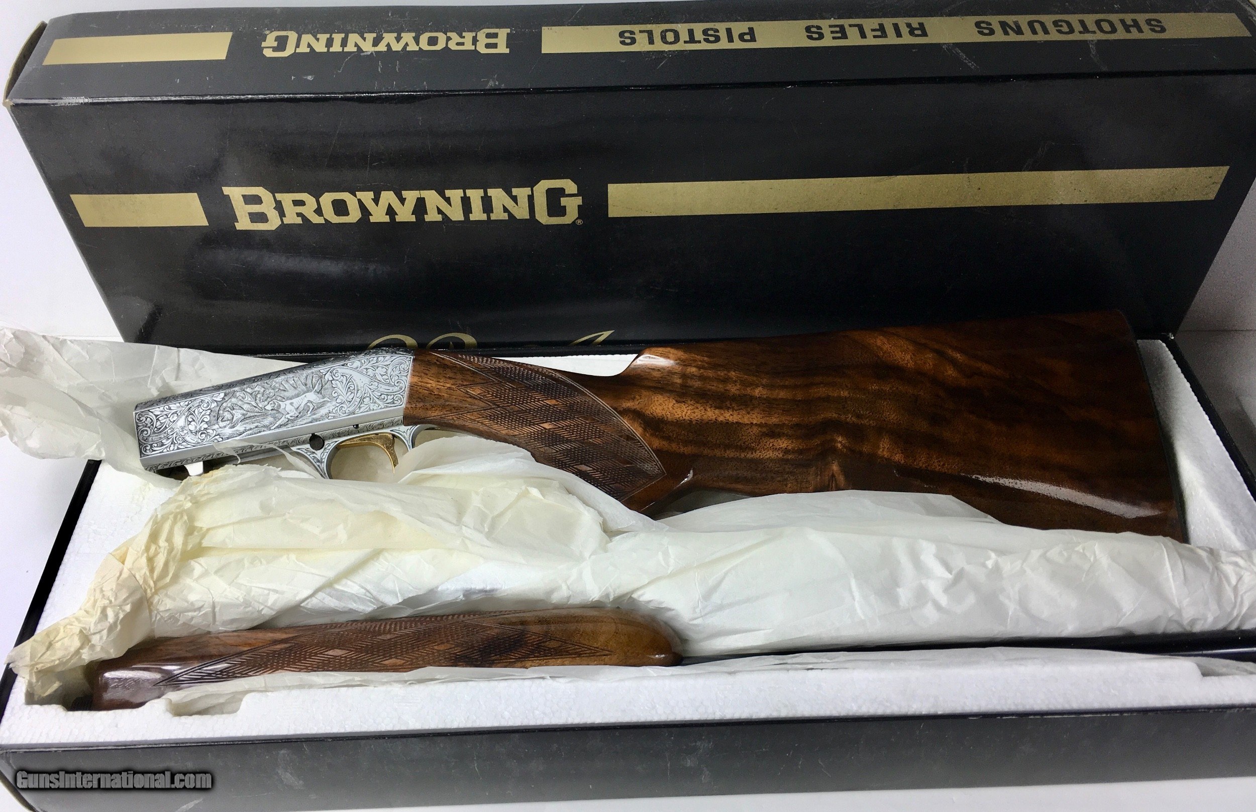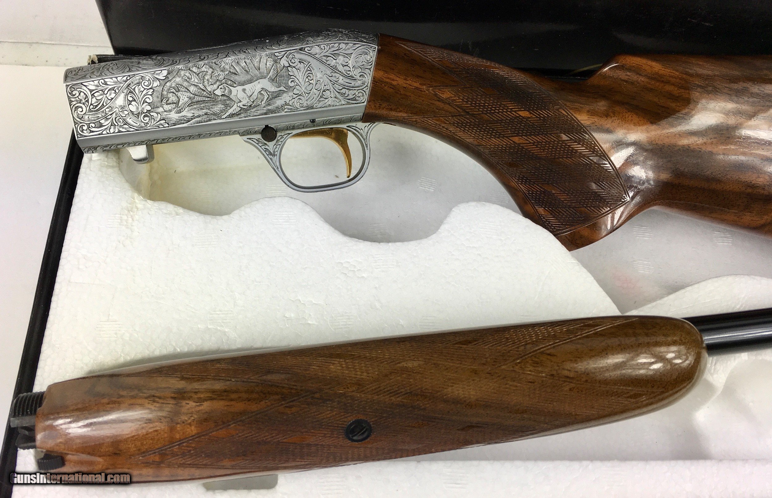 Description: Sold, John M. Collector presentation Grade III, Browning 22 ATD, new in the box and mint. A very rare find in this condition, born in 1977, this is a transitional Browning with barrel marked Japan. French grayed receiver was engraved and signed by M Magis, in Belgium, one of Browning's finest Belgium engravers. This beauty has been virtually untouched for 45 years, stored in a climately controlled environment, rifle has never been assembled. Original numbers matching box is in mint condition, even the tissue paper is original. Gold trigger is perfect, butt plate is perfect, no dings, no dents, no scratches, pristine just like it left Browning 45 year's ago. Ships to your FFL for actual shipping costs. SOLD Rifle Caliber: 4.5mm mkr, .22 Long Rifle |