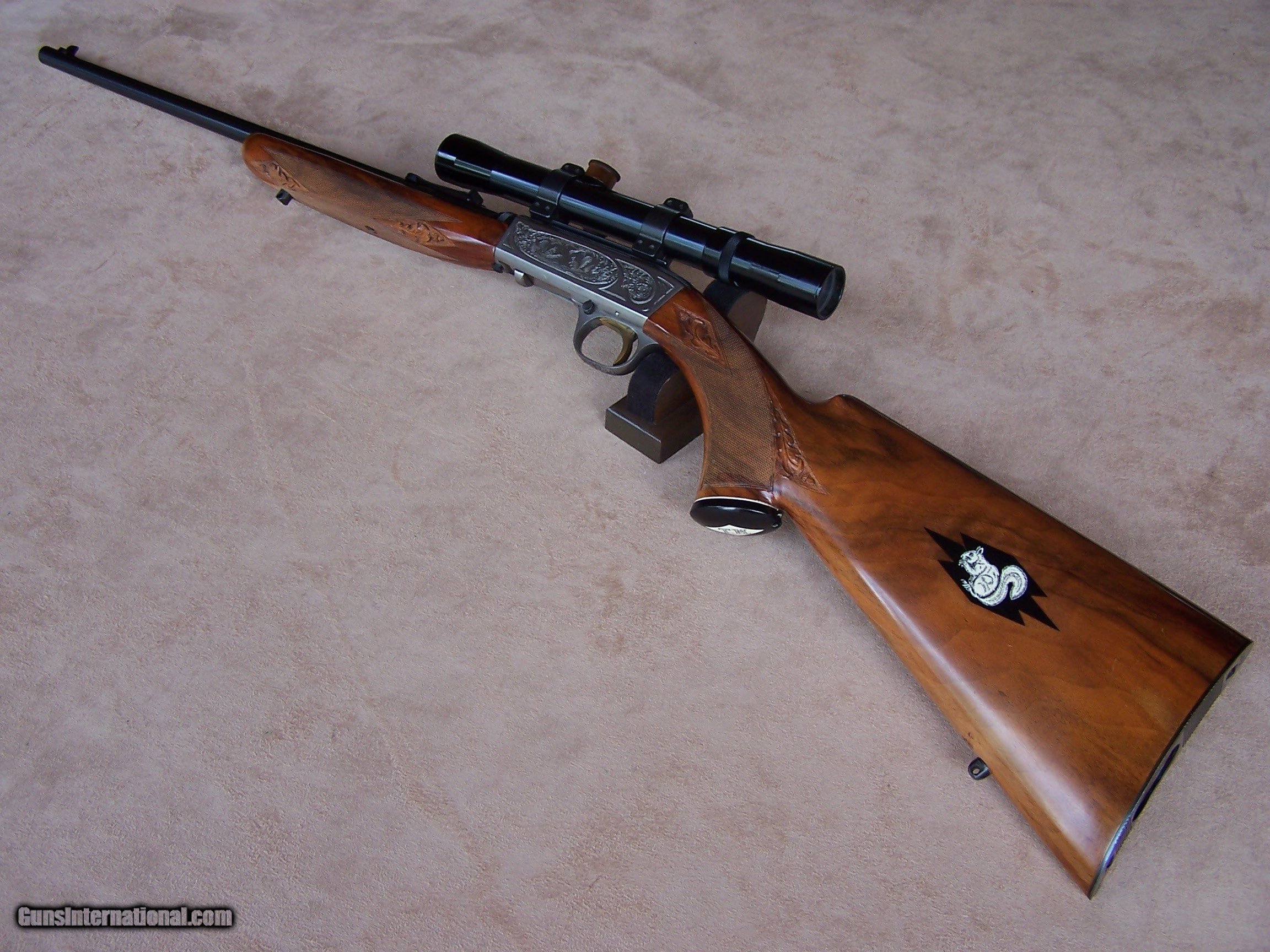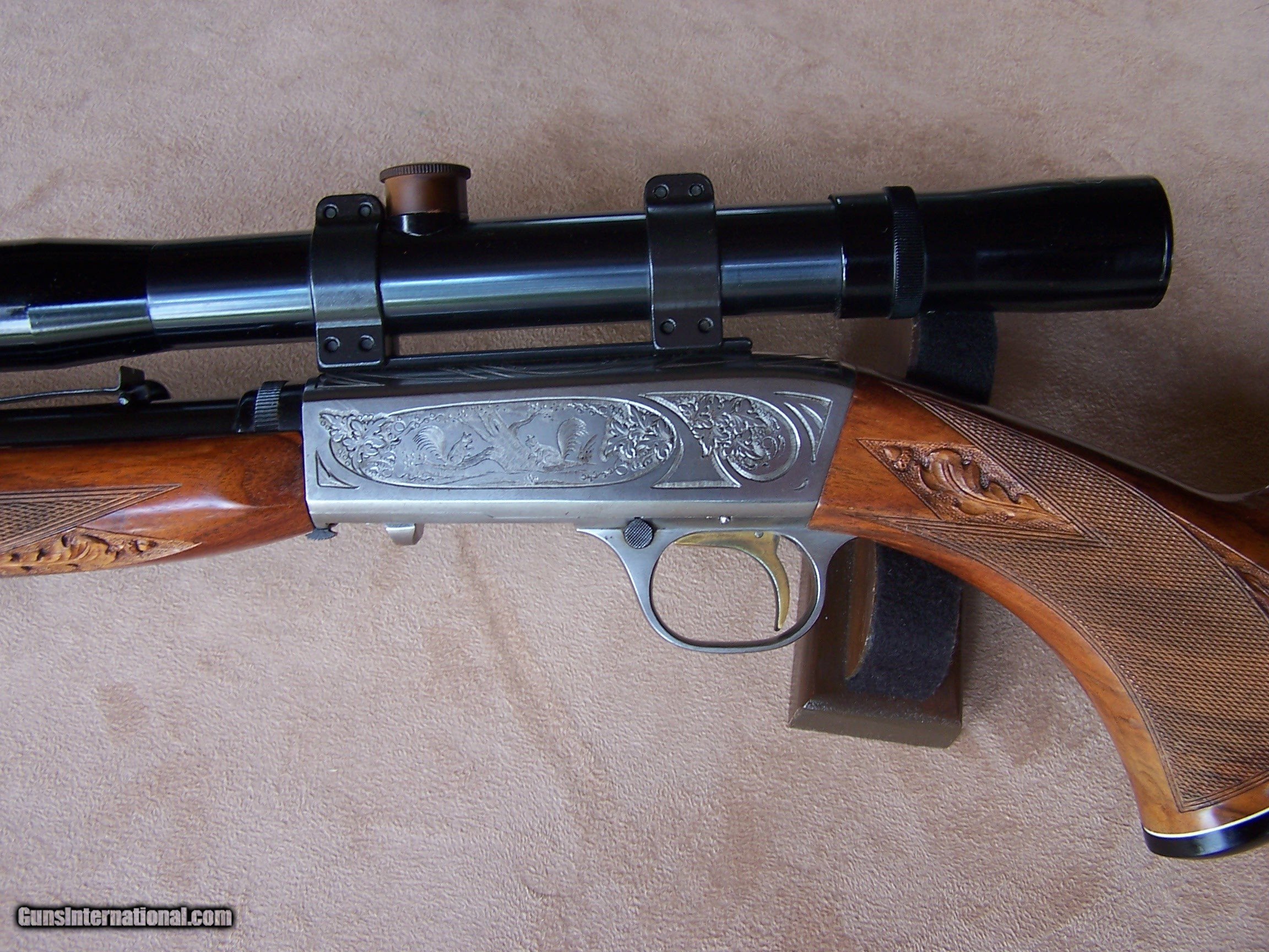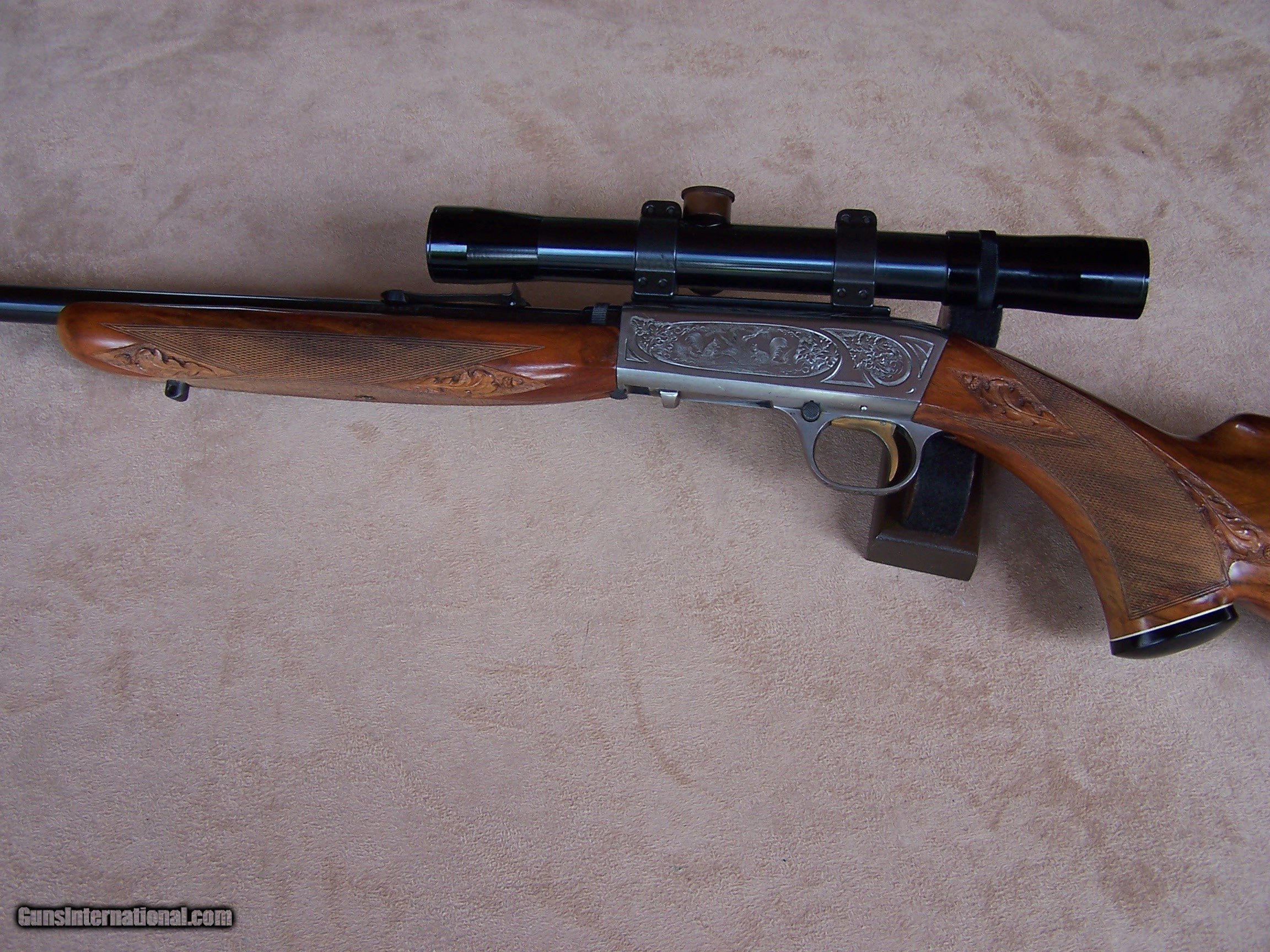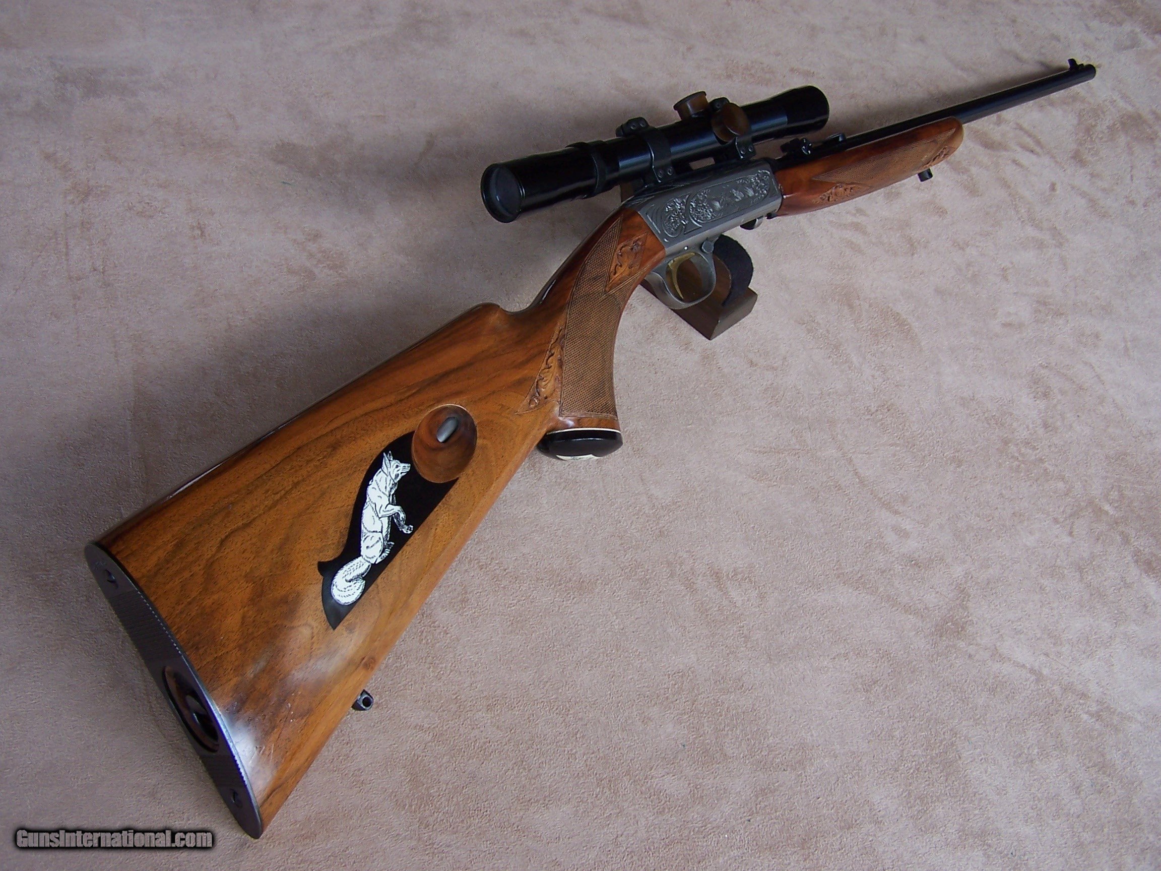 Description: Offered is an early wheel sight Grade II Browning .22 with carved stock and inlays. The stock was carved with oak leaves and acorns and inlays my Nils Hultgren who was famous for doing the inlay work on the Winslow rifles. The receiver has the Browning game scene engraving and coin finish. The gun is equipped with a German Pecar 4X scope. The gun remains in excellent condition and is mechanically perfect. I offer a three-day non-firing inspection period and always want the buyer to be satisfied with their purchase. The gun will be packed correctly and shipped with insurance to your FFL dealer in the continental United States for $55 (California is extra because I have to ship through my local dealer). This gun requires a C&R or FFL license for transfer. I ship the following day after the payment arrives and provide tracking information. Please see my other collectible firearms that I have listed. Thanks for your interest and please let me know if you have any questions. Sold Pending Funds Please Note: A same as cash price Lay-A-Way plan is available on this gun. Please call to discuss. Important Note: If you want to insure buying this and prevent anyone else from getting it ahead of you just Click on the Blue BUY-NOW button to the right of the price below as this closes the . SOLD Curio/Relic: Yes Rifle Caliber: .22 Long Rifle Manufacturer: Browning Model: Semi-Auto Serial Number: T-32913 Barrel Length: 19 1/2 Condition: Excellent Metal Condition: Excellent Wood Condition: Excellent Bore Condition: Excellent Action: Semi-Auto Finish: Blue/Coin Finish Sights: Wheel Sight Manufacture Date: 1958 Engraving: Browning Grade II Game Scene Extras: Carved stock and inlays Item Location: Tennessee |