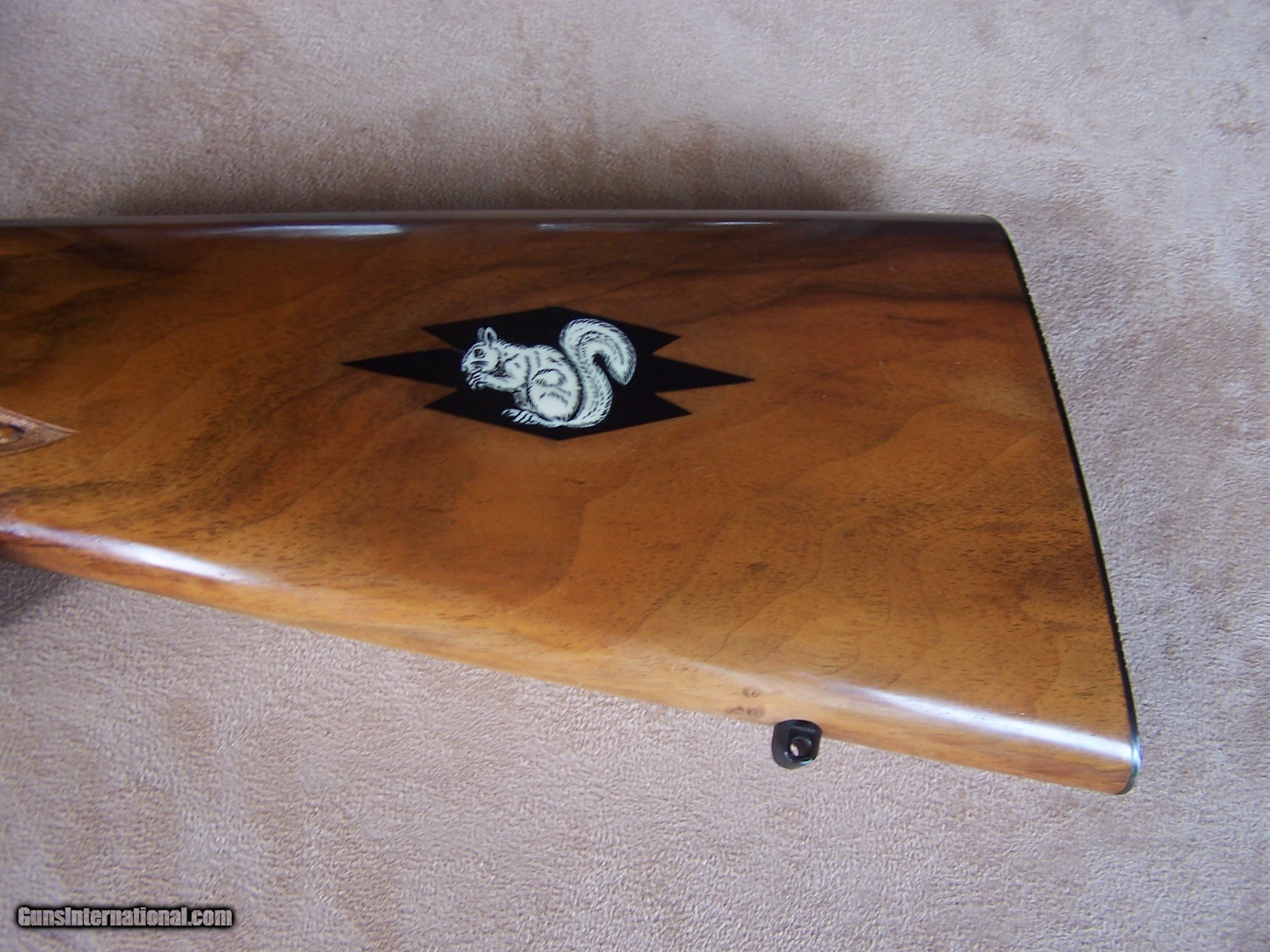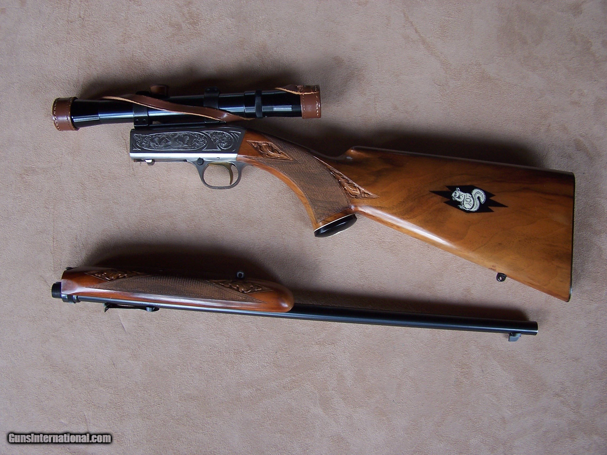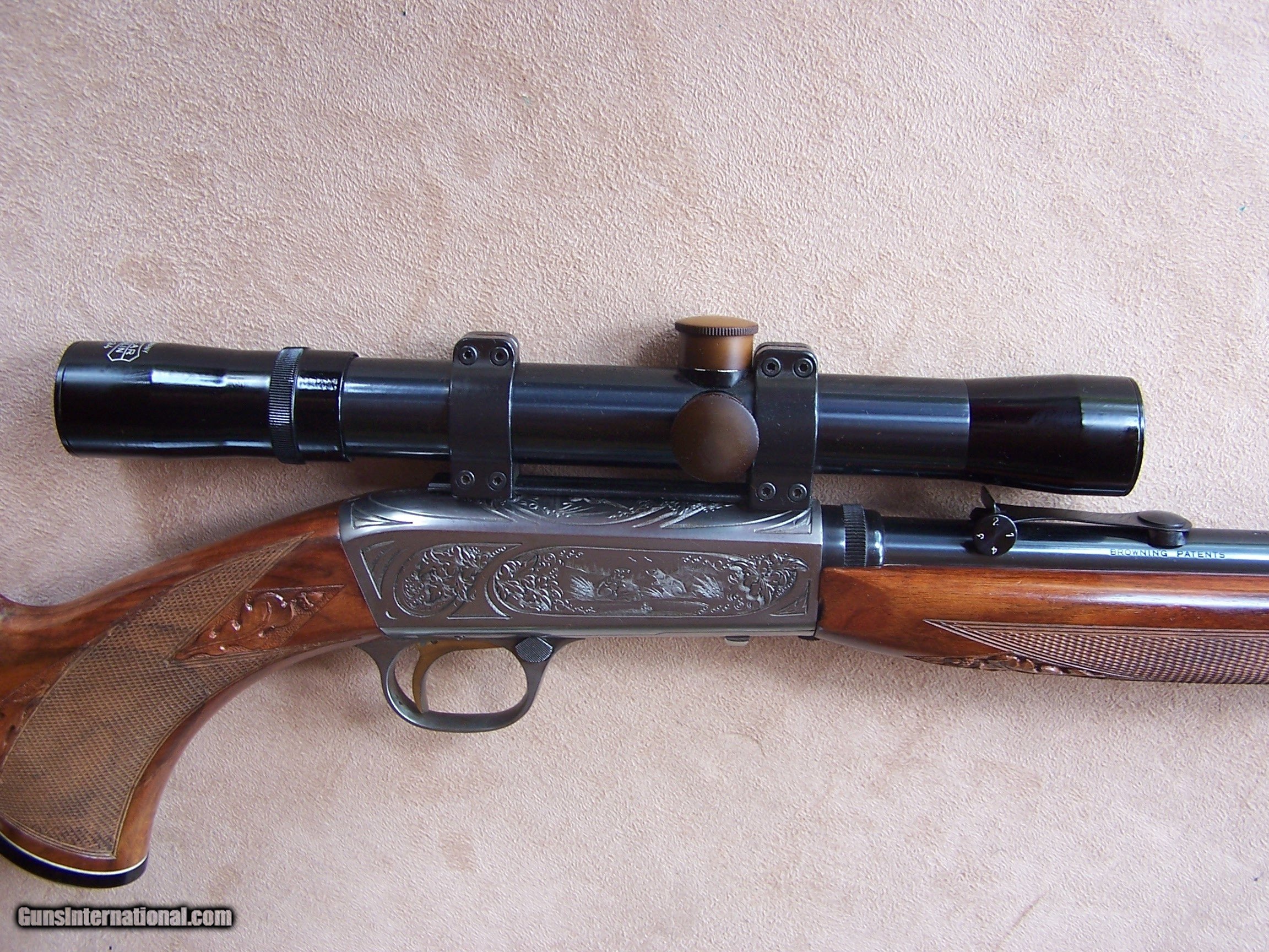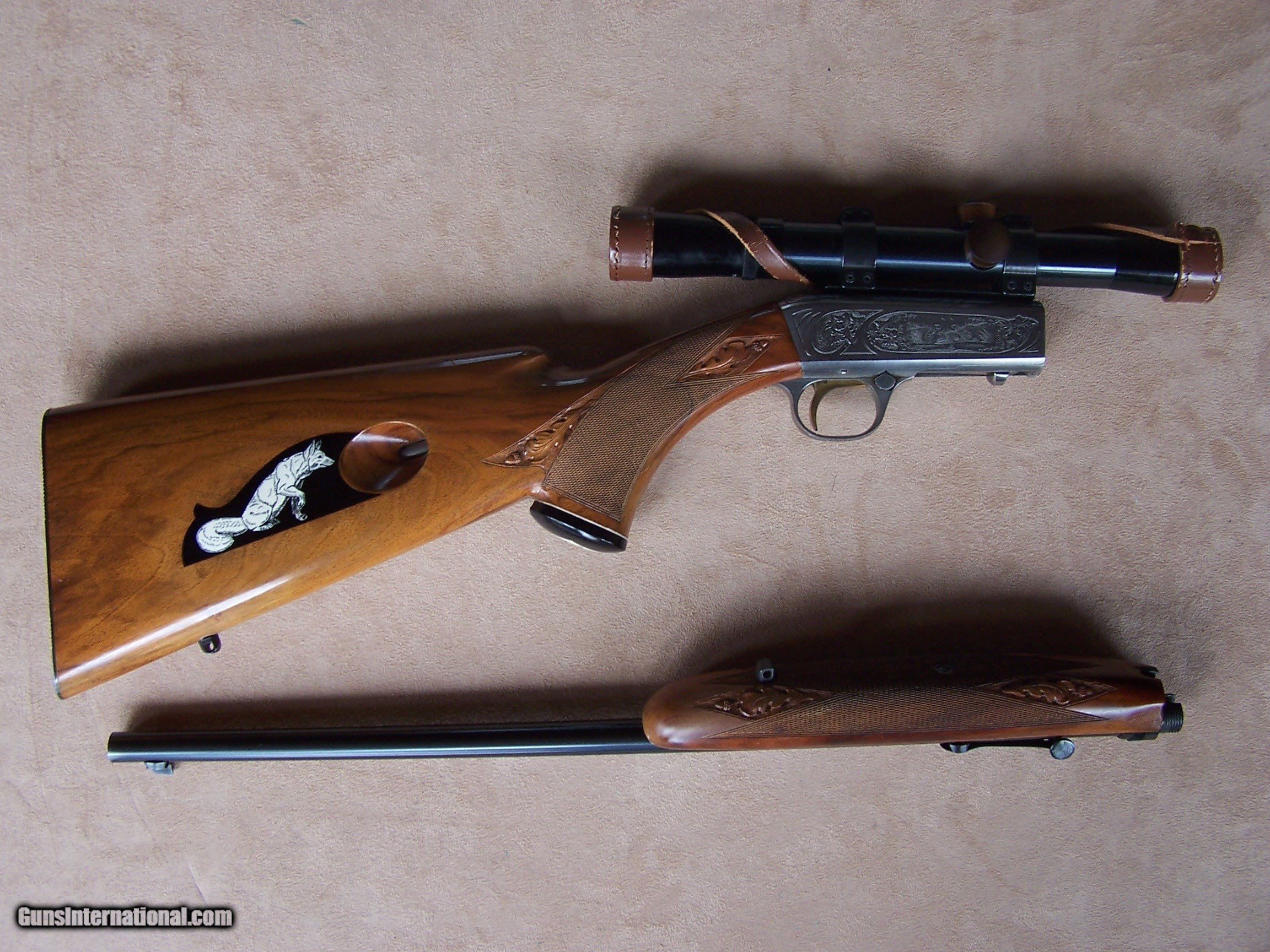Description: Offered is an early wheel sight Grade II Browning .22 with carved stock and inlays. The stock was carved with oak leaves and acorns and inlays my Nils Hultgren who was famous for doing the inlay work on the Winslow rifles. The receiver has the Browning game scene engraving and coin finish. The gun is equipped with a German Pecar 4X scope. The gun remains in excellent condition and is mechanically perfect. I offer a three-day non-firing inspection period and always want the buyer to be satisfied with their purchase. The gun will be packed correctly and shipped with insurance to your FFL dealer in the continental United States for $55 (California is extra because I have to ship through my local dealer). This gun requires a C&R or FFL license for transfer. I ship the following day after the payment arrives and provide tracking information. Please see my other collectible firearms that I have listed. Thanks for your interest and please let me know if you have any questions. Sold Pending Funds Please Note: A same as cash price Lay-A-Way plan is available on this gun. Please call to discuss. Important Note: If you want to insure buying this and prevent anyone else from getting it ahead of you just Click on the Blue BUY-NOW button to the right of the price below as this closes the . SOLD Curio/Relic: Yes Rifle Caliber: .22 Long Rifle Manufacturer: Browning Model: Semi-Auto Serial Number: T-32913 Barrel Length: 19 1/2 Condition: Excellent Metal Condition: Excellent Wood Condition: Excellent Bore Condition: Excellent Action: Semi-Auto Finish: Blue/Coin Finish Sights: Wheel Sight Manufacture Date: 1958 Engraving: Browning Grade II Game Scene Extras: Carved stock and inlays Item Location: Tennessee |