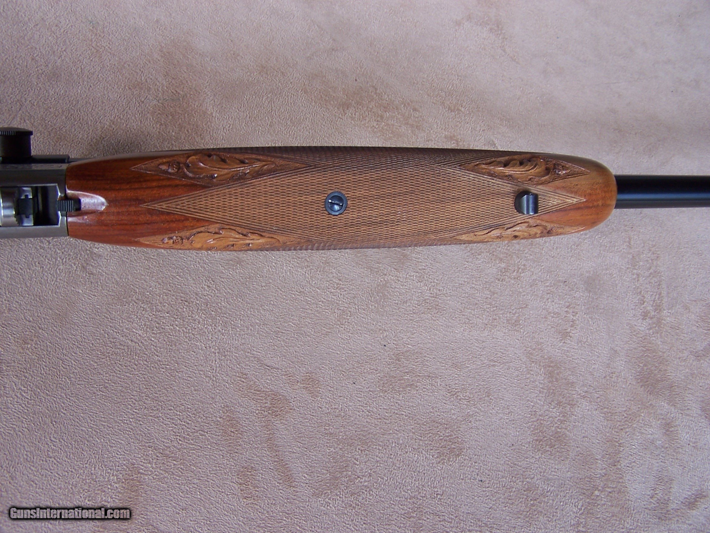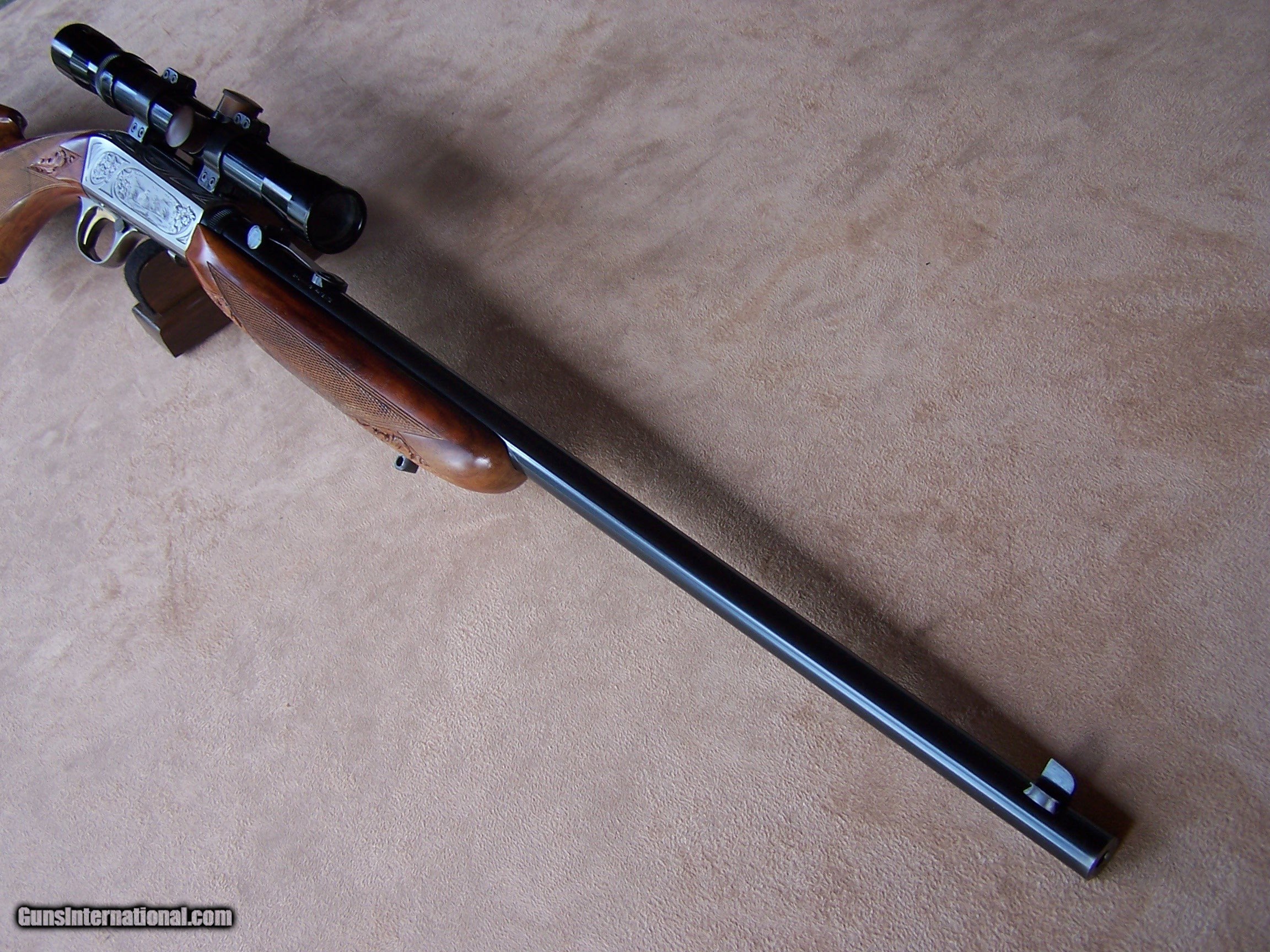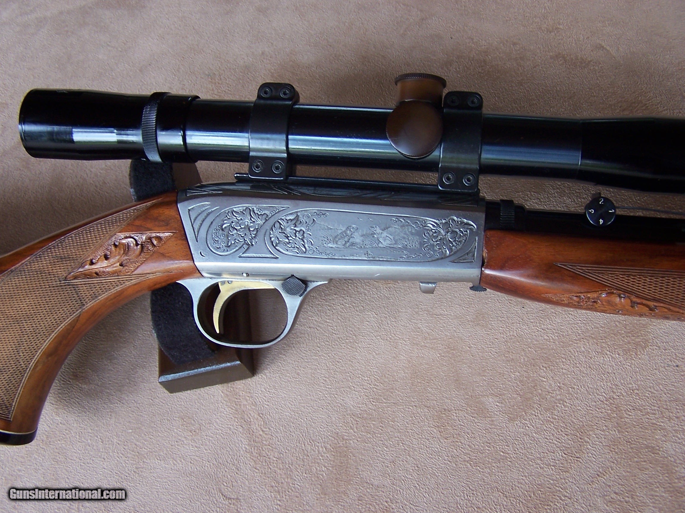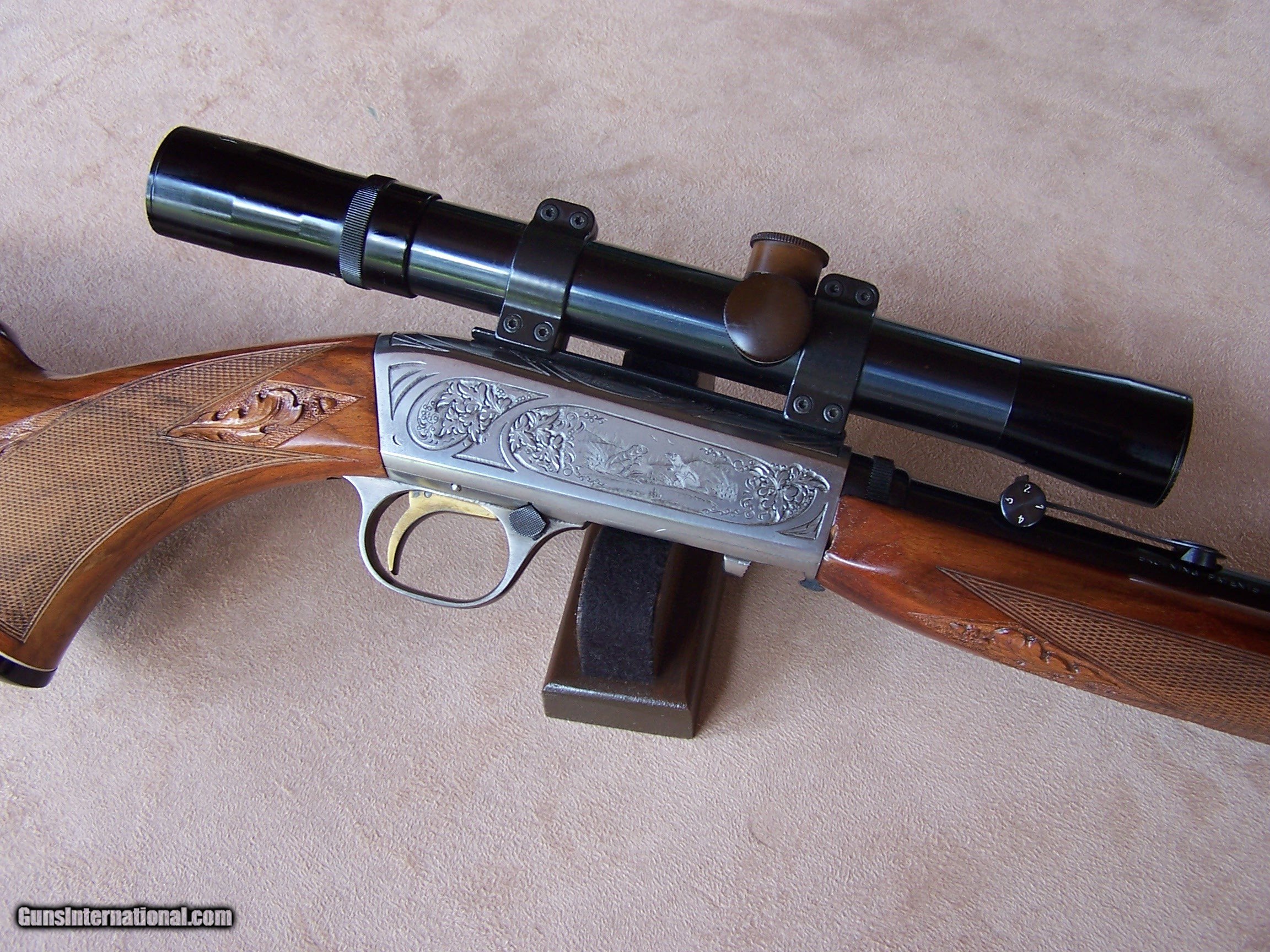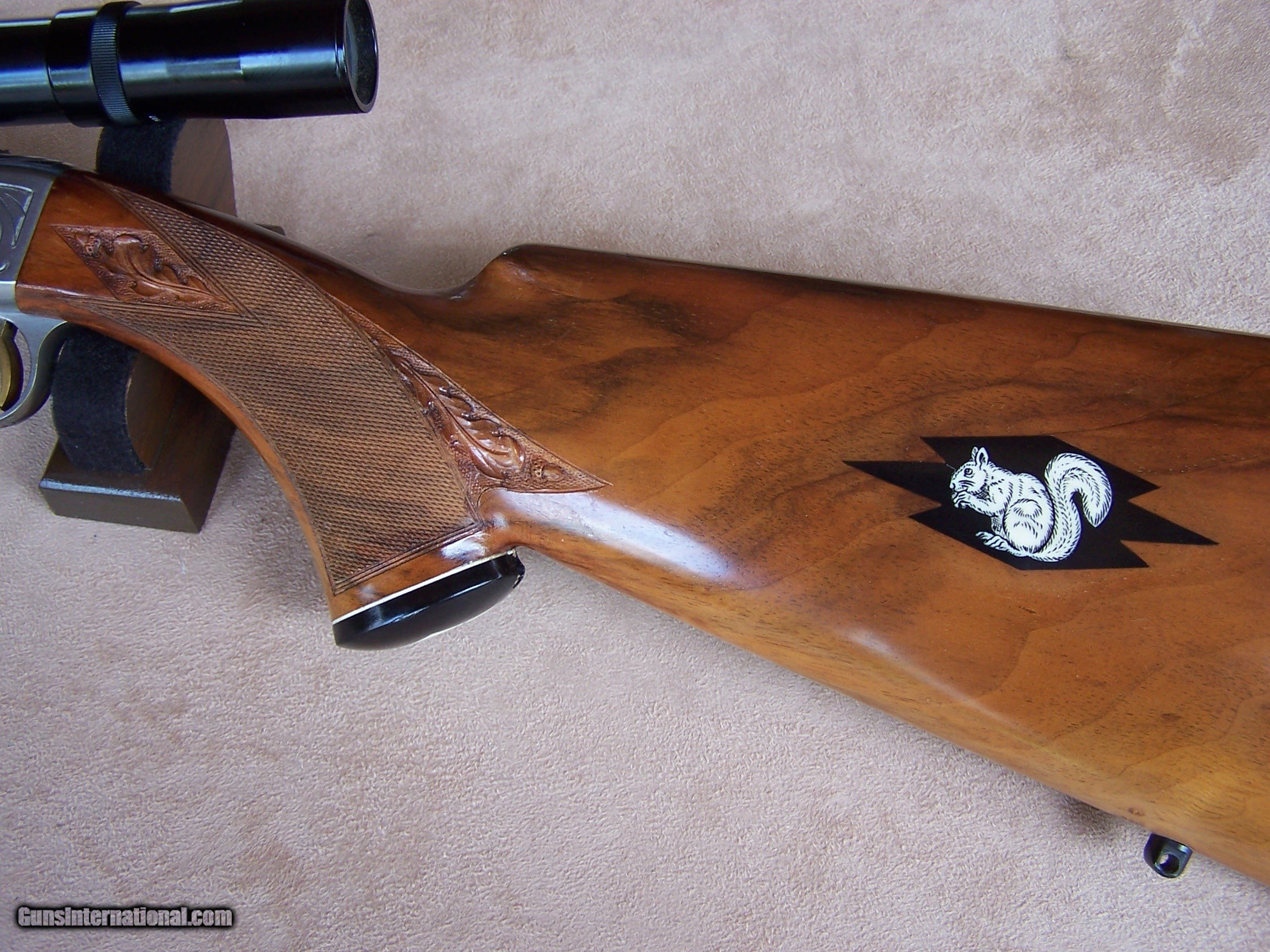 Description: Offered is an early wheel sight Grade II Browning .22 with carved stock and inlays. The stock was carved with oak leaves and acorns and inlays my Nils Hultgren who was famous for doing the inlay work on the Winslow rifles. The receiver has the Browning game scene engraving and coin finish. The gun is equipped with a German Pecar 4X scope. The gun remains in excellent condition and is mechanically perfect. I offer a three-day non-firing inspection period and always want the buyer to be satisfied with their purchase. The gun will be packed correctly and shipped with insurance to your FFL dealer in the continental United States for $55 (California is extra because I have to ship through my local dealer). This gun requires a C&R or FFL license for transfer. I ship the following day after the payment arrives and provide tracking information. Please see my other collectible firearms that I have listed. Thanks for your interest and please let me know if you have any questions. Sold Pending Funds Please Note: A same as cash price Lay-A-Way plan is available on this gun. Please call to discuss. Important Note: If you want to insure buying this and prevent anyone else from getting it ahead of you just Click on the Blue BUY-NOW button to the right of the price below as this closes the . SOLD Curio/Relic: Yes Rifle Caliber: .22 Long Rifle Manufacturer: Browning Model: Semi-Auto Serial Number: T-32913 Barrel Length: 19 1/2 Condition: Excellent Metal Condition: Excellent Wood Condition: Excellent Bore Condition: Excellent Action: Semi-Auto Finish: Blue/Coin Finish Sights: Wheel Sight Manufacture Date: 1958 Engraving: Browning Grade II Game Scene Extras: Carved stock and inlays Item Location: Tennessee |