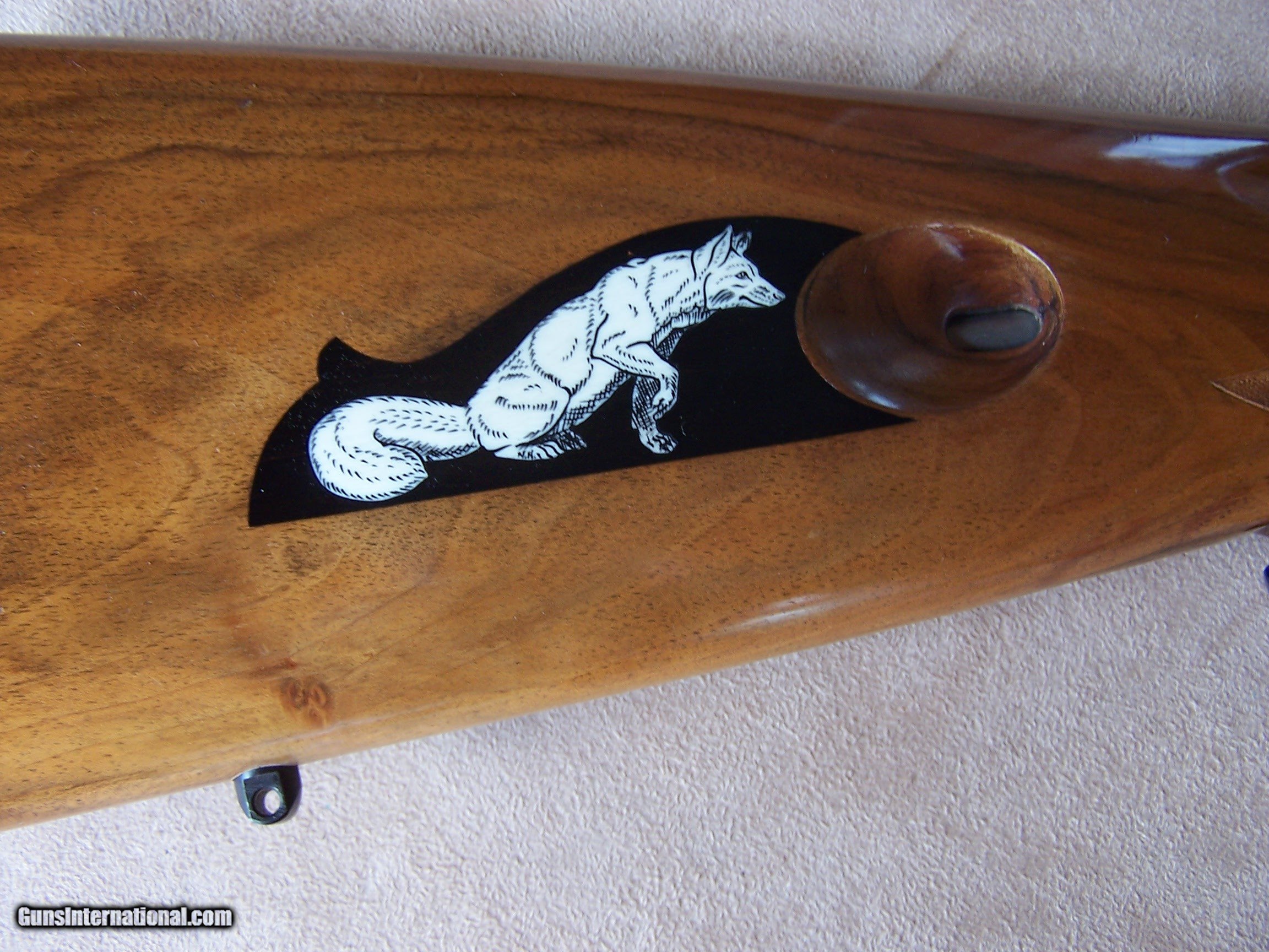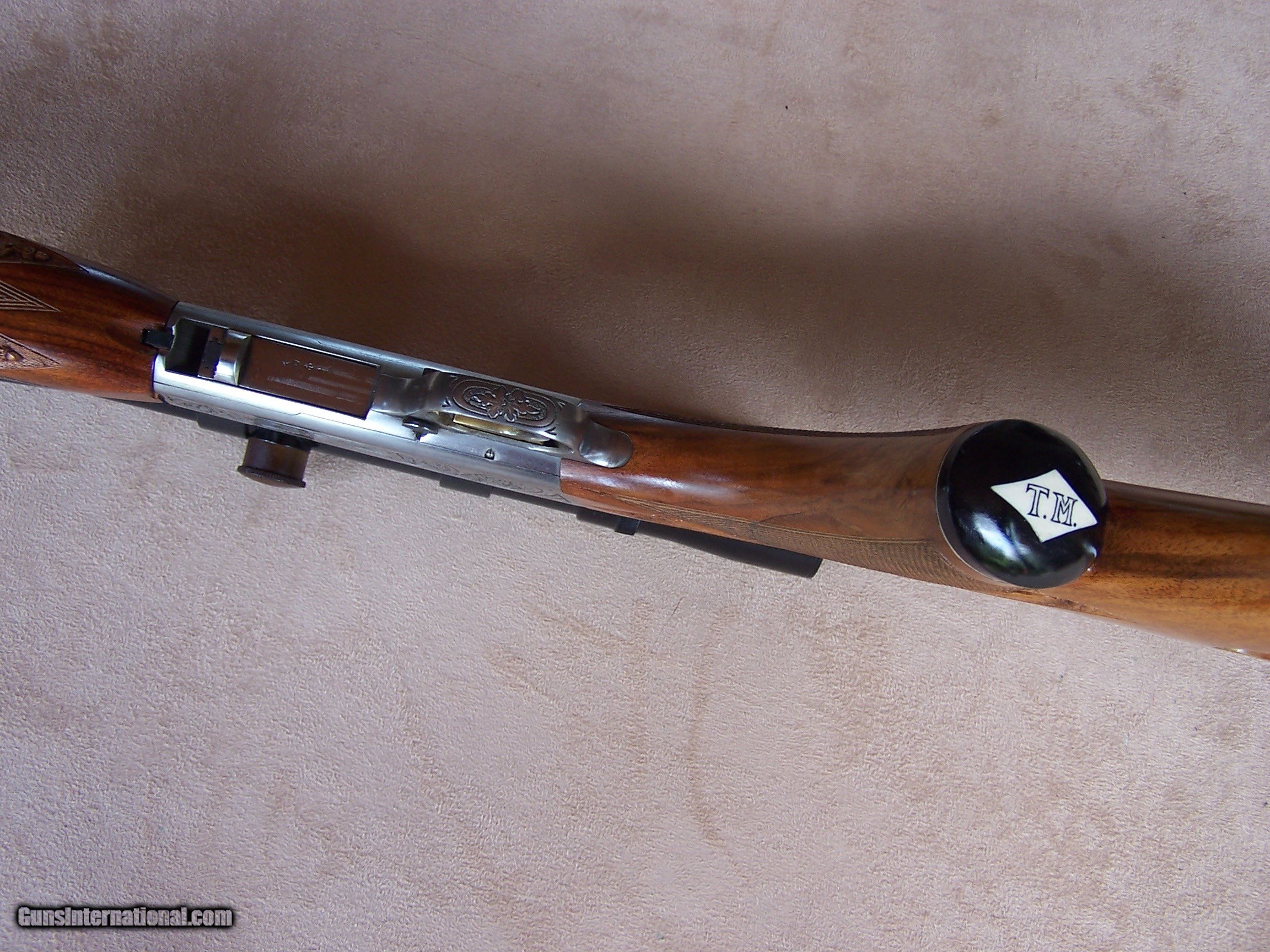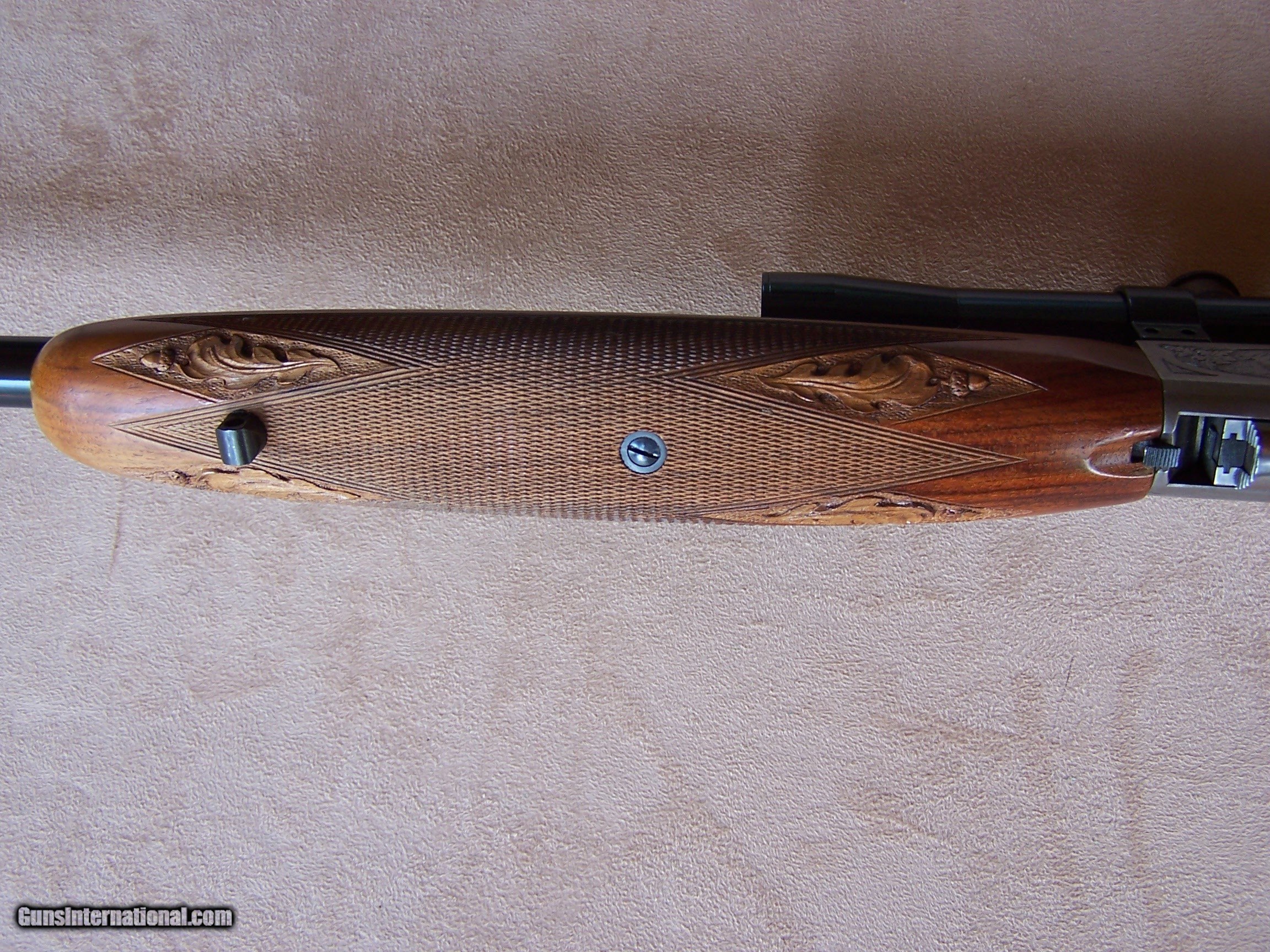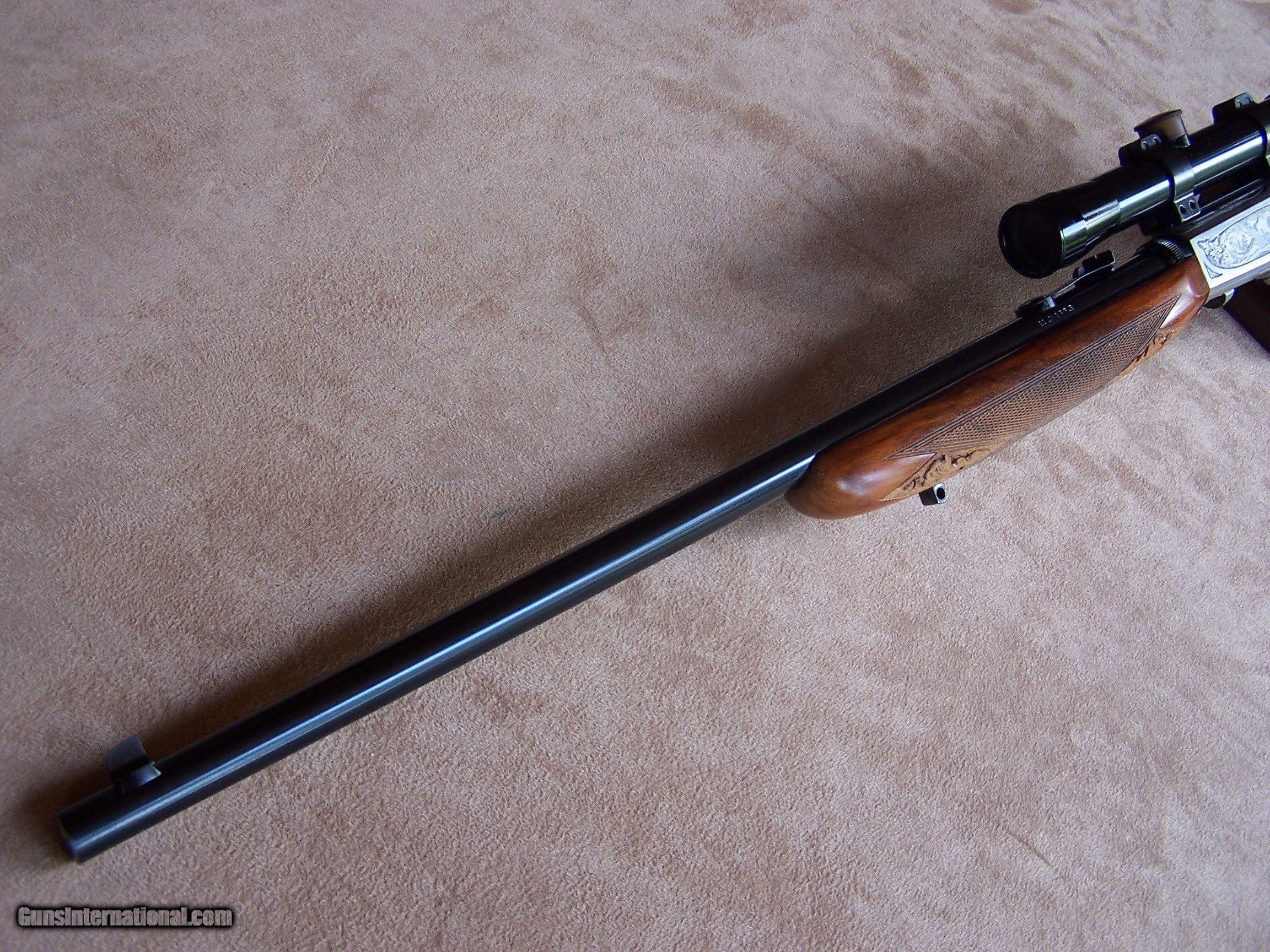 Description: Offered is an early wheel sight Grade II Browning .22 with carved stock and inlays. The stock was carved with oak leaves and acorns and inlays my Nils Hultgren who was famous for doing the inlay work on the Winslow rifles. The receiver has the Browning game scene engraving and coin finish. The gun is equipped with a German Pecar 4X scope. The gun remains in excellent condition and is mechanically perfect. I offer a three-day non-firing inspection period and always want the buyer to be satisfied with their purchase. The gun will be packed correctly and shipped with insurance to your FFL dealer in the continental United States for $55 (California is extra because I have to ship through my local dealer). This gun requires a C&R or FFL license for transfer. I ship the following day after the payment arrives and provide tracking information. Please see my other collectible firearms that I have listed. Thanks for your interest and please let me know if you have any questions. Sold Pending Funds Please Note: A same as cash price Lay-A-Way plan is available on this gun. Please call to discuss. Important Note: If you want to insure buying this and prevent anyone else from getting it ahead of you just Click on the Blue BUY-NOW button to the right of the price below as this closes the . SOLD Curio/Relic: Yes Rifle Caliber: .22 Long Rifle Manufacturer: Browning Model: Semi-Auto Serial Number: T-32913 Barrel Length: 19 1/2 Condition: Excellent Metal Condition: Excellent Wood Condition: Excellent Bore Condition: Excellent Action: Semi-Auto Finish: Blue/Coin Finish Sights: Wheel Sight Manufacture Date: 1958 Engraving: Browning Grade II Game Scene Extras: Carved stock and inlays Item Location: Tennessee |