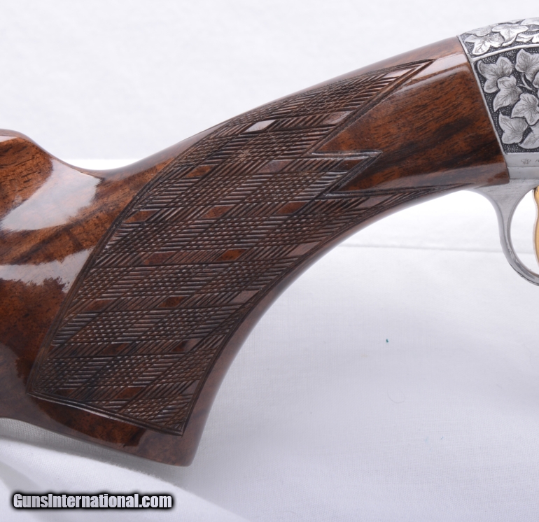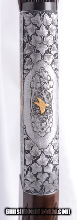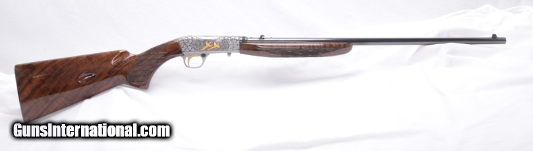 Description: Browning Auto 22, .22 short. Masterfully engraved by Angelo Bee in a game scene motif that is somewhat unusual for a .22! Instead of rabbits and squirrels this beautiful little rifle has magnificent gold inlays of mallards on the left, pheasants on the right and quail on the top; all surrounded by spectacular deep floral engraving and a coin finish. Stocked in highly figured walnut and checkered in the High Grade Browning style. Beautiful. SOLD |
