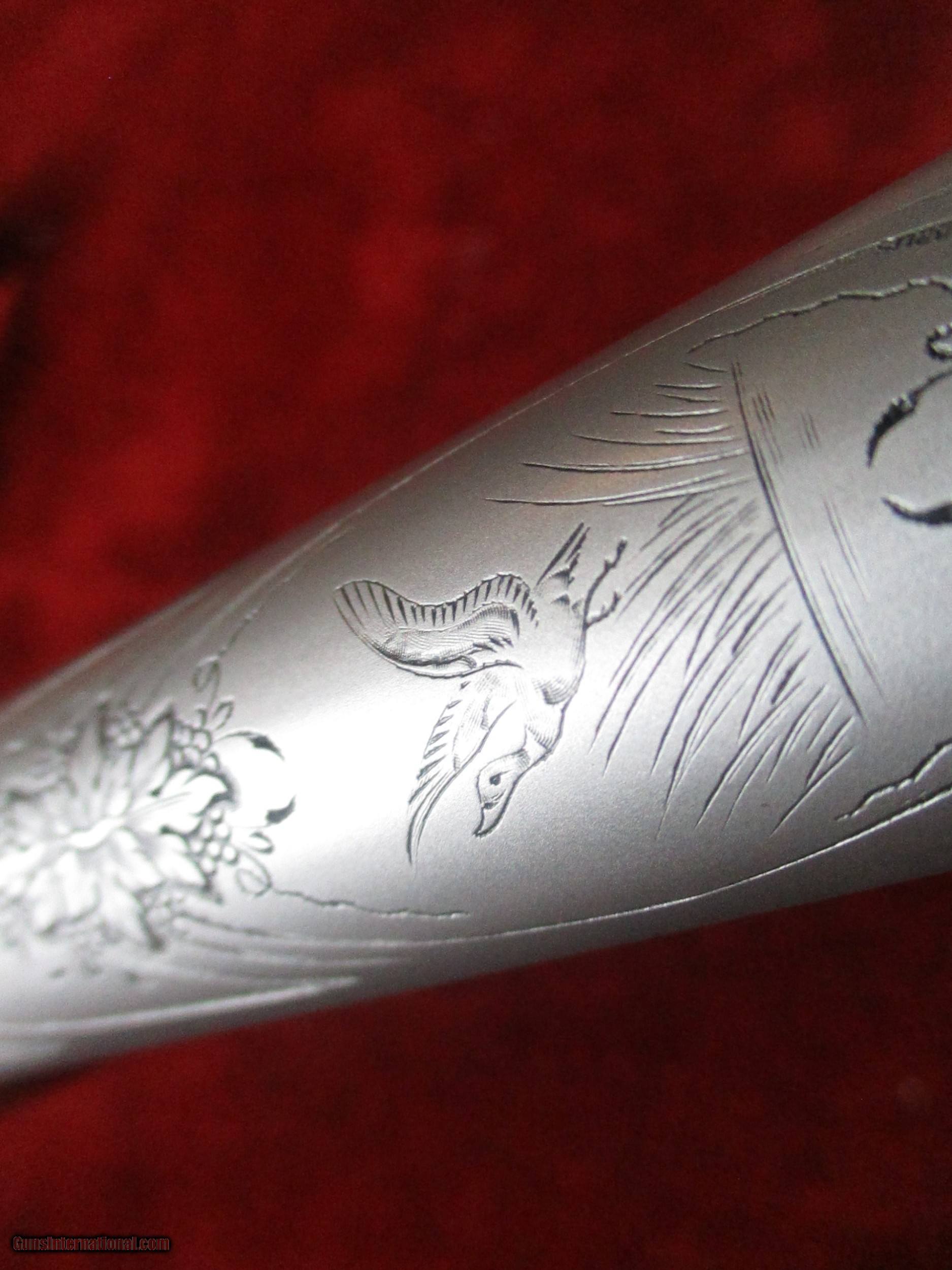 Description: Browning Custom Shop engraver, (1971) 19 1/4" bbl., checkered knockout Turkish walnut stock & forearm, squirrels, groundhogs & duck all bordered by acorns & oakleaves, 99% overall also fitted base & 1" rings no box; however, manual, base & 1" rings, soft field carry case,: SOLD |