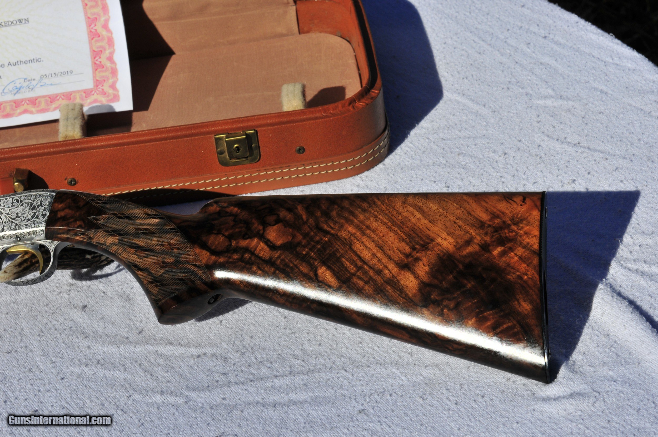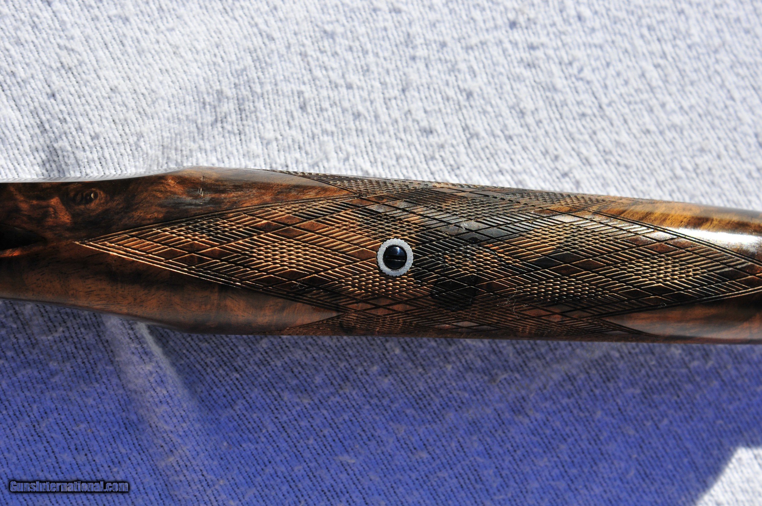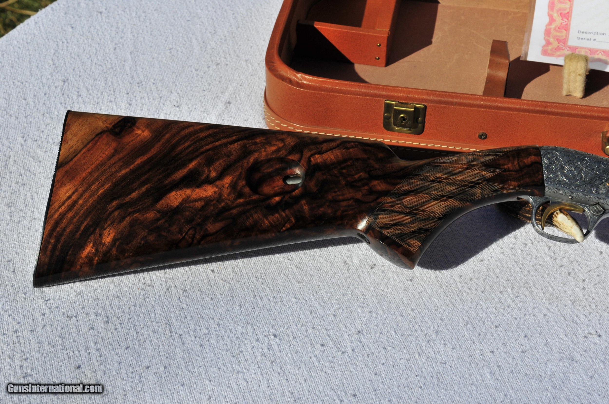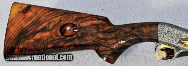Description: Browning Belgium .22 short wheel sight takedown. Very Hard To Find. Beautiful upgrade engraving scene's with Retriever and Pheasant on the left side, Retriever and Duck on the right side, Retriever with Duck on top. Vine type foliate covers the rest of the receiver trigger guard, the lock ring and adjusting ring. Engravers signature "ABee" signature on both sides of receiver. Belgium XXXX Fancy custom stock an forearm in Exhibition grade walnut with extensive marbling with dark streaking- with pistol grip screw attachment, as originally done in the 1950's. Also included- Angelo Bee Certificate of Authenticity, Browning Hartmann luggage case is near mint. Rifle has NOT be fired since upgrade and is in Excellent Condition. Payment within 5 business days, certified funds preferred. Price includes shipping. Pictures don't do justice to the wood. The Wood is Fantastice color and stripping. **Serious offers considered.** ***Price Drop*** $6,600.00 *please see other ads. SOLD Manufacturer: FN Browning Model: .22 semi-auto take down Serial Number: A4680 Caliber Info: .22 short Condition: 98+ Finish: Mint |