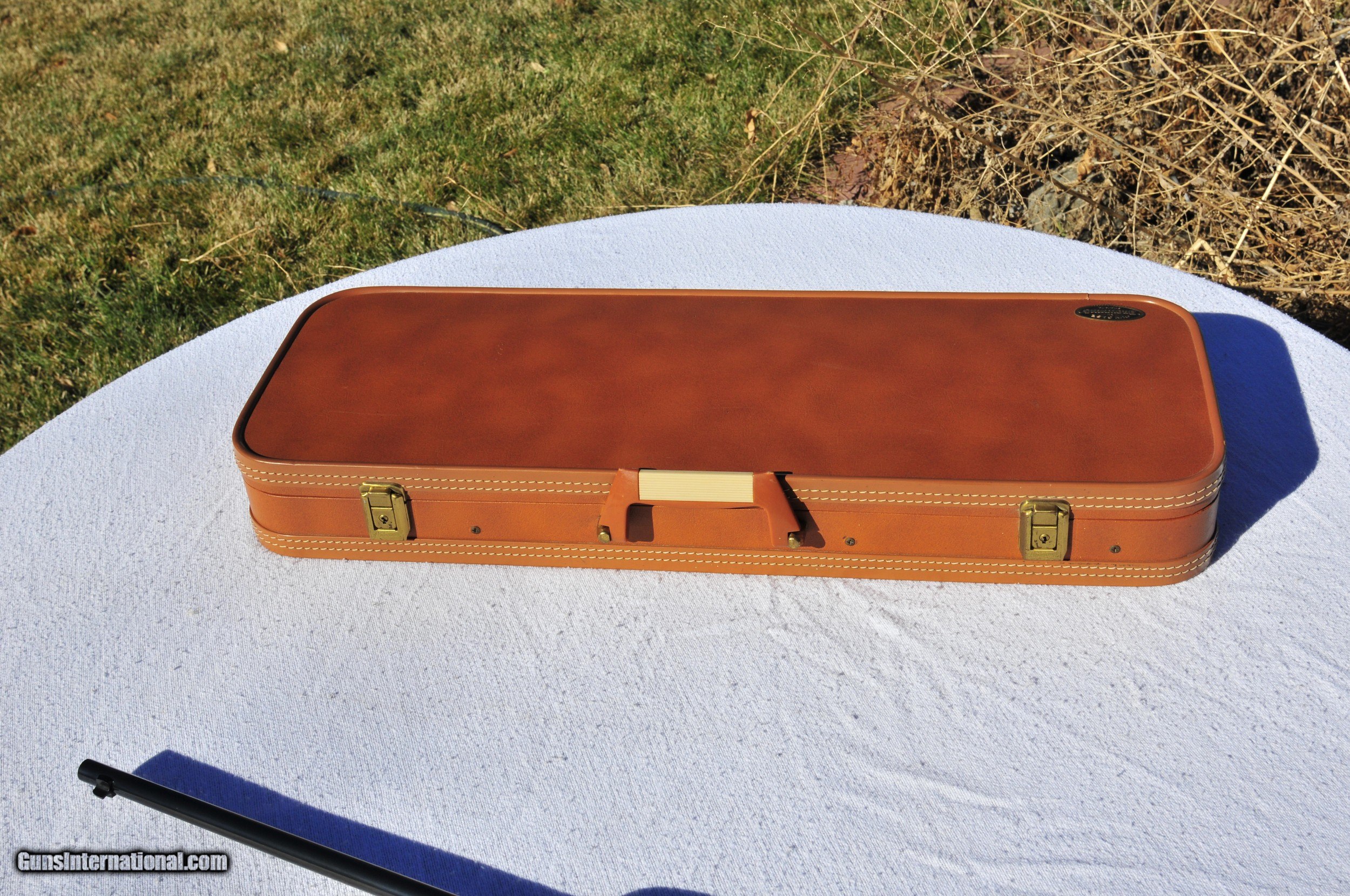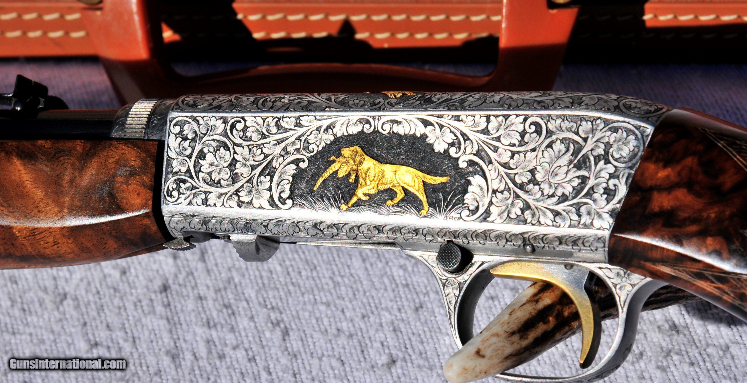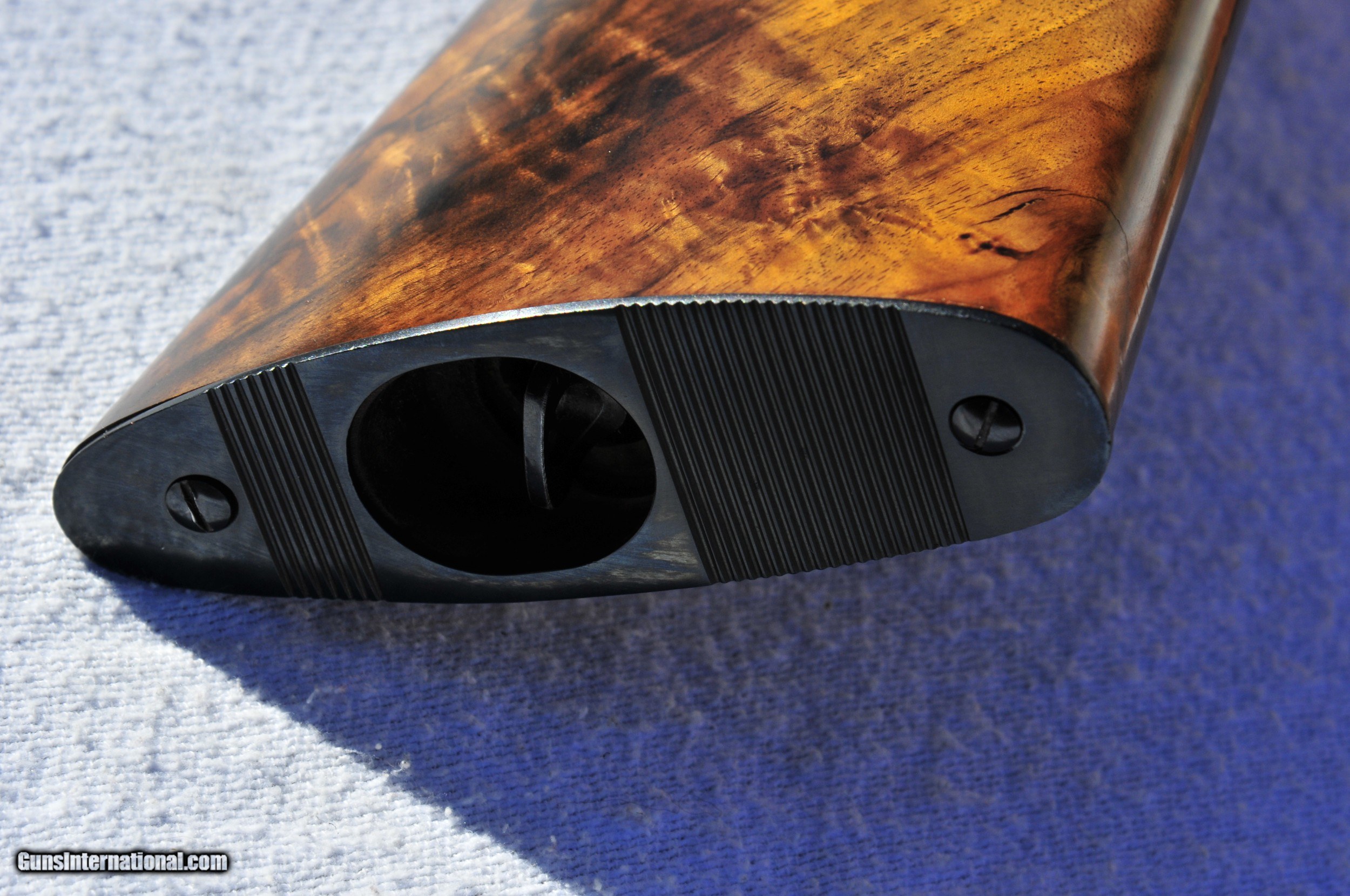 Description: Browning Belgium .22 short wheel sight takedown. Very Hard To Find. Beautiful upgrade engraving scene's with Retriever and Pheasant on the left side, Retriever and Duck on the right side, Retriever with Duck on top. Vine type foliate covers the rest of the receiver trigger guard, the lock ring and adjusting ring. Engravers signature "ABee" signature on both sides of receiver. Belgium XXXX Fancy custom stock an forearm in Exhibition grade walnut with extensive marbling with dark streaking- with pistol grip screw attachment, as originally done in the 1950's. Also included- Angelo Bee Certificate of Authenticity, Browning Hartmann luggage case is near mint. Rifle has NOT be fired since upgrade and is in Excellent Condition. Payment within 5 business days, certified funds preferred. Price includes shipping. Pictures don't do justice to the wood. The Wood is Fantastice color and stripping. **Serious offers considered.** ***Price Drop*** $6,600.00 *please see other ads. SOLD Manufacturer: FN Browning Model: .22 semi-auto take down Serial Number: A4680 Caliber Info: .22 short Condition: 98+ Finish: Mint |