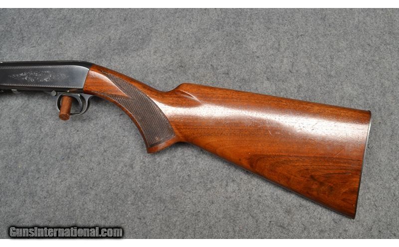 Description: This 1956 or 1957 classic rimfire takedown rifle is a Browning (Belgium) Auto Rifle chambered in .22 Long Rifle. It has the highly desirable adjustable wheel rear sight, a fixed blade front sight, checkered pistol grip stock, side-of-stock loading port, lightly engraved blue steel receiver, semi-beavertail fore arm, button-operated safety in front of trigger guard, and has a bottom port for downward ejection of spent casings. It is in good condition with some noticeable loss of bluing at the muzzle. It has some observable handling marks to the furniture. .22 Long Rifle SOLD Metal Condition: Bluing in very good condition with some noticeable wear at the muzzle Wood Condition: Some observable handling wear to the furniture Bore Condition: Bore is bright and shiny with rifling intact Barrels: 19¼ inch barrel Triggers: Blued Stock Dimensions: 13¾ inch LOP Fore End: Checkered wood semi beavertail fore end Butt Pad: Steel butt plate with matching serial number Weight: 4 lb. 12 oz. Sights: "Fixed front sight, wheel-adjustable rear sight Item Location: Wichita, KS |