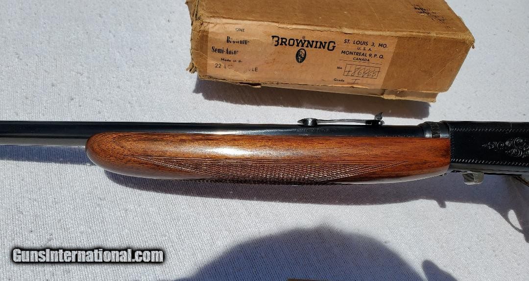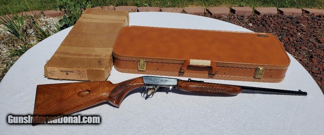 Description: **Browning Hartmann Case " is available to be included. Browning Belgium NIB 22 LR 1960 Wheel Sight 98% condition time capsule, just a few really minor marks, includes Factory Manual and Envelope. Gorgeous wood finish and condition. Blueing is excellent as is bore-shiny bright with strong rifling. Grooved receiver for scope, included MINT NIB J4 Scope and mounts as offered by Browning Factory for the wheel sight rifles-before Redfield or Browning scopes were offered-as seen in the Homer Tyler Book. Serial number on Rifle and Box match. Please see pics for condition. Price is $2200.00 includes free shipping to your FFL. These Rarely pop up for sale..get it before it's Gone! Payment within 5 business days. Bank Draft or Bank Check...unless we have done business before.** Serious Offers Considered** **Mint Hartman Case is NOT included, but can be added for an additional $250.00.** with case $2550.00 shipped. With case includes, case, 1 key, Browning Registration card, and case warranty card. SOLD Rifle Caliber: .22 Long Rifle Manufacturer: Browning Model: .22 semi-auto take down Serial Number: T86xxx Barrel Length: 19 3/4 Caliber Info: 22 LR Bore: EXCELLENT !! Condition: EXCELLENT !! Metal Condition: EXCELLENT Bore Condition: EXCELLENT Action: Semi Auto Butt Pad: Steel Weight: 5lbs |