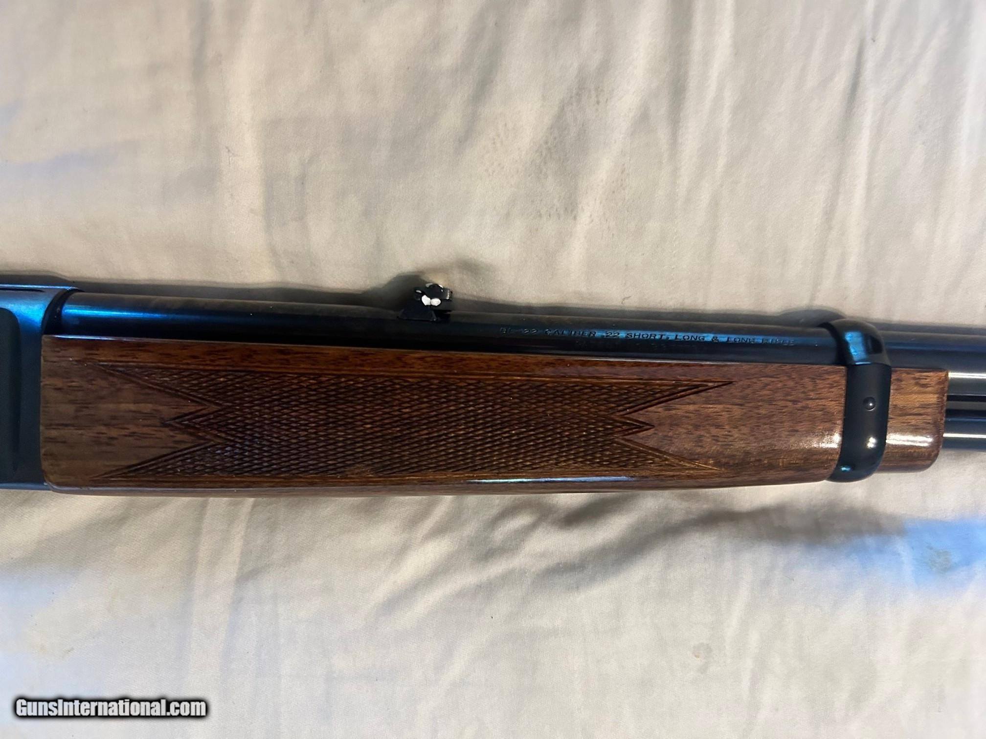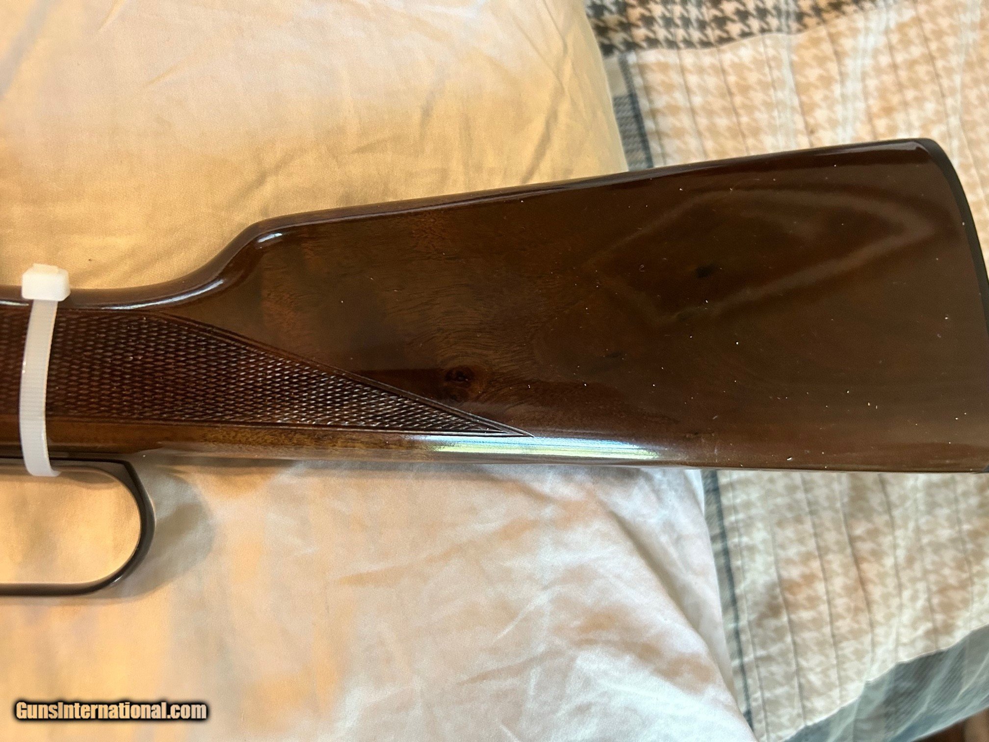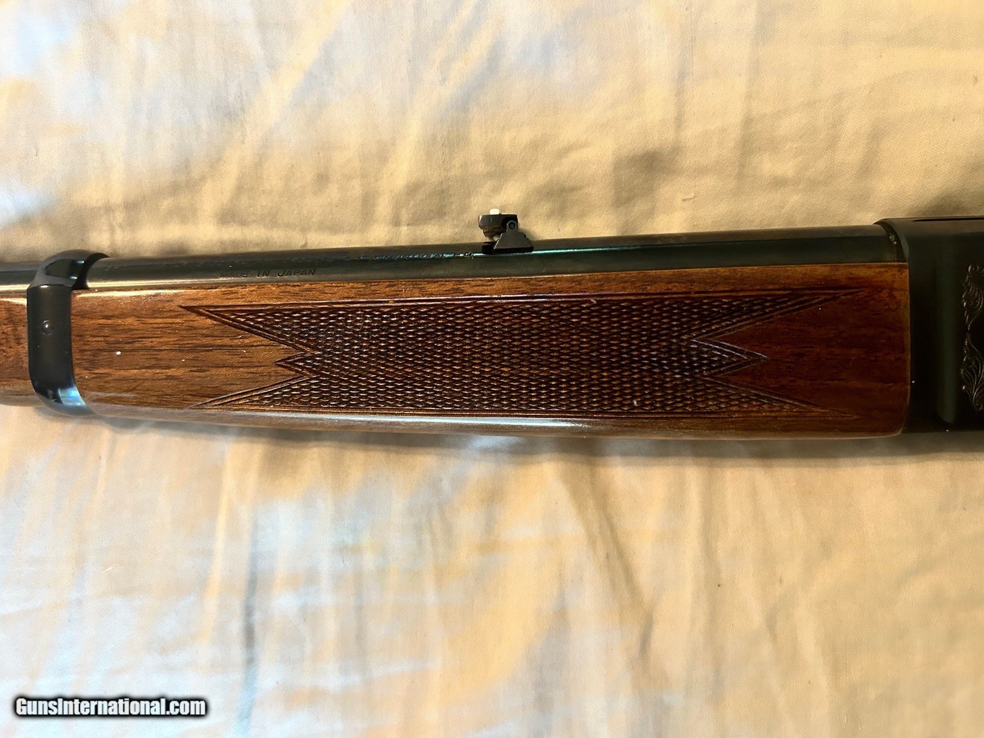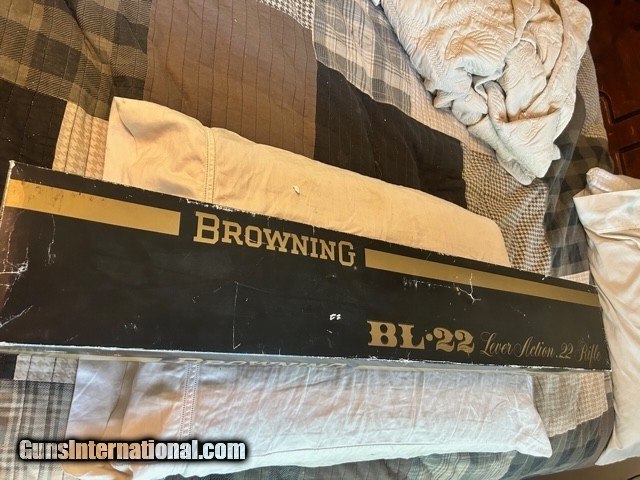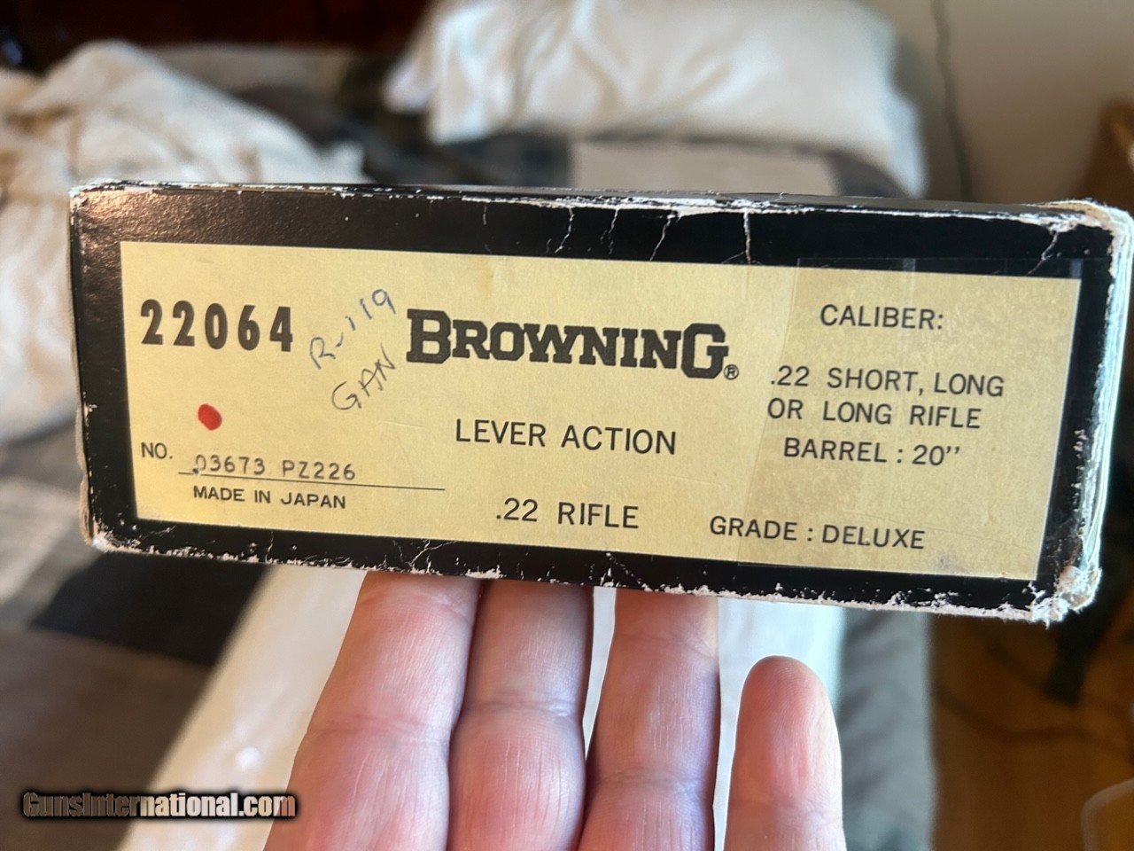Description: This is a 1981 Japan-made BL-22 Deluxe gun still in the original box. Looks to be never fired. Overview Take a step up to Deluxe. The BL-22 is something that is often found on a wish list. You may ask why. Simply because it is the premier lever action 22 of all time. It gained this distinction for several reasons. Superb quality, solid function, and the speed of a 33-degree lever throw. The scroll engraved receiver, checkered walnut stock and the added touch of a classic Browning gold-colored trigger also set it apart. There are other lever-action 22 rimfire rifles available, but no other has the features, reliability, quality, and accuracy of the BL-22. All the features, fast. Speaking of fast and features, the highlight of the Grade I BL-22 is the short 33° lever throw that makes cycling faster and easier for shooters. The easy-to-load tubular magazine holds any combination of 22 short, long, and long rifle ammunition, all of which are on the menu for the BL-22. The magazine tube -- once loaded -- locks securely in place. The BL-22 features quality muzzle-to-butt that rivals other Browning firearms. Steel receiver, very nice. From the machined steel receiver to the fit of the finely finished wood, these superb rifles are Browning's through and through. Bring one along the next time you head into the field on a varmint hunt or just roll a few tin cans. BL-22 Deluxe Features