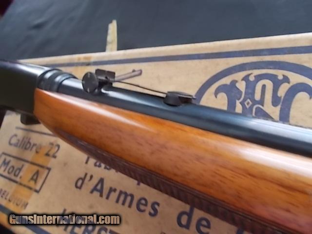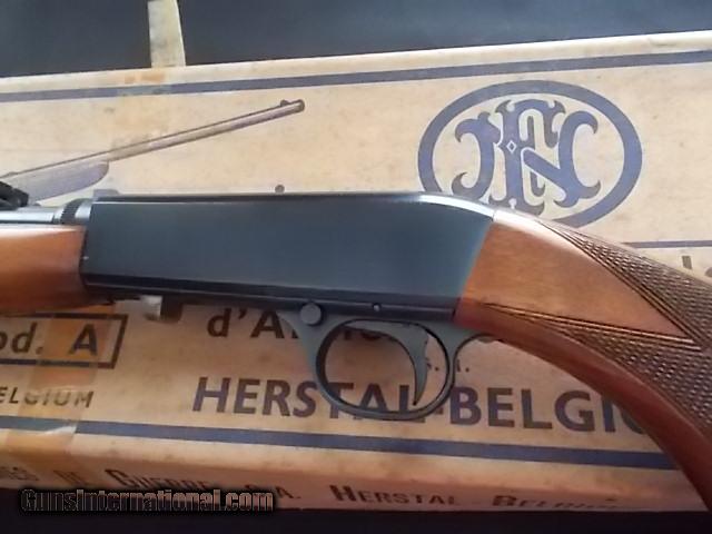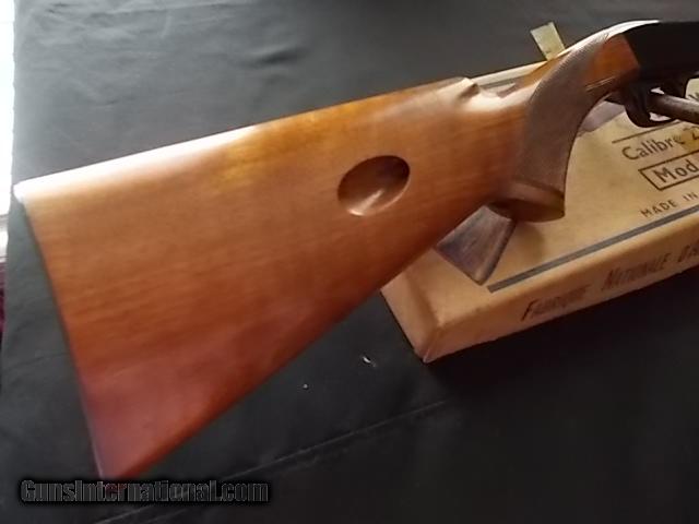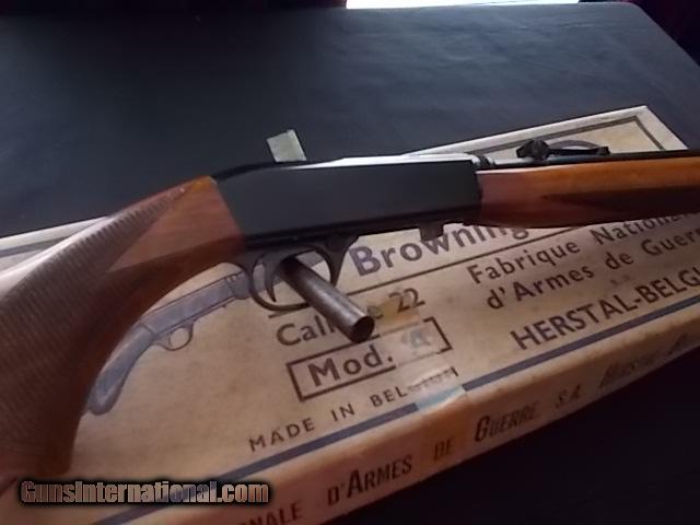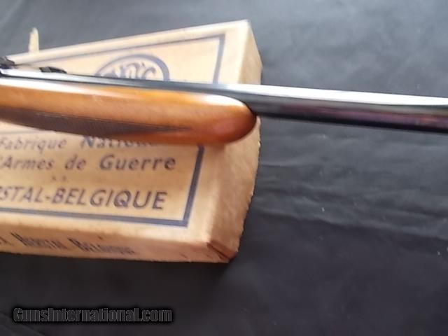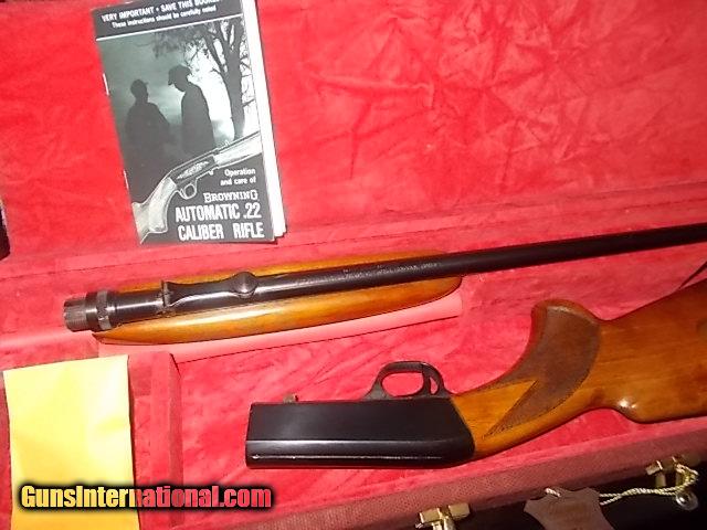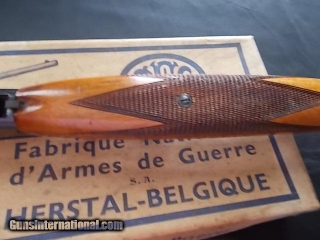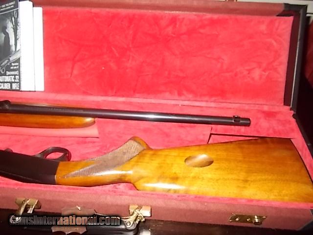 Description: s# 645xx (1959), 22 auto, 19" bbl., blade front, Wheel rear sight, nice clear sharp checkering on exotic Belgium blond/wine colored stock, steel butt, 99% blue some minor handling, manual, Brady style takedown hard case , so only: SOLD |