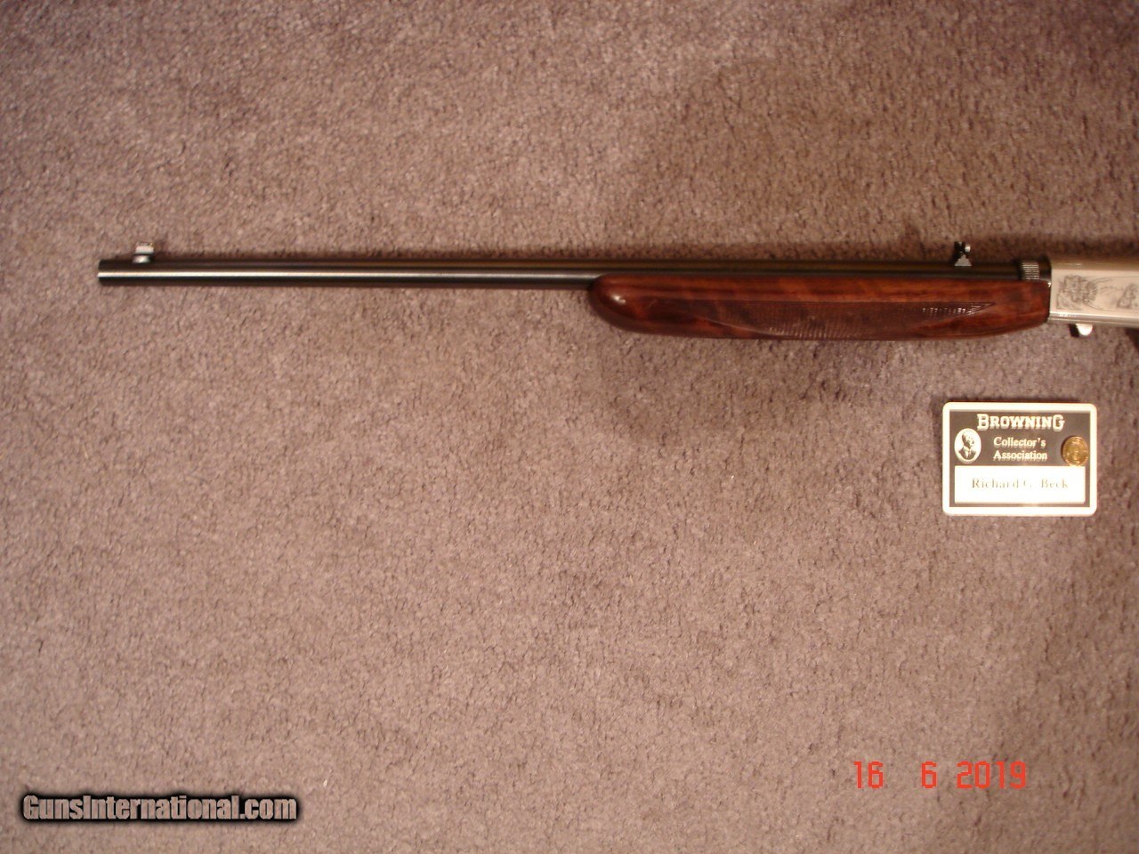 Description: We have for sale A Beautiful Little Browning Grade II .22 Semi-Auto Takedown Rifle. MFG 1n 1987 with Hand Chased Engraving Satin Gray receiver. Wonderful Dark Walnut Fancy Stocks with hand cut Checkering. 19" BBl. Mirror Bore Mint Overall, with Original Box, and a copy of the owners manual. .22Lr. 10 round Magizine, LOP is 13 3/4" -O/A 37". These hand Engraved and hand Checkered Little Brownings are very Collectable, and are starting to be difficult to find. SER3. 02128PZ246 Shipping & Insurance to your FFL is $30.00 Ask about our Free Layaway's! Priced at $1299.00 SOLD |