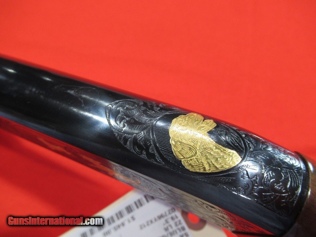 Description: Blue finished receiver with gold overlaid game scenes. Highly figured stock and forend with gloss finish. This is one sharp looking piece. SOLD |