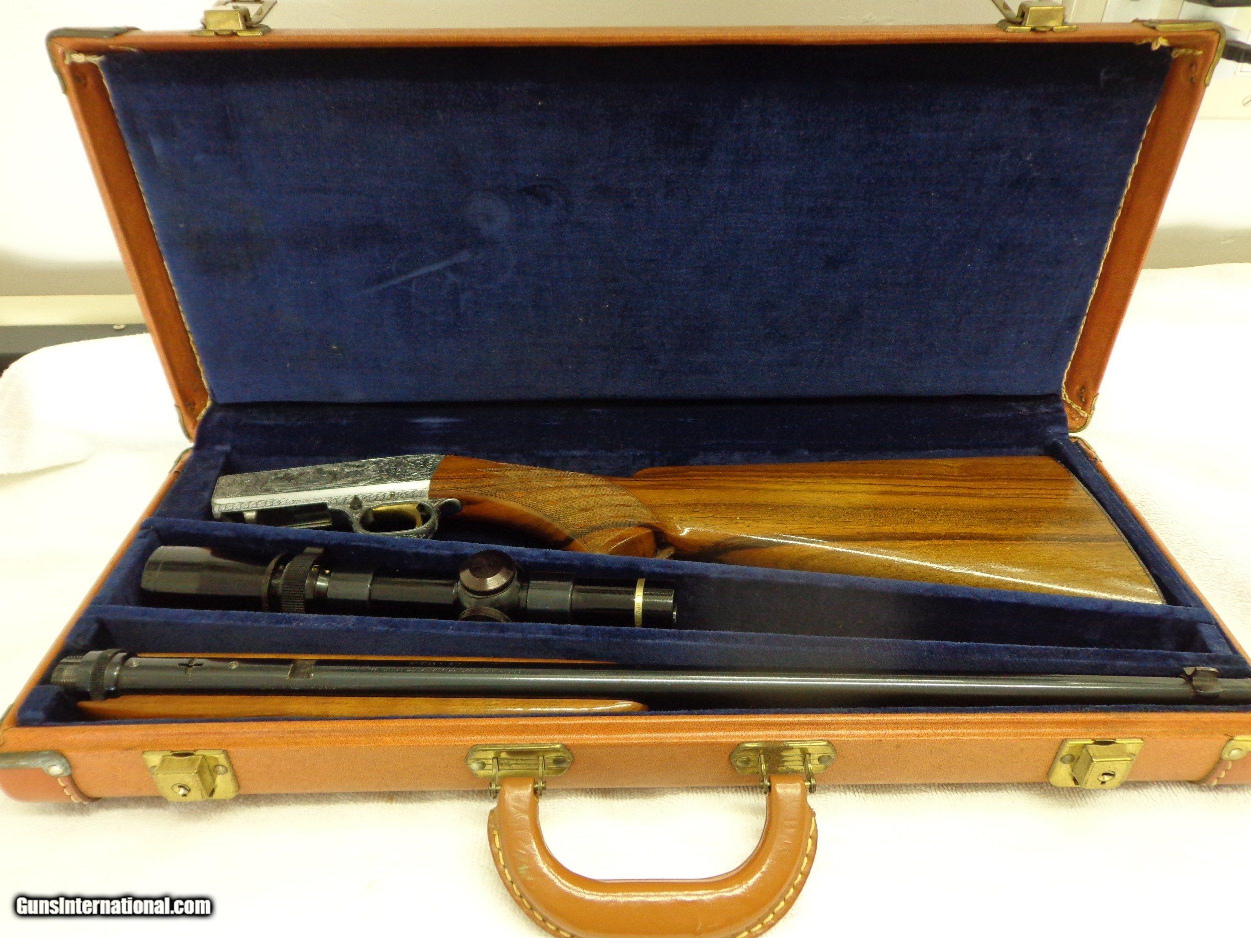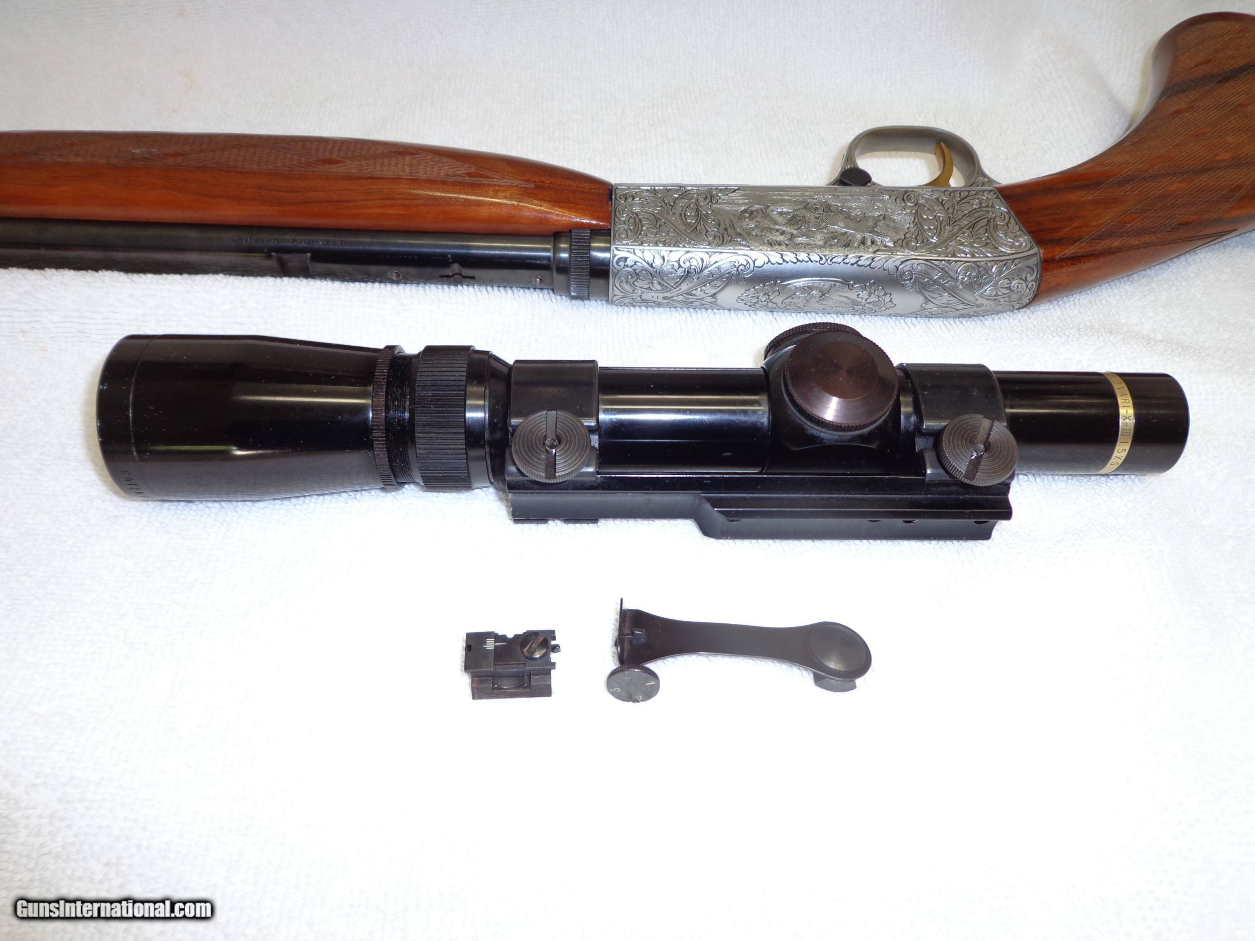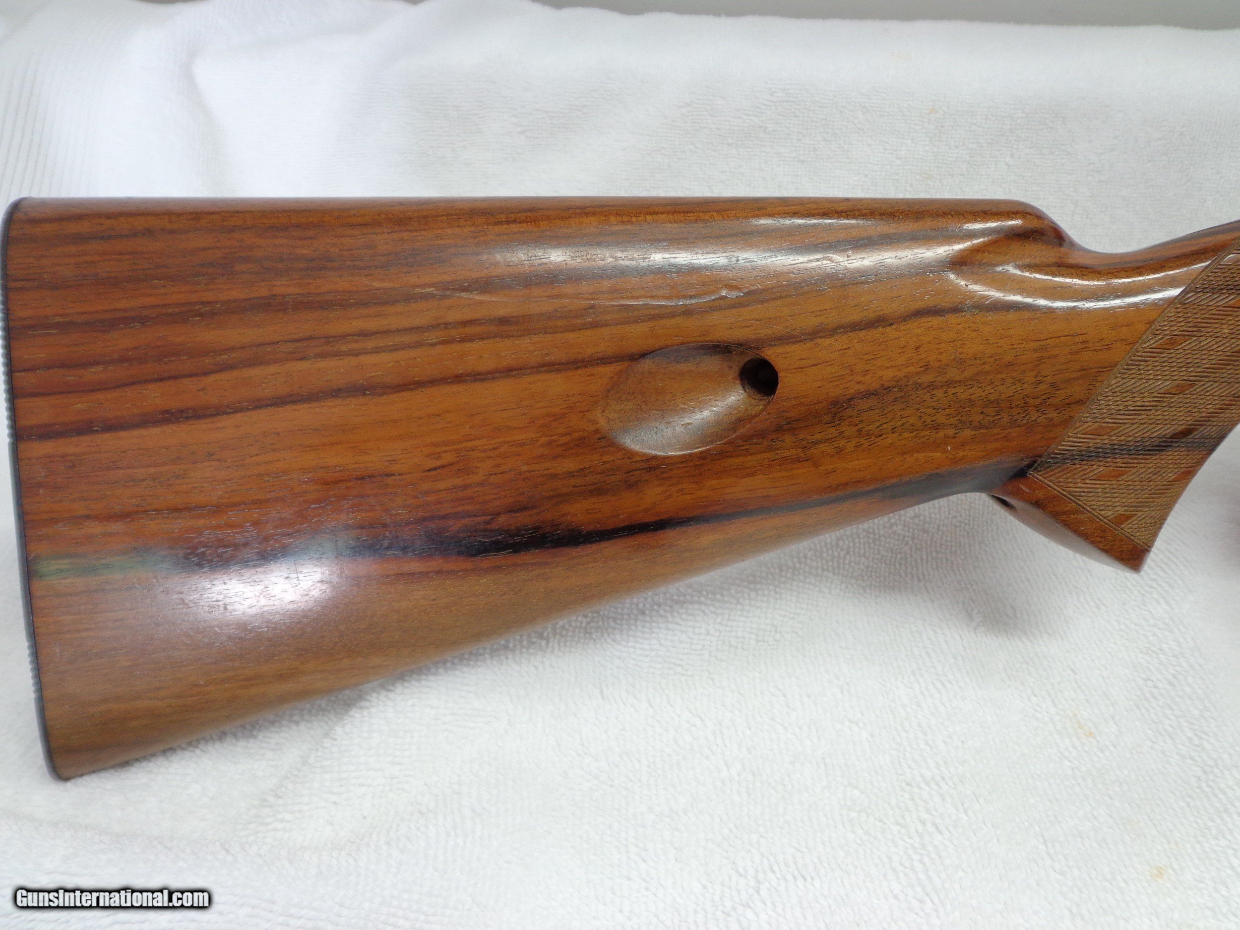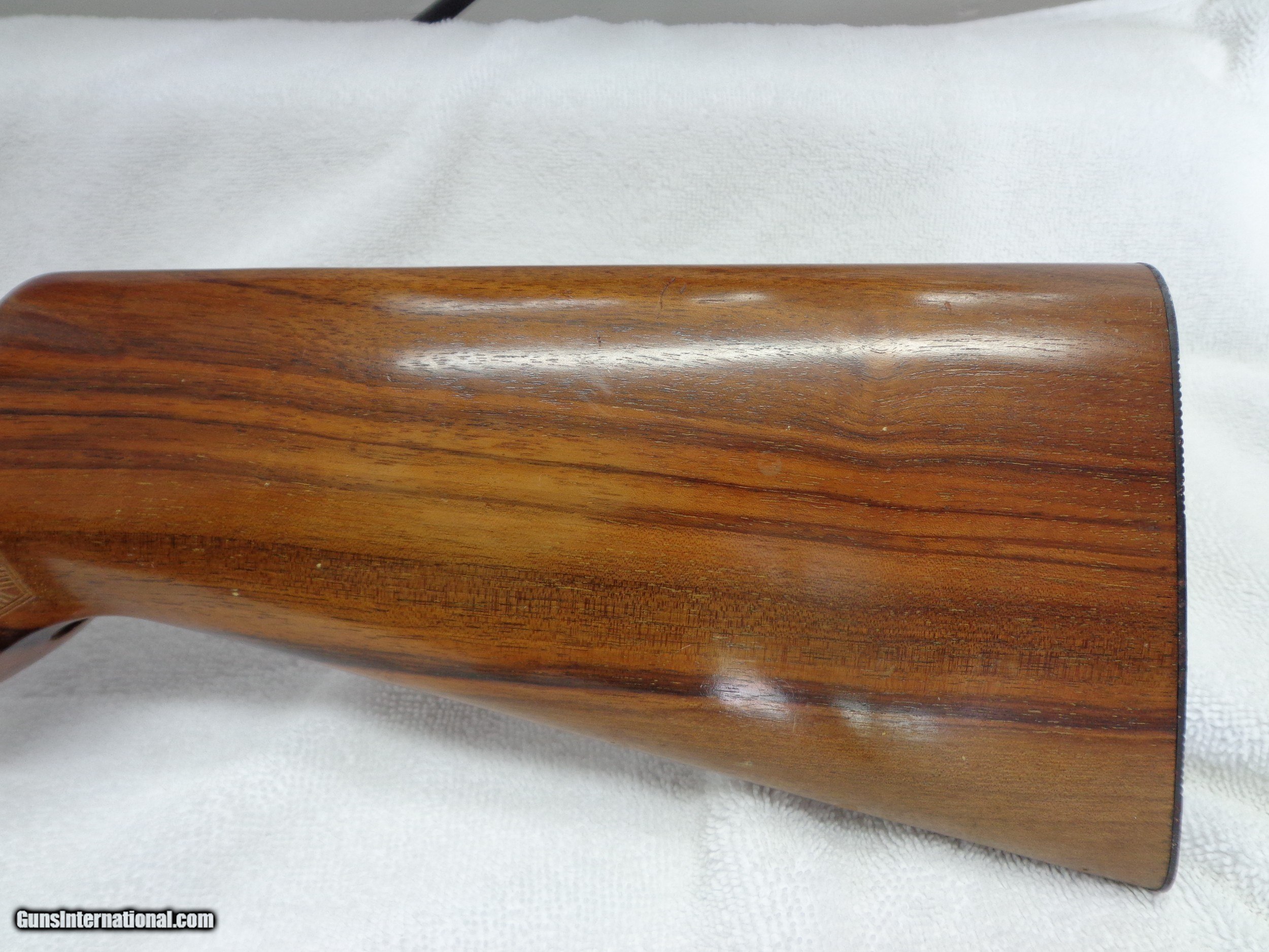 Description: BROWNING SA-22 Grade III. Fabrique Nationale, Belgium. Cal. 22 LR. Serial No.T38504 with matching stock buttplate serial number 38504. Date of manufacture is 1958. Stock is hand rubbed oil finish and shows a few light marks from handling and very light use. Blueing has no rust or worn out spots. Engraving on the receiver is nice and sharp without any nicks or scratches, unsigned. Sights included are the original wheel sight, a newer blade sight and a Leupold Vari X-III 1.5 – 5.0 scope with barrel mount. Rifle barrel is drilled for this mount. Case is the original, very rare, Browning Tolex case with the blue velvet lining. Case is in very good condition inside and out and is provided with one key. Price: $6,200.00 Shipping & Insurance: $50.00 I am a private seller so if your state requires shipment from a FFL add $25.00 SOLD Rifle Caliber: .22 Long Rifle |