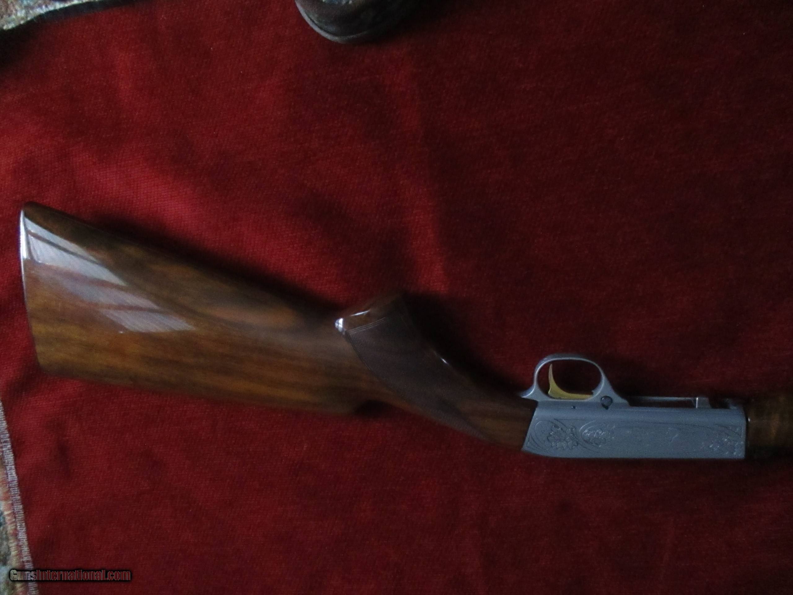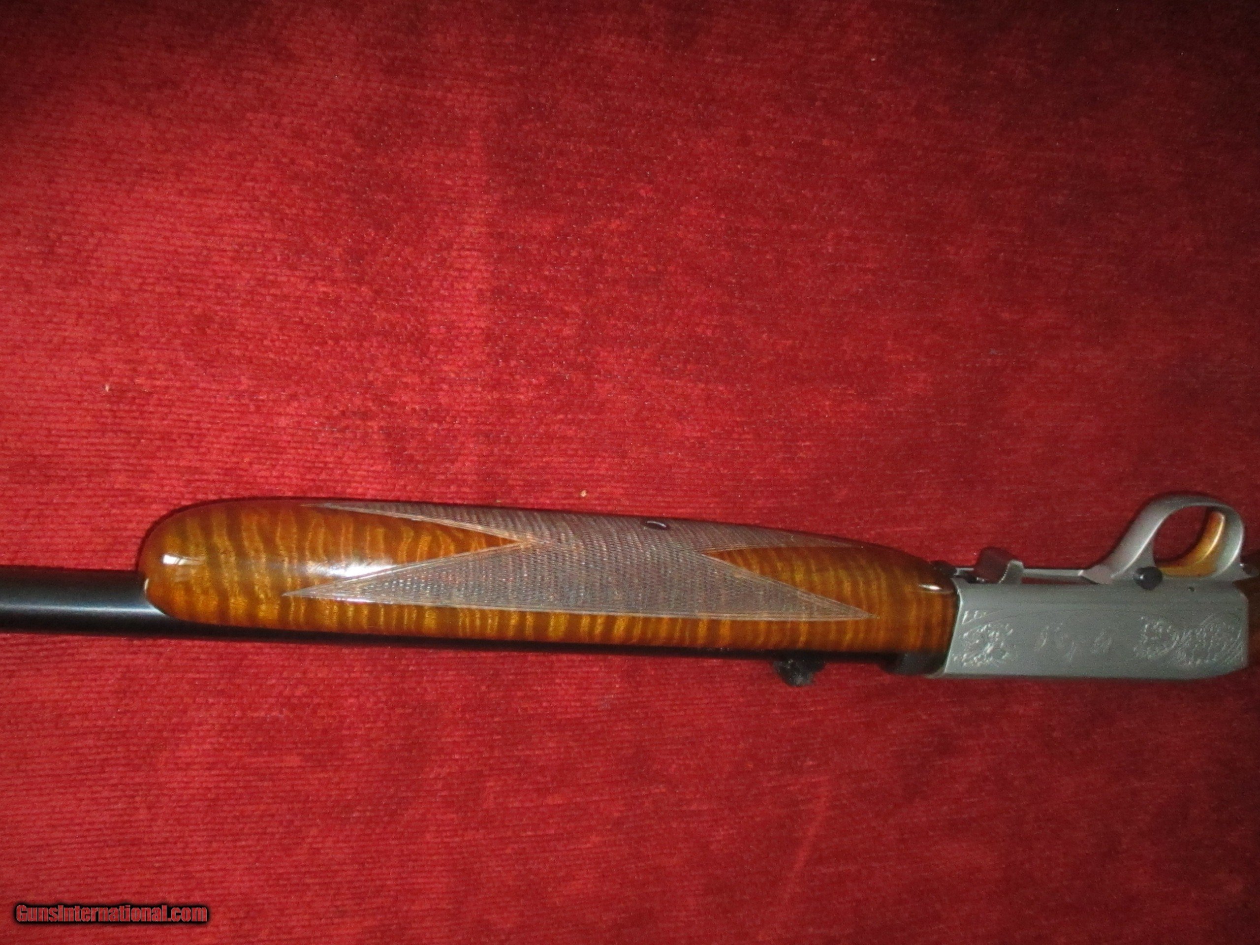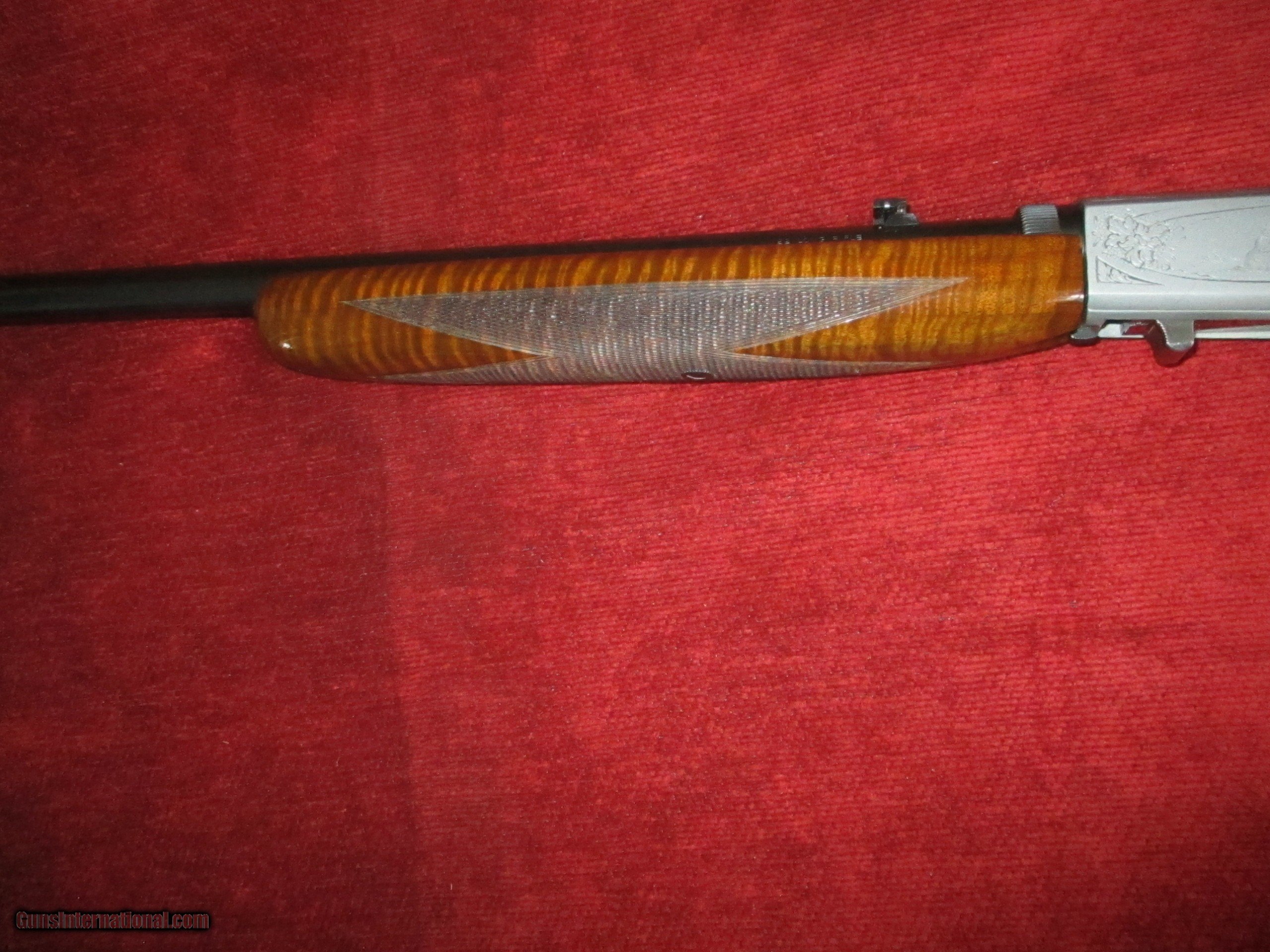 Description: 19 1/4" bbl,. blade front, folding open rear, factory D&T for scope, Squirrel Edt. gamescenes Grd. 11 engraving by WJ, Exotic checkered walnut stock & forearm, ck. steel buttplate, rear or side load, as new in proper Browning hard case, All Belgioum mfg.,. getting pretty scarce & only ! SOLD |