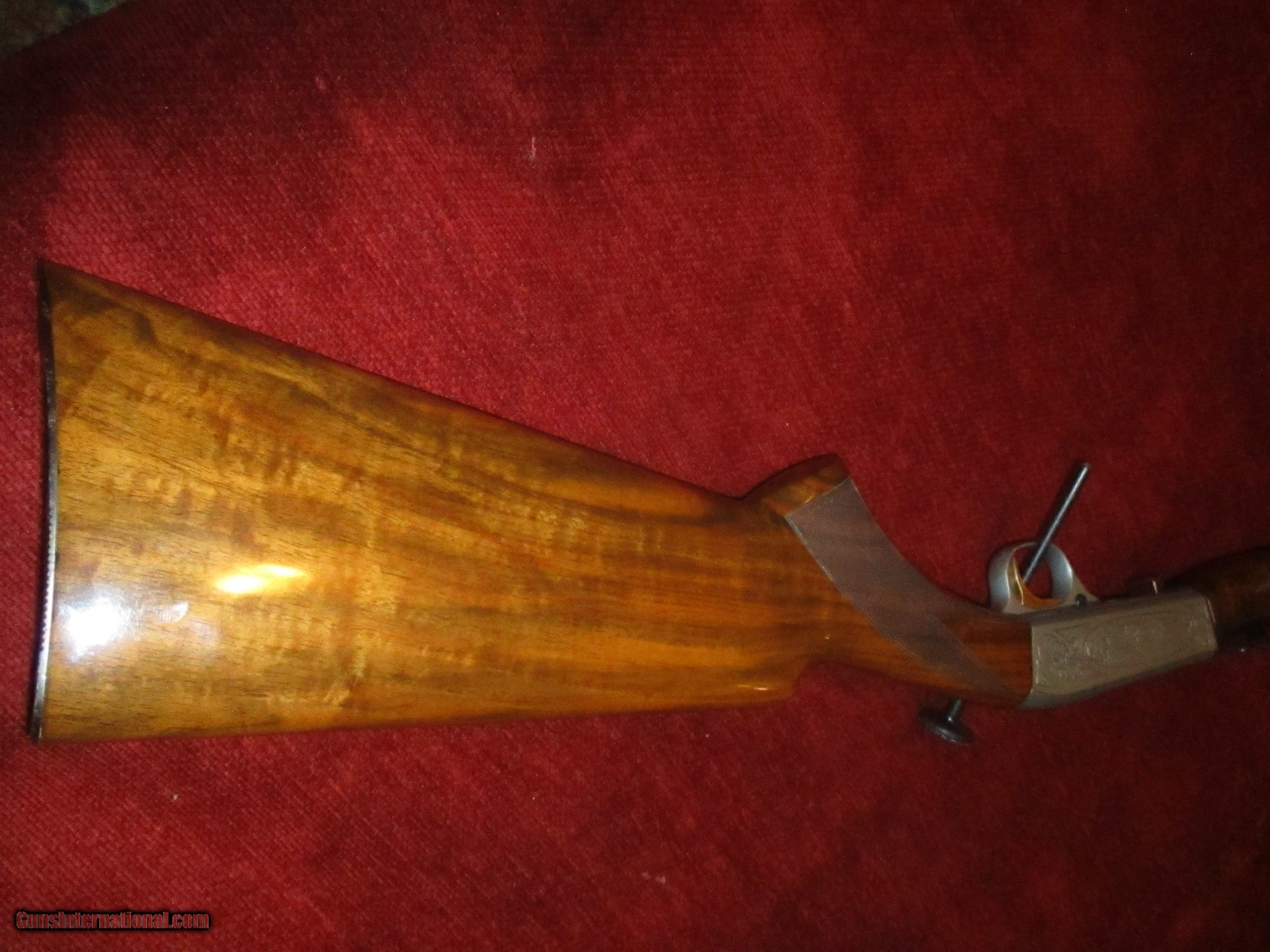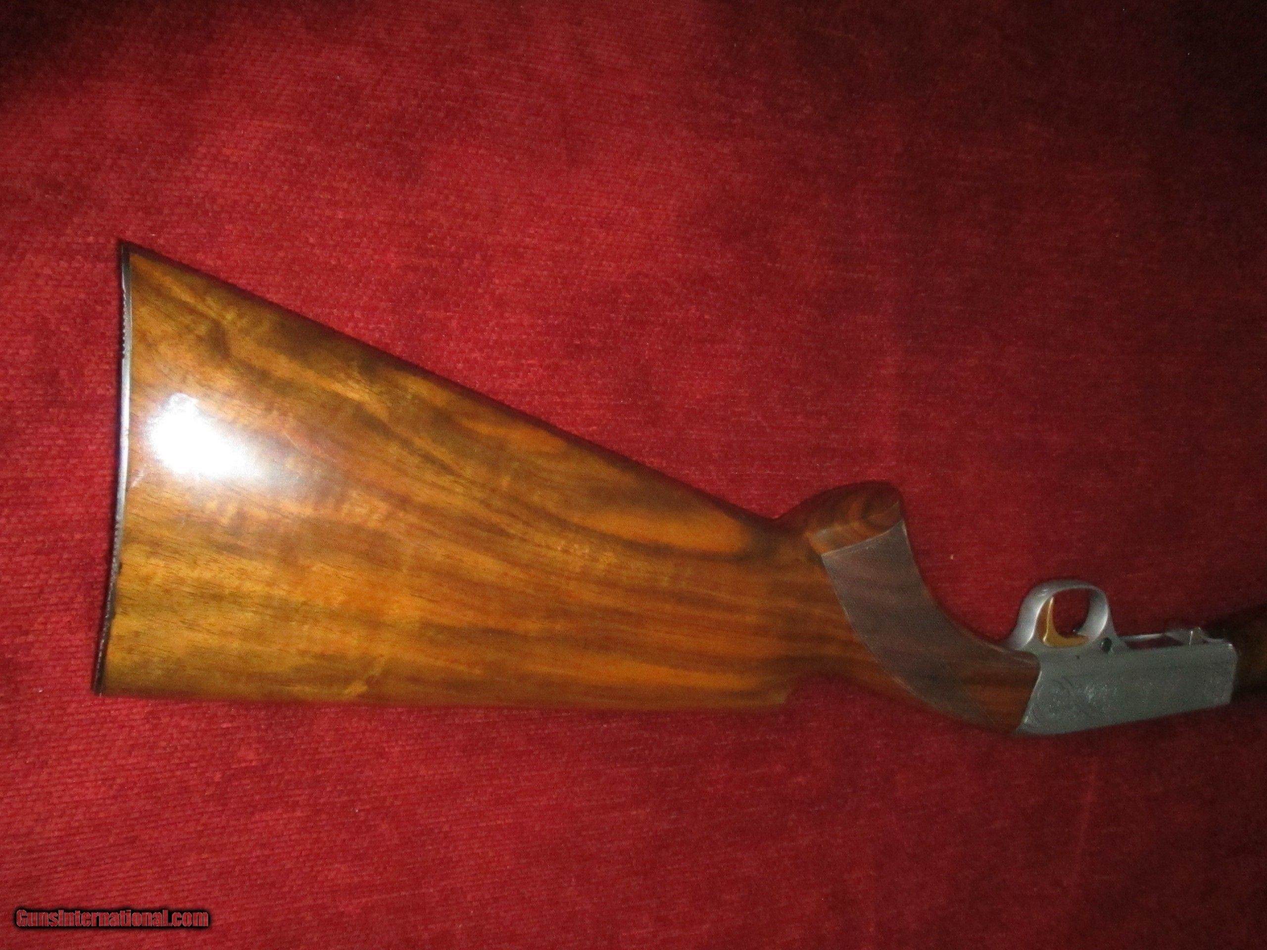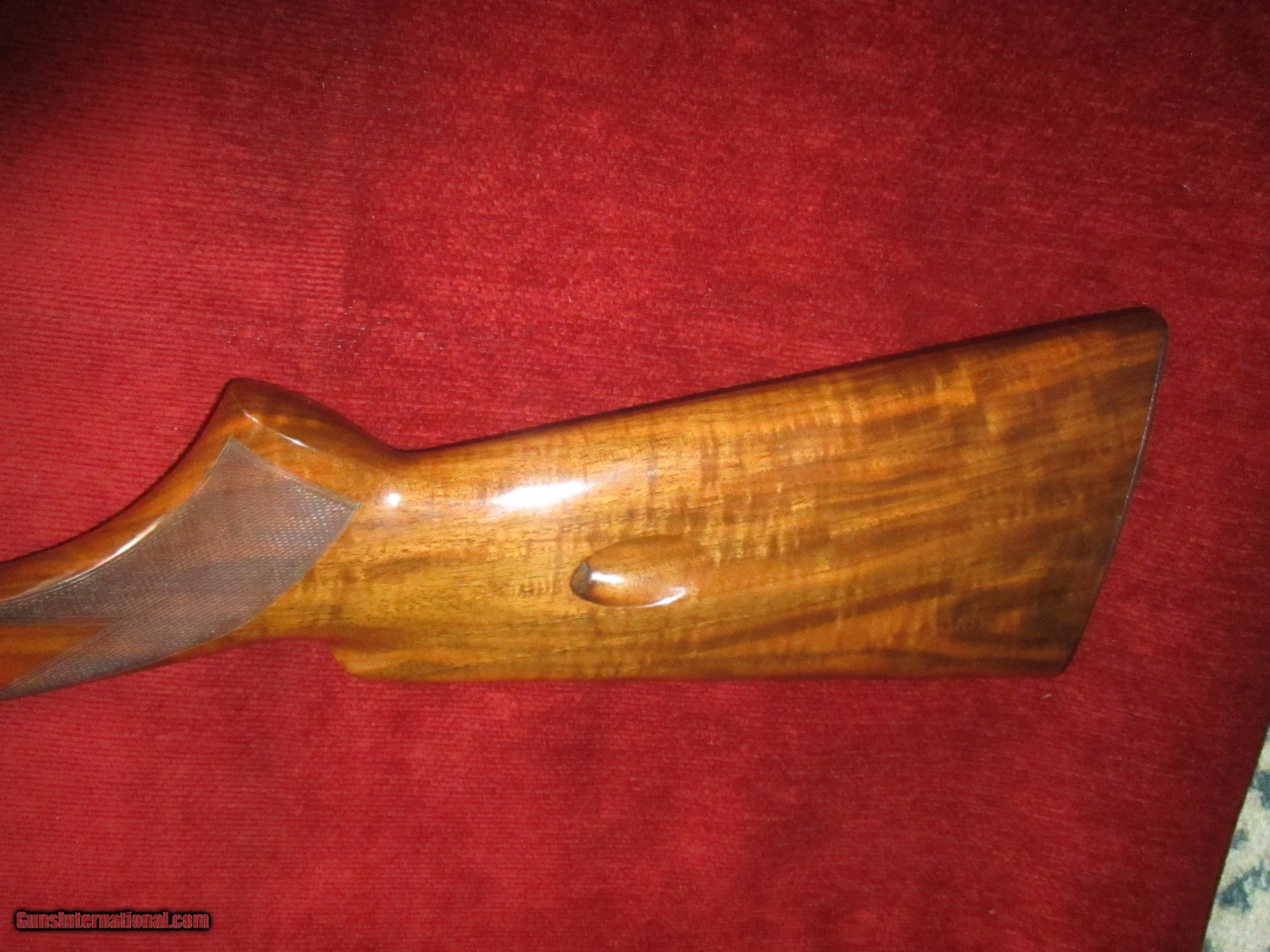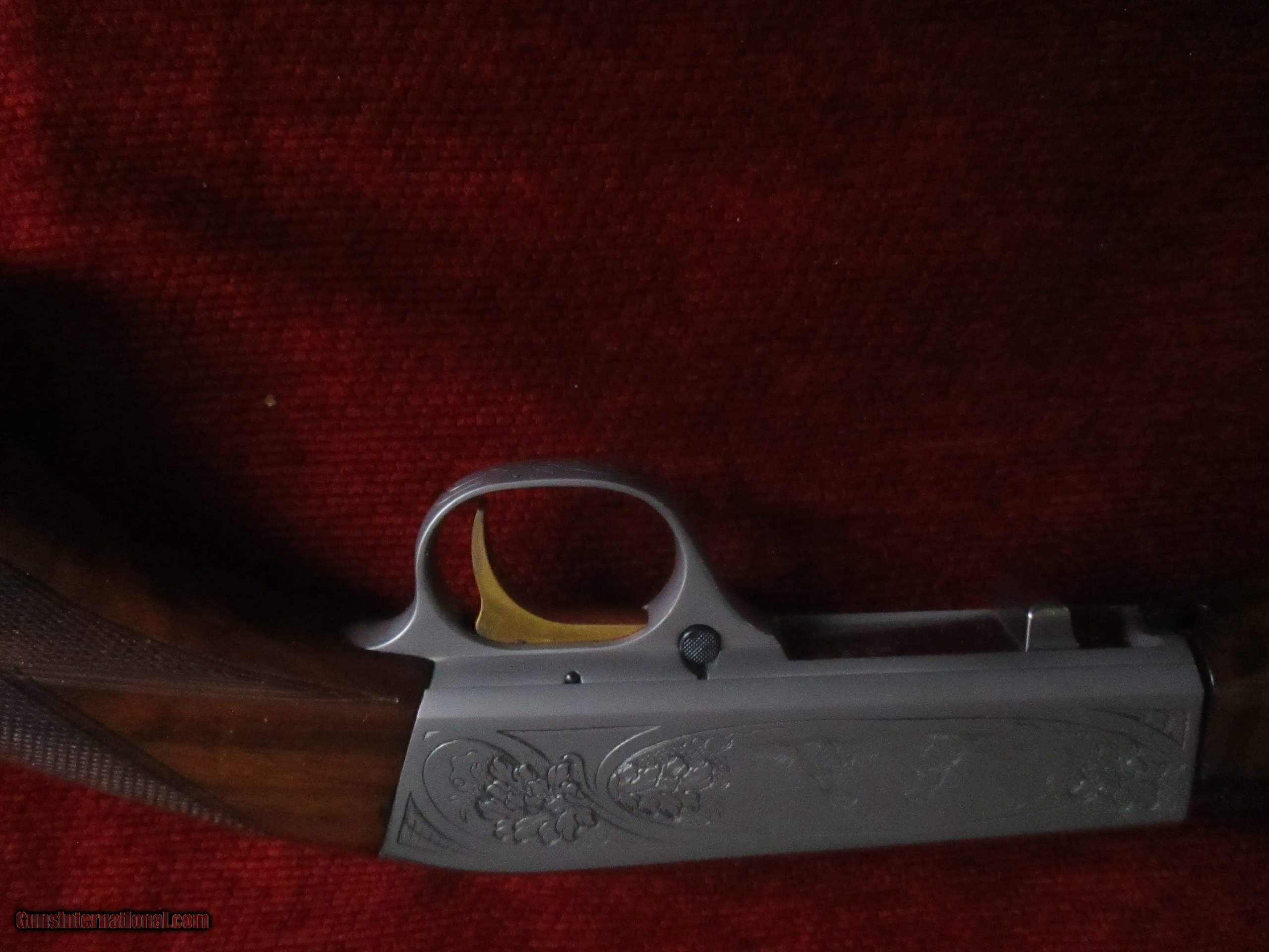 Description: 19 1/4" bbl,. blade front, folding open rear, factory D&T for scope, Squirrel Edt. gamescenes Grd. 11 engraving by WJ, Exotic checkered walnut stock & forearm, ck. steel buttplate, rear or side load, as new in proper Browning hard case, All Belgioum mfg.,. getting pretty scarce & only ! SOLD |
