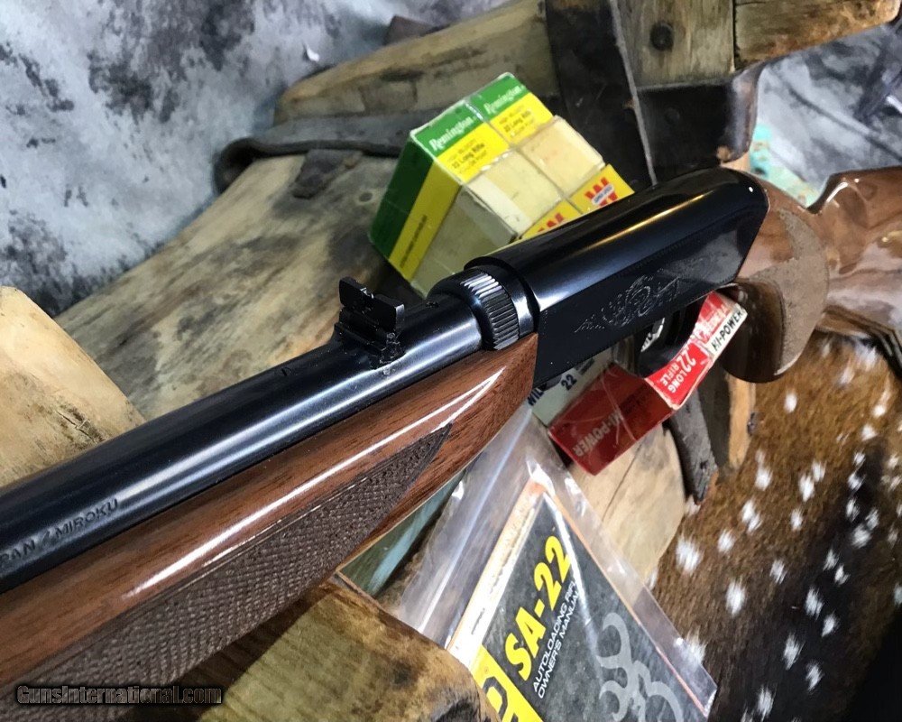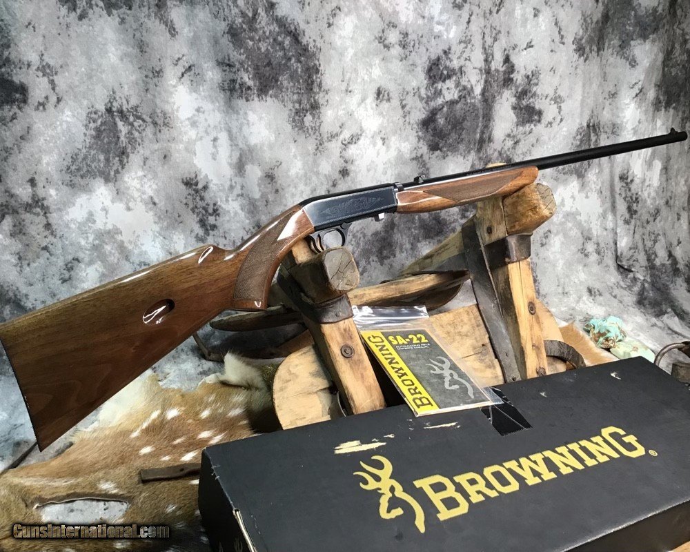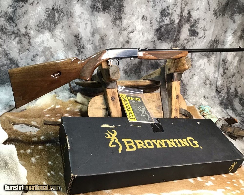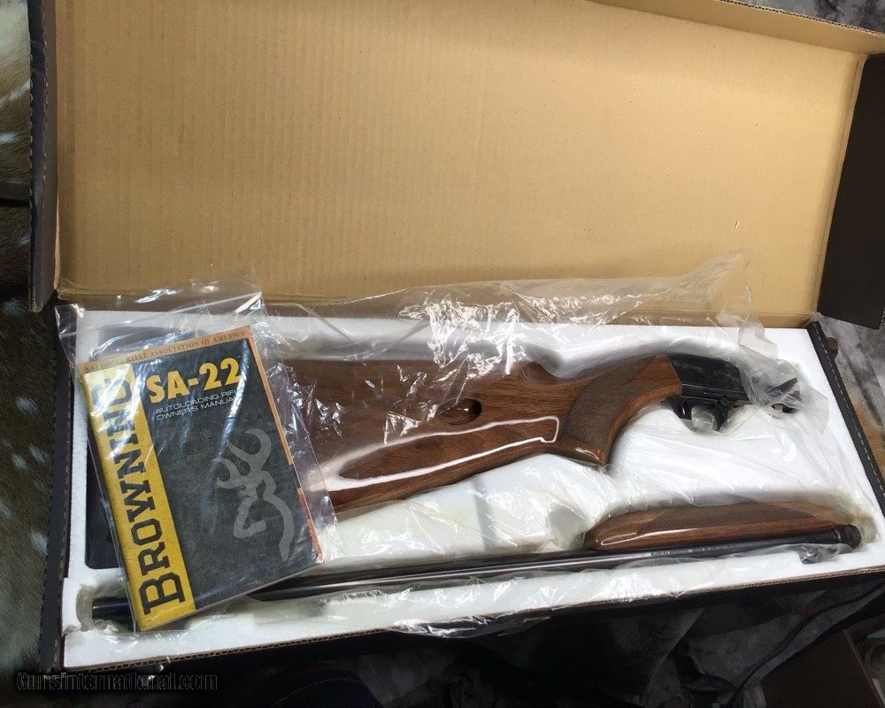 Description: Sold Pending Funds---Scarce Browning SA22 takedown rifle chambered in .22 Short cartridge. Rifle remains unfired in numbered to gun box with manual and owners papers. I had to clean off factory packing grease to take photos of gun and assembly for first time since factory. This model is based on a John Moses Browning patent and has been in production since 1914 and first shipped to US shooters in 1956. The bottom ejection of spent cartridges allows ambidextrous operation and leaves open panels on receiver sides for tasteful factory engraving. Rifle wears a 19.25 inch Blued barrel and checkered Walnut stock with flip up adjustable sights. Fun plinking at targets or hunting small game with the .22 short round is good stuff and a perfect gun to train young shooters. A rare chance to own a new in box SA22 Browning Grade I to enjoy in your collection or spend countless hours of shooting fun with the family. Add 3% if paying with credit card. Free shipping for US veterans and retired LEO. God Bless America from a proud American, and a Viet Nam Vet , thankful for our freedoms.. paid for by the Blood ,Sweat and Tears of our brave men and women in uniform. Ten Below Firearms is a Veteran owned and operated business. We specialize in out of production models of high quality firearms. We love to ship! We ship to all states where legal, just give us a call! Handguns normally ship for $35 and Long guns for $45 up to $75 for extra length long guns. That's 2-3 day USPS Priority shipping, Delivery conformation and with tracking number. Optional Postal insurance is additional $1.70 per $100 and highly recommended. We are OPEN BY APPOINTMENT ONLY FOR IN PERSON VISITS, We trade, sometimes. Layaway:If needed we offer a 60 day layaway program. Terms, 1/3 of purchase price down, 1/3 due in 30 days, and the final third to include card fees and shipping due at 60 days. Funds are non transferable and non refundable .Layaway is not available on negotiated prices. SOLD Rifle Caliber: .22 Short Manufacturer: Browning Model: SA22 Short Grade1 Serial Number: 02956ZX212 Barrel Length: 19.25 inch Condition: NOS Metal Condition: Excellent Wood Condition: Excellent Bore Condition: Excellent Action: Semi Auto Stock: Checkered Walnut Finish: Blued Sights: Flip up adjustable Manufacture Date: 1913 Engraving: Factory Case: Box Item Location: Mn |