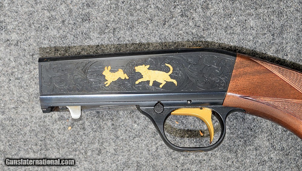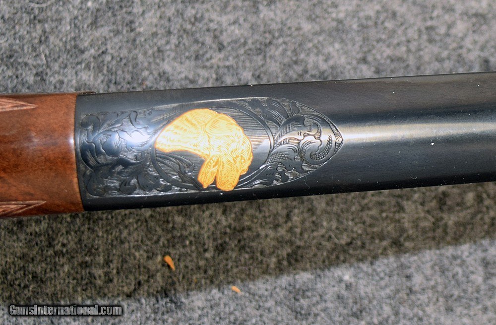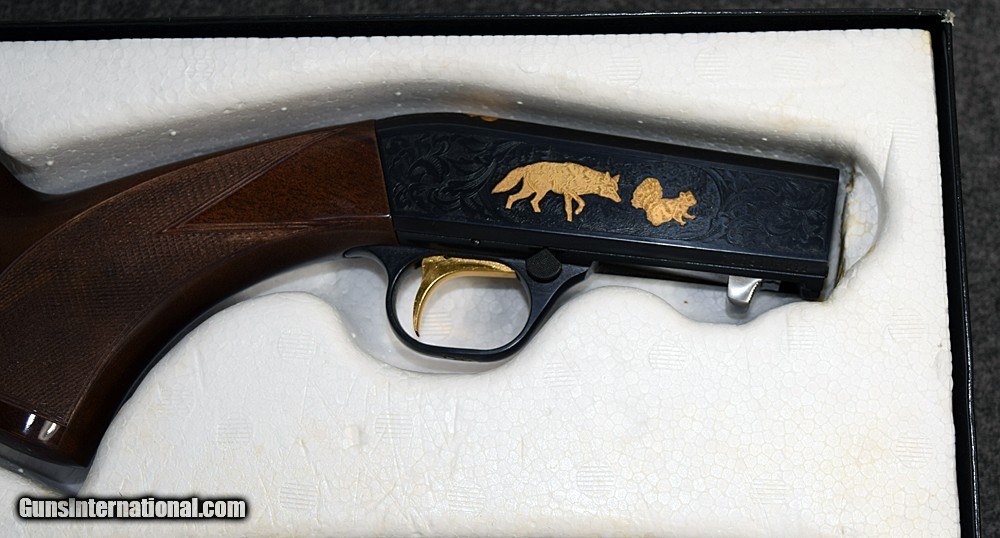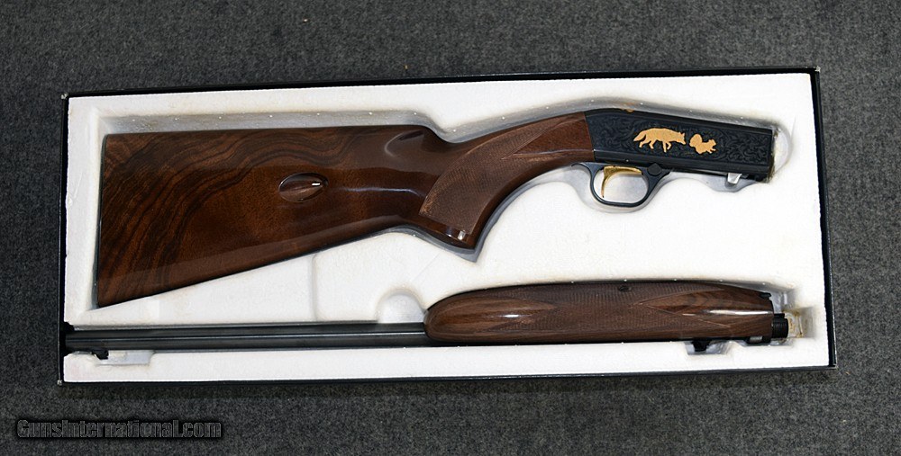 Description: Browning SA-22 High Grade. Serial #01061NP212. This beautiful Browning was built in 1998. The rifle is chambered for .22 Long Rifle. These guns are sometimes referred to as Grade 6. The rifle comes in the original factory box numbered to the gun. As the pictures show, this rifle is beautifully engraved and gold inlaid. All wood and metal finish is factory original and shows no sign of being fired. Please include 30.00 freight and insurance. SOLD Manufacturer: Browning Model: SA-22 Serial Number: 01061NP212 Caliber Info: .22 Long Rifle Condition: New Metal Condition: New Wood Condition: new Bore Condition: bright Barrels: 19 1/4 |