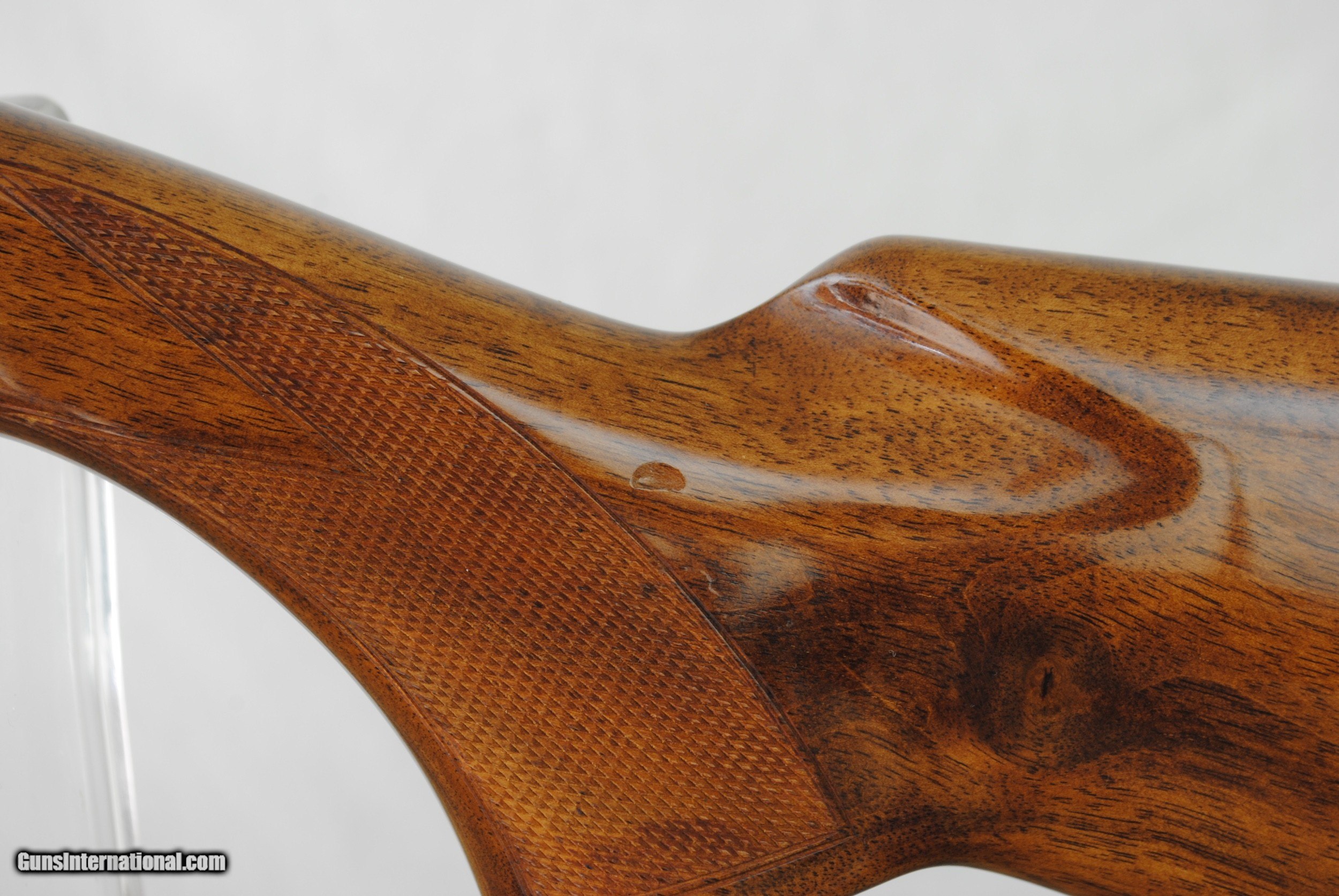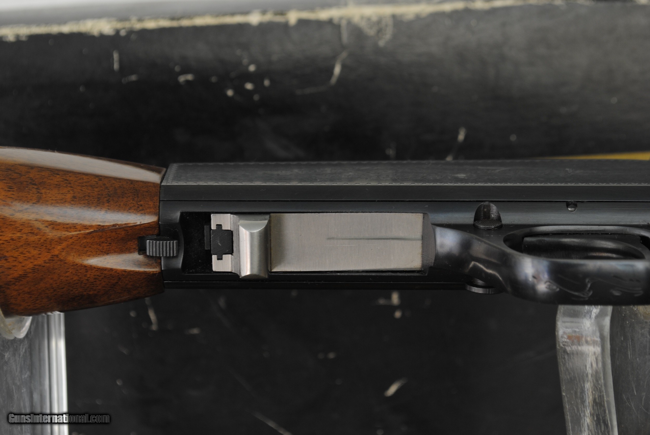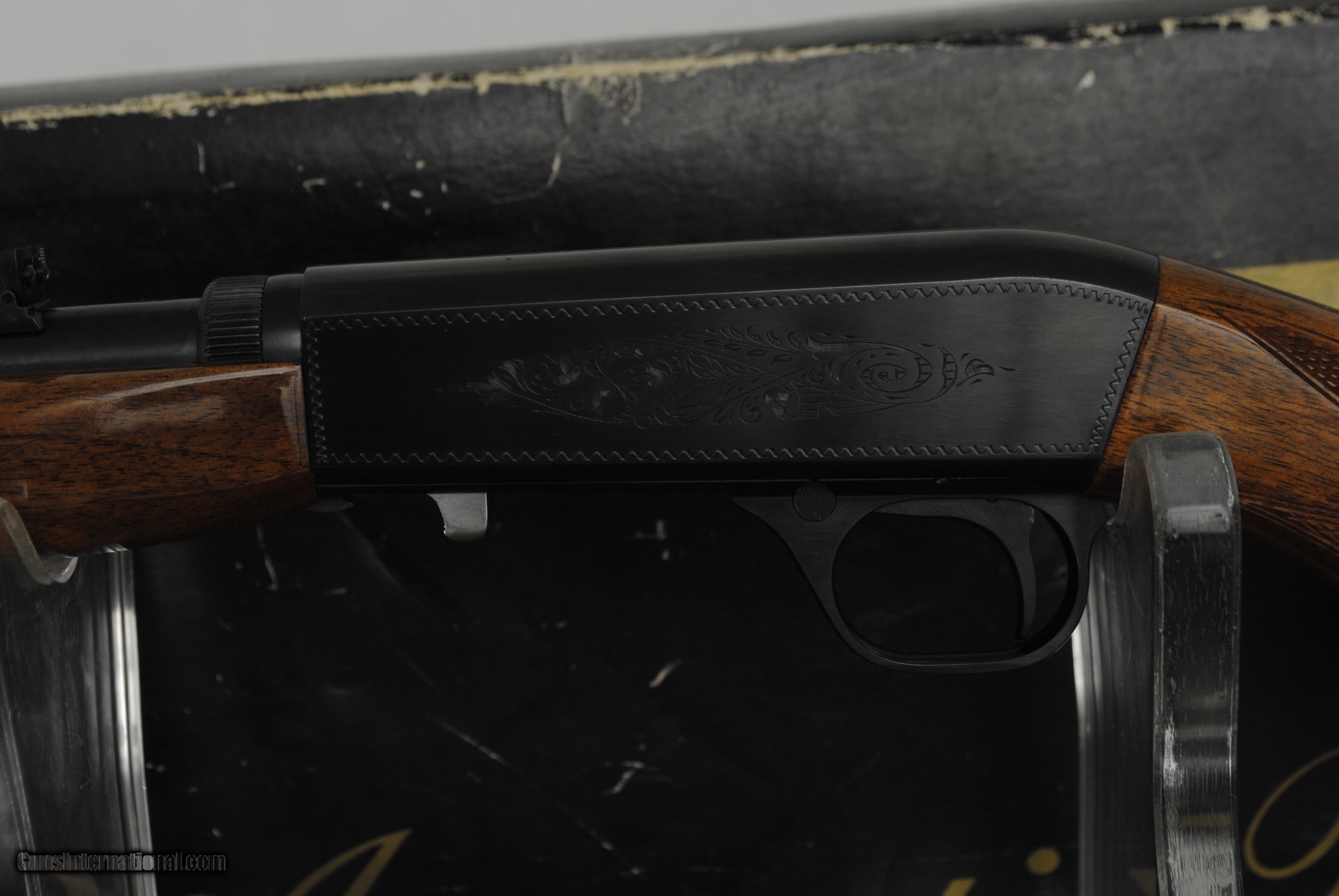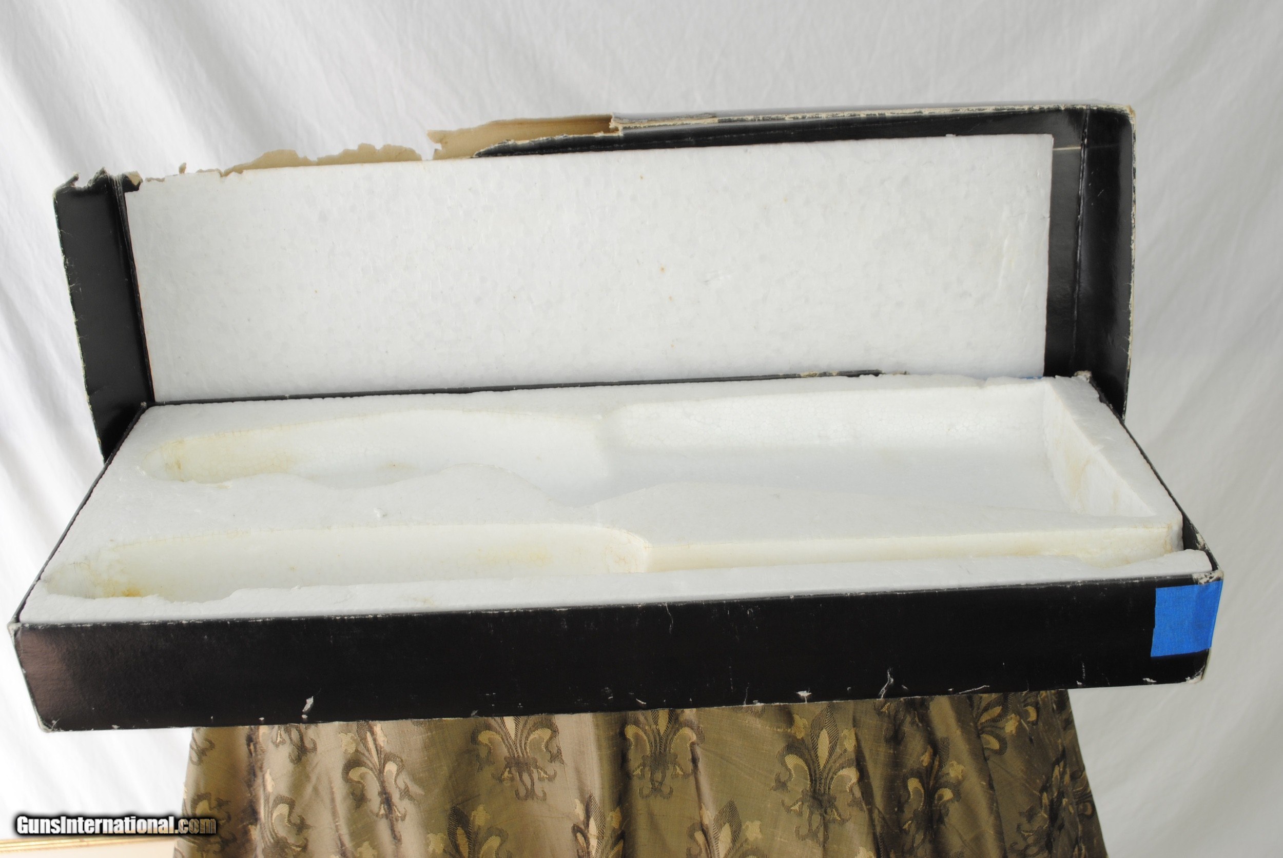 Description: Browning Semi Auto Take Down 22 with box. This is a 1974 year production - first year in Japan. Notice the "Made in Belgium" on the box end as they attempted to use remaining packaging stocks. Near mint condition of gun. Box is tatered as shown. No manaul or paperwork. Hand engraved. Barrel is Factory taped for scope mount. Barrel is 19 1/4". Weight of gun is 4 LBS 12 3/4 OZ. Shipping is $50. SOLD |