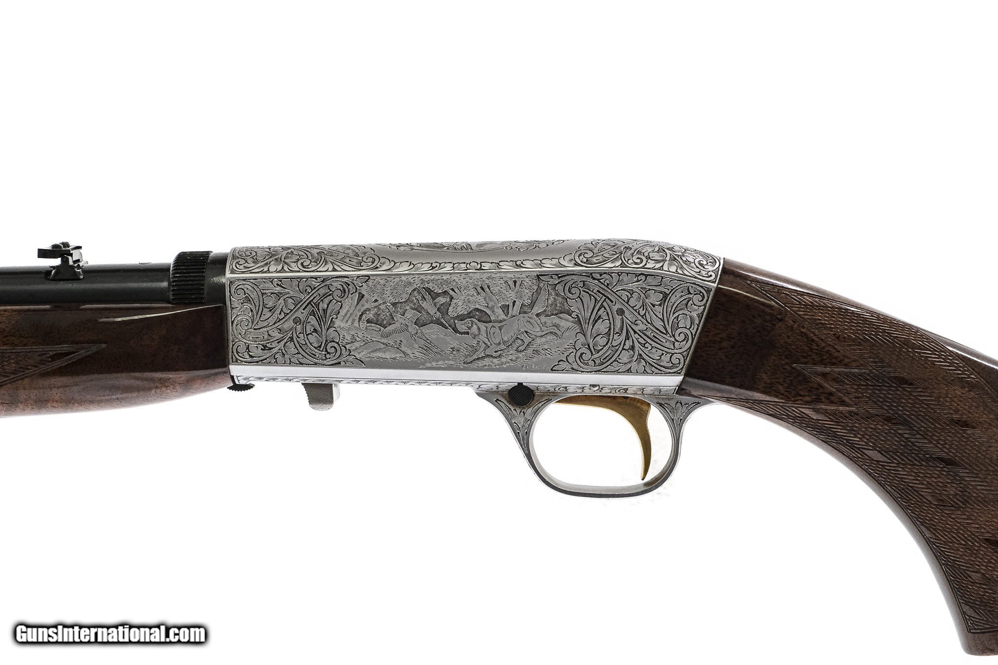 Description: Browning - Takedown, Grade III, .22 LR. 19 1/4" Barrel. Pistol grip, highest quality 1972 Belgian manufacture, open front sight and rear flip sight, factory signed by Servais, pretty wood, appears unfired. Inv: 72617 4 lbs. 14 oz. 13 3/4" LOP $6,700.00 SOLD |