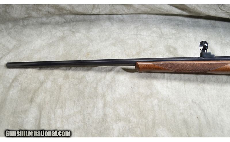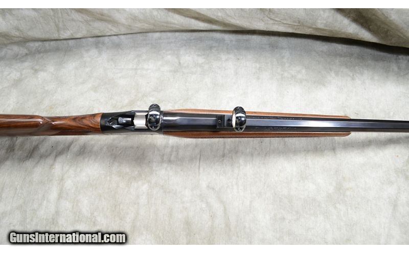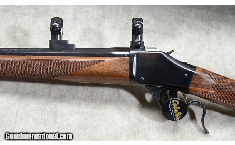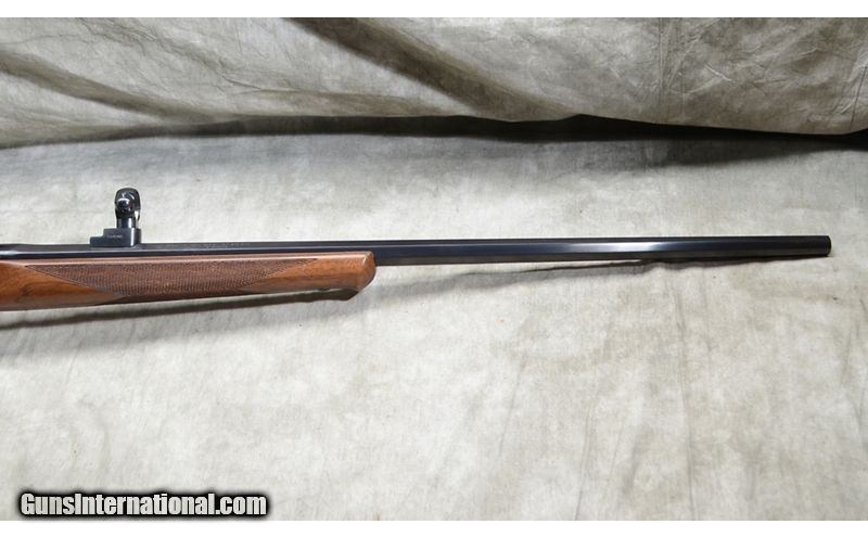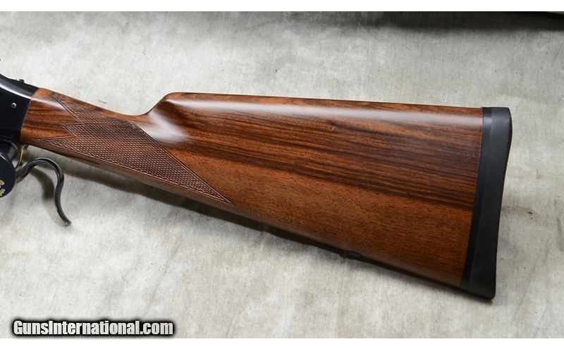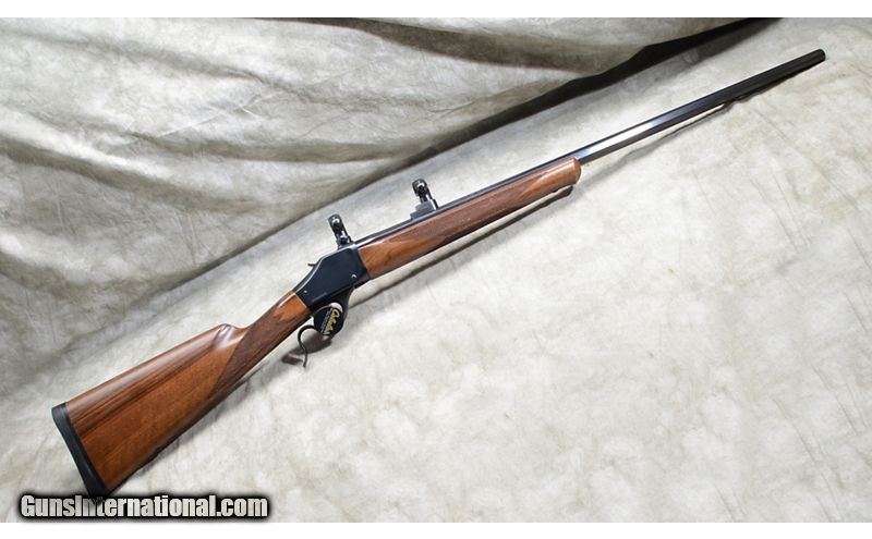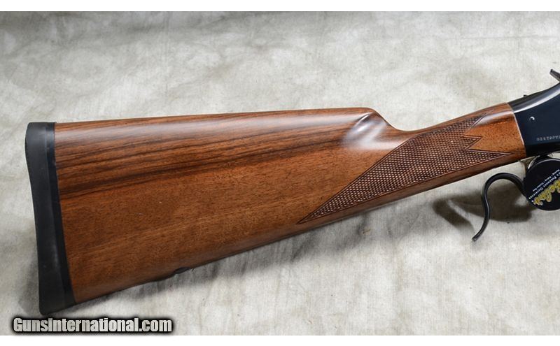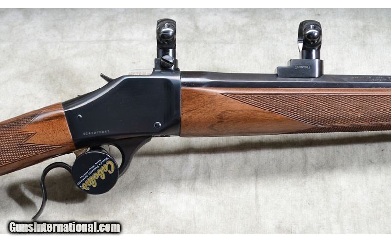 Description: This high wall reproduction by Browning features hexagonal barrel, slight Schnabel forearm tip, and thick rubber pad. Checkering is sharp. .270 Winchester SOLD Chambers: Single shot. Metal Condition: Excellent. Wood Condition: Very good to excellent. It has a few minor handling marks. Bore Condition: Shiny and bright. Barrels: 28-inch hexagonal barrel. Triggers: Factory gold and grooved trigger Stock Dimensions: 13-3/8 inch LOP. Fore End: Well-matched walnut. Butt Pad: Rubber pad. Sights: "Drilled and tapped for scope, outfitted with rings and bases. Item Location: Rogers |