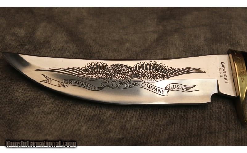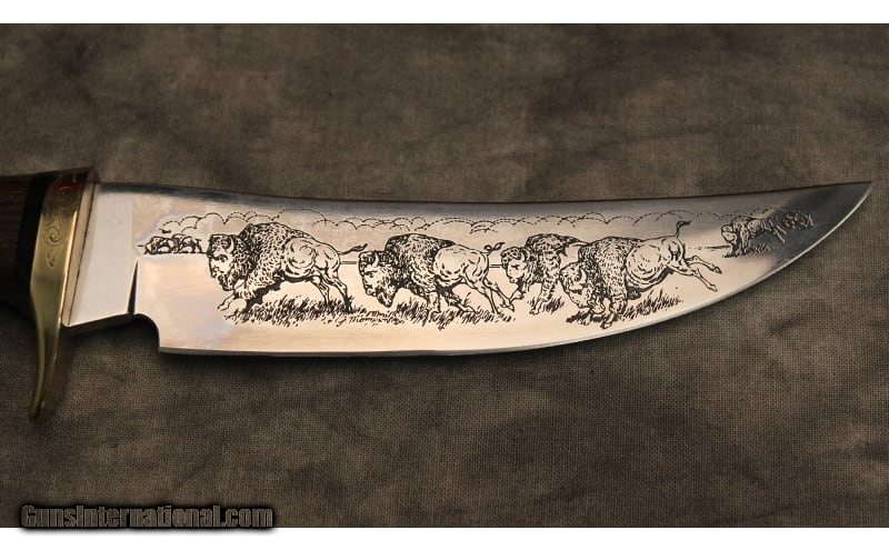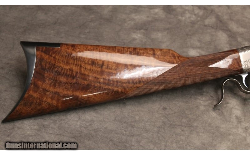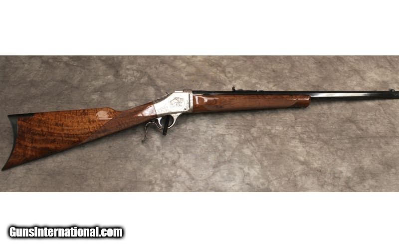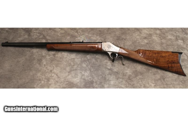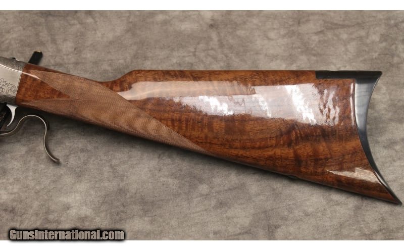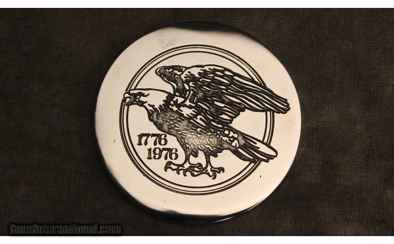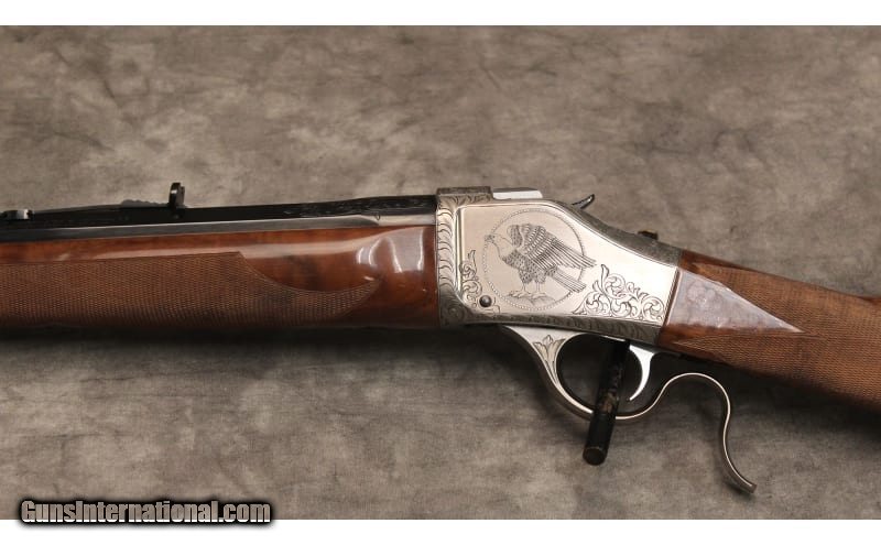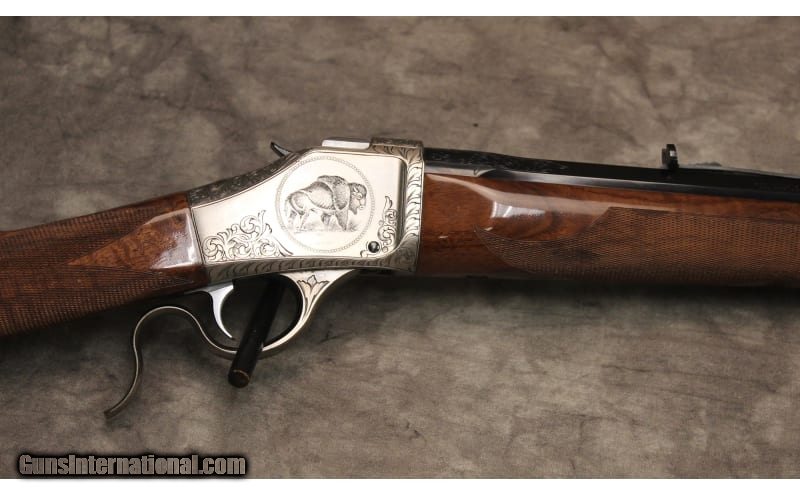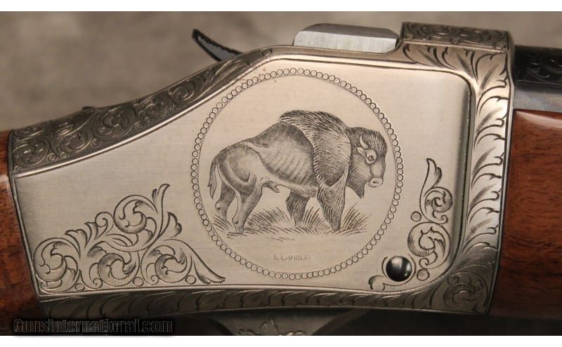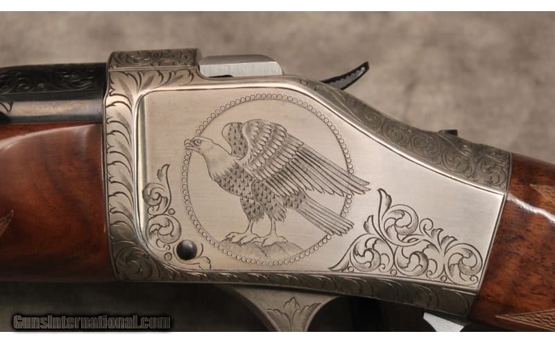 Description: This is one of a thousand Browning B-78 manufactured to commemorate the 200th birthday of these United States. It features blued octagonal barrel with floral pattern engraving at the muzzle and at the breech. The gray coined receiver is engraved with an eagle scene on the left flat, and a bison scene on the right flat. Both scenes are framed by more floral pattern. The floral pattern is carried onto the lever and the top of the butt plate as well. The stock and forearm are well-matched checkered high-grade walnut with good figure. It comes with a red velour lined locking wooden display case, a challenge coin, and a Browning fixed blade hunting knife serialized to the gun. The bison scene on the gun is signed by L. Lambert .45-70 Government SOLD Metal Condition: "Excellent, with only light marks on the block Wood Condition: Excellent Bore Condition: Excellent Barrels: "24"" Octagon, blued and engraved Triggers: Single groove Stock Dimensions: 13.25 Fore End: Schnabel checkered Butt Pad: "Blued steel plate, engraved Weight: 8lbs Item Location: Broken Arrow, OK |