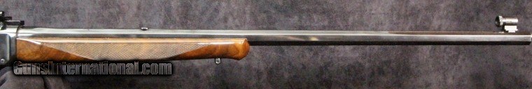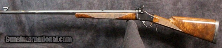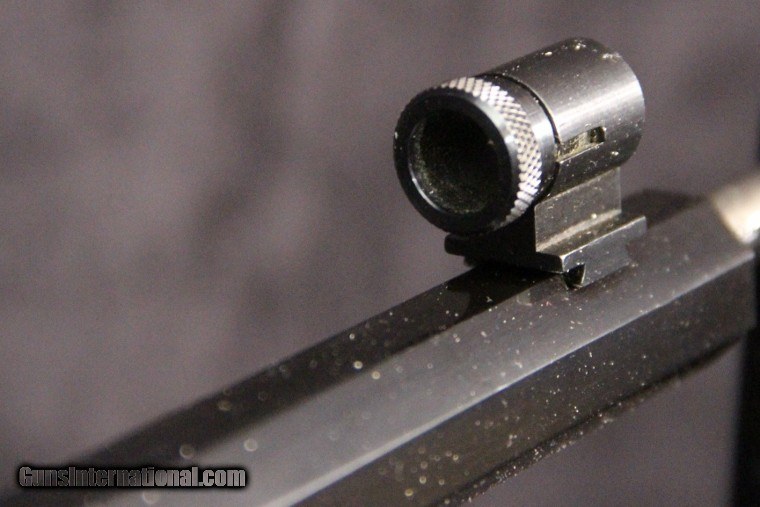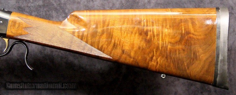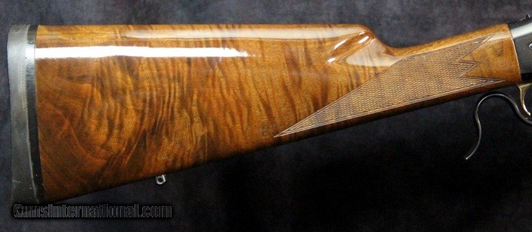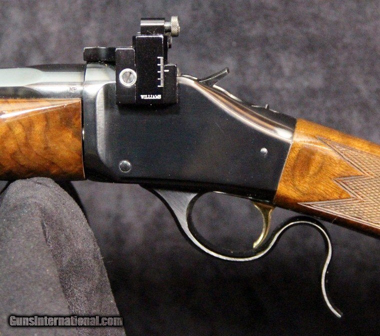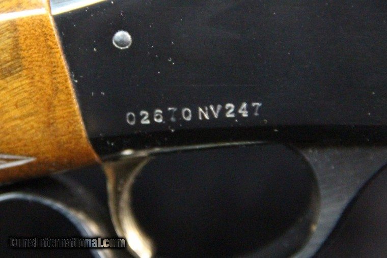 Description: .45-70, #02670NV247, 28 inch barrel, blue finish, checkered walnut stock and forearm, Williams receiver sight, globe front sight, barrel dove tail for sight plugged, original sight in box, tapped for scope blocks, all paper work, original box, Japan, 1995. Condition: 99% overall SOLD |