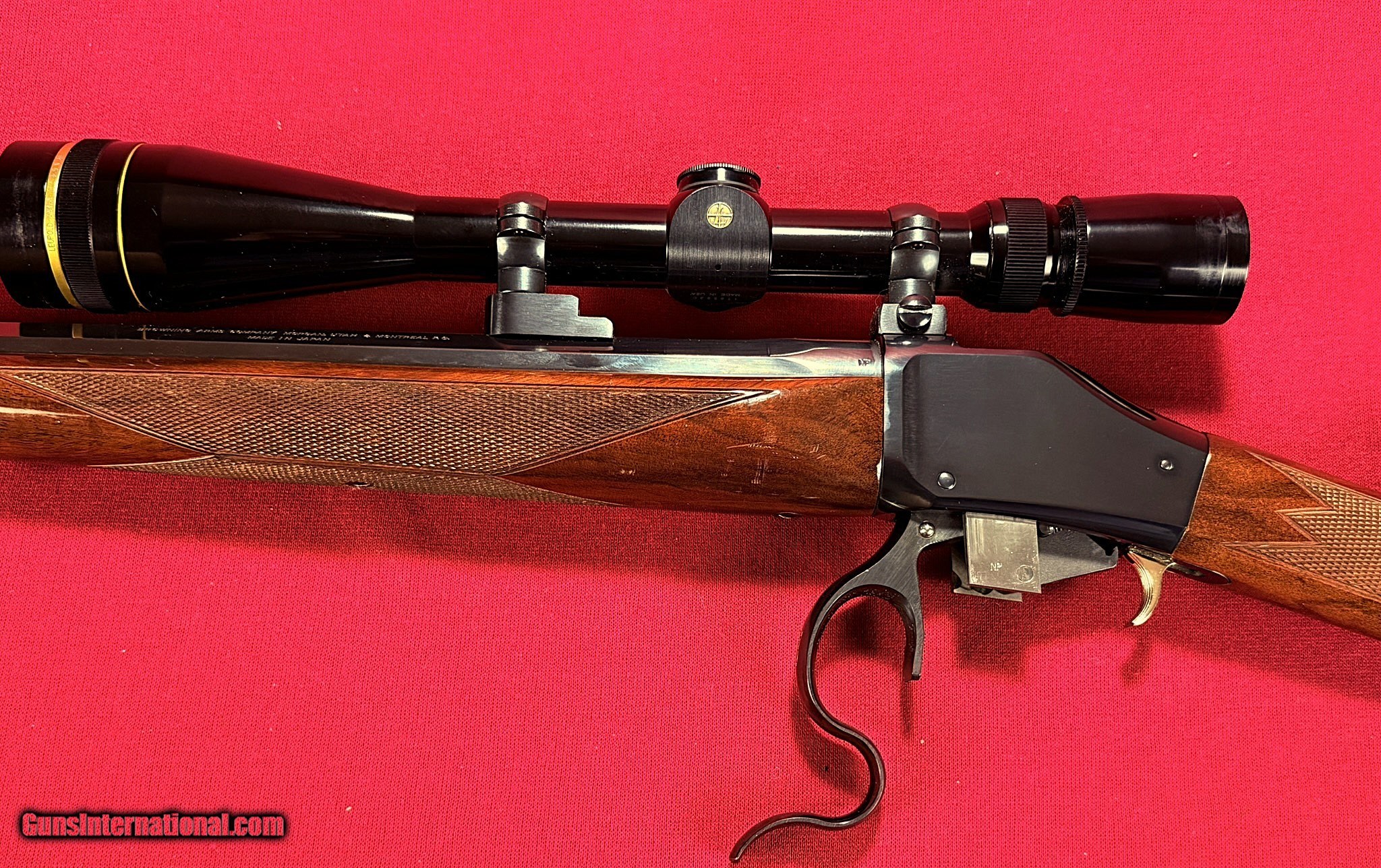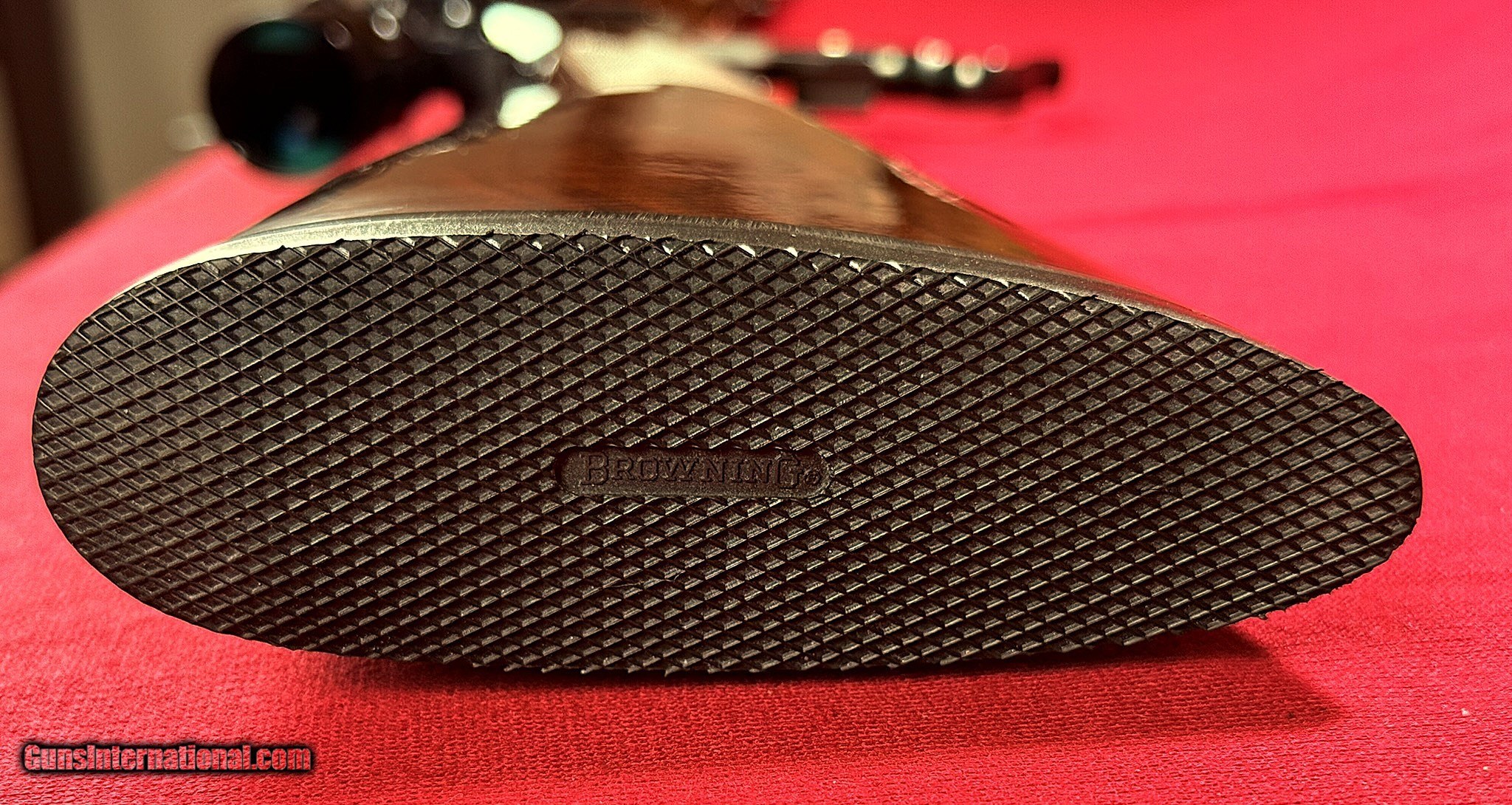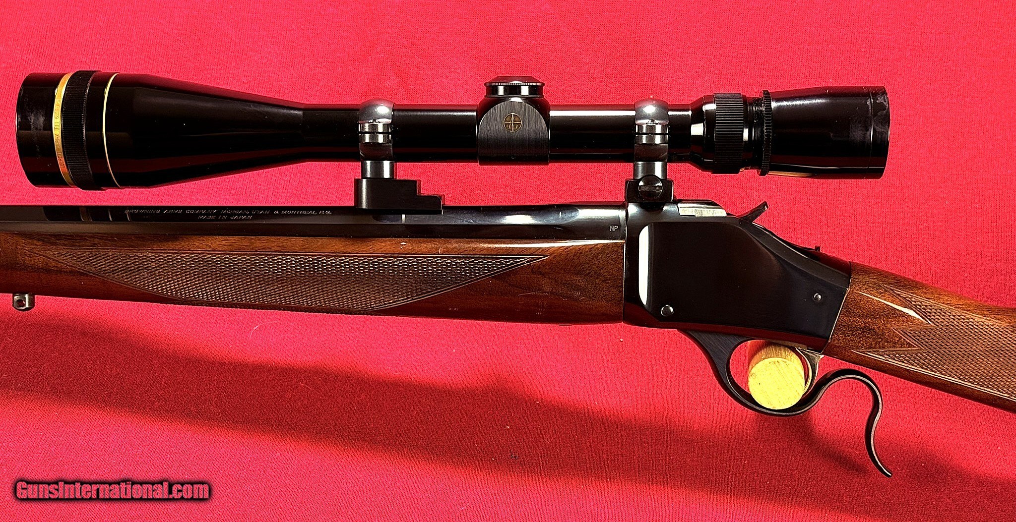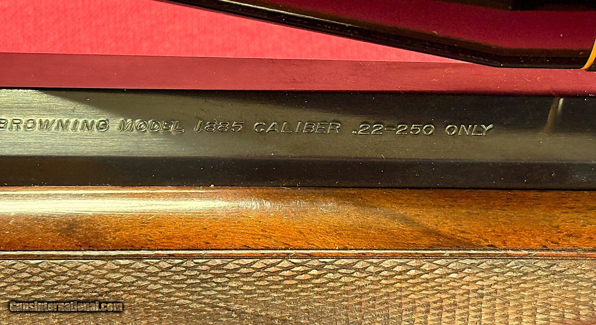 Beautiful BROWNING 1885 Rifle in 22-250. It comes with a Leupold 6.5 X 20 Vari-X III scope that looks brand new. The rifle is in excellent shape with virtually no wear on the bluing. According to the serial number, this one was made 30 years ago in 1995. The Walnut stock is really nice with some fiddleback in the buttstock. It is checkered in the original Winchester checkering pattern. There are a couple of small marks on the stock finish, most noticeable on the left side of the forearm just in front of the receiver. Other than that the stock is nearly perfect. The photos tell the story. This one has not been fired very much and the bore appears perfect. The falling block action works crisply, and I really like the exposed hammer. It has a octagon barrelthat measures 28 inches long. You should get some great velocity from this long barrel. Even with the long barrel, the rifle is shorter than most bolt actions with 24" barrels. The Leupold scope looks new and the optics are perfect. It has the fine plex crosshair that is really helpful when aiming at small ground squirrels at long range. I think that you will be very impressed with this one, especially with the scope.