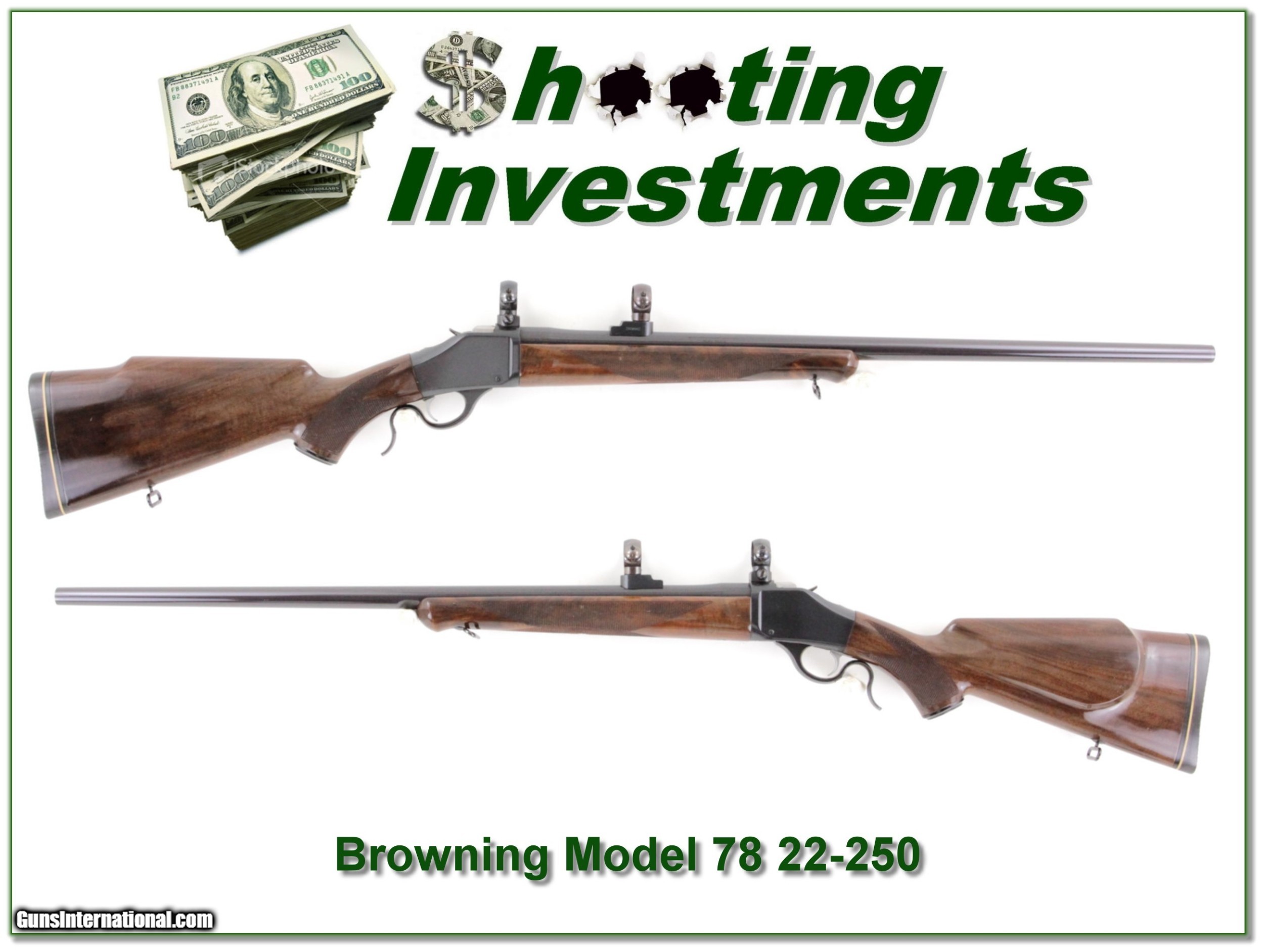 Description: This is a Browning 78 Single Shot rifle. It is a 22-250 Remington with the 26in heavy target barrel. It is in excellent condition with no marks of note. It comes with factory sling swivels and Browning bases and rings as seen. This is a Shooting Investment. Shipping with insurance is $39. Please email me with any questions or larger pictures. (Consign your quality firearms with Shooting Investments for only 12%! Let me know if you have any you would like to sell!) 18-0873 Payment: Payment is by Money Order, Cashiers Check or Personal Check. I can now also accept MasterCard and Visa with a 3% convenience fee. PayPal can be used for some items but never firearms. Please let us know if you would like to pay via PayPal. Shipping: The shipping charge will be listed in each description. It is $39 for most long guns and $29 for most handguns. Some heavy guns or those insured for over $2000 will be higher. Shipments to Alaska and Hawaii are higher because air shipment is required. Most firearms are shipped on Tuesday and Thursday and usually in 5 days of receipt of payment. We package all shipments carefully and insure them. For long guns you can purchase a new Plano case for $19. They now cost us $22 when buying 100 at a time. Optics are shipped Priority Mail and most other non-firearm shipments are shipped First Class. Returns: Our return policy is simple. If for any reason you are not pleased with your purchase, you may return your item for a full refund of purchase price. Ammunition cannot be returned. It is important to us that you are happy. Guns cannot be fired or dissembled before returning them and they must be returned in the same condition as received. Notification of a return must occur with-in 3 days of receipt at your dealer. Shipping, convenience and dealer fees are not refundable and are the responsibility of the buyer. Lay-a-way: If needed, we offer a 60 day lay-a-way option on most firearms. It is 1/3 now, 1/3 in 30 days and 1/3 in 60 days. Lay-a-way firearm sales are final and if not completed the first payment cannot be returned. Consigning your firearms with Shooting Investments: We will help you get top dollar for your firearms. While most local guns shops charge 20% or more, our fee is only 12% with a minimum of $75. At your local gun shop it might take months to sell. Selling on-line provides instant access to thousands of interested buyers. You won’t find any other on-line dealer willing to sell your firearms for only 12% or listing every gun on 3 separate s. Selling through an House typically costs the seller 15% and the buyer an addition 15% (so 30%) and you have to wait several months to sell and longer to receive funds. If properly priced, we will sell your firearms in a few weeks. Send us an email or give us a call and we’ll explain how easy it is for you to get top dollar. Trading: Trading for use is really just buying your gun to re-sell. If you have a gun you want to trade, please email a picture and we will let you know what we can give or it. You will always get more if we sell it for you on consignment. Help for California Buyers: We are happy to ship to California. It is the buyer’s responsibility to make sure any item you buy is legal in your state. We are also happy to help with your purchase of a firearm from someone other than us. If you see a gun you would like to buy but the seller can’t or won’t ship to California they can ship to use and we’ll then ship it to your California dealer. The cost for this service is only $30 + shipping. Let us know if we can help! SOLD |