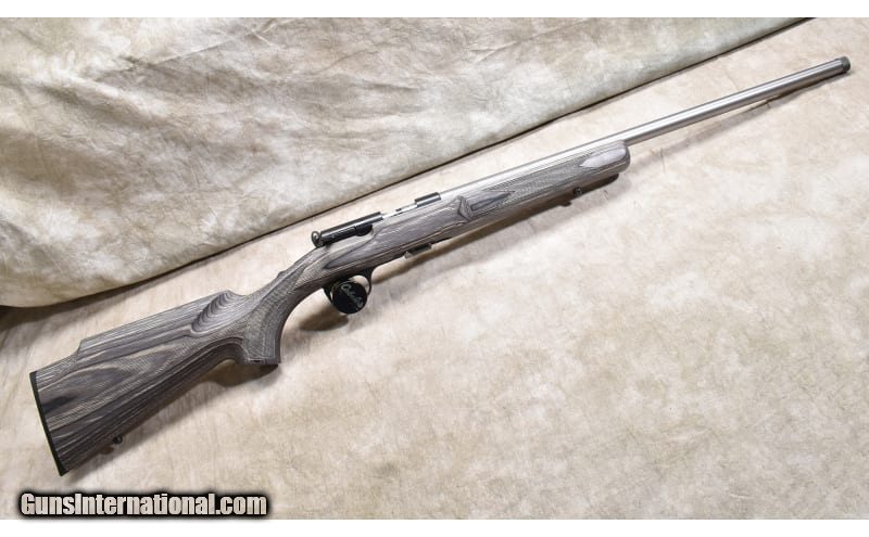 Description: The features of this T-bolt include stainless steel barrel with threaded muzzle, a rotary 10-rund magazine, a grey laminated hardwood Monte Carlo stock, and a shiny bore. It hasn't been fired much if at all. .22 Long Rifle SOLD Chambers: 10 rounds Metal Condition: Excellent. Wood Condition: Excellent. Bore Condition: Shiny and bright. Barrels: 22-inch stainless steel with threaded muzzle Triggers: Factory trigger. Stock Dimensions: 13-3/8 inch LOP Fore End: Checkered grey laminate beavertail. Butt Pad: Black plate. Weight: 5 lb - 14 oz Sights: Drilled and tapped for your choice of scope. Item Location: Rogers |