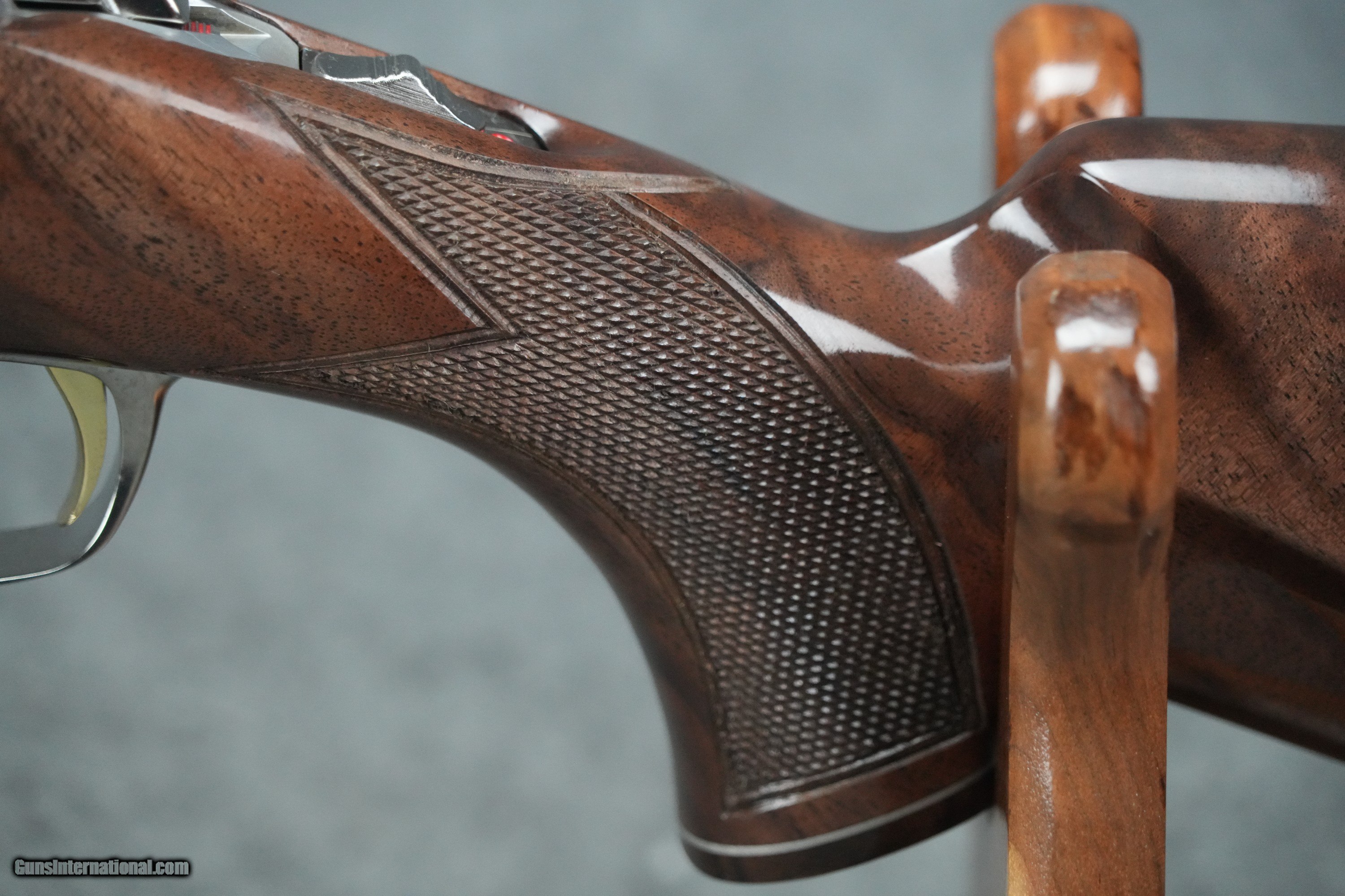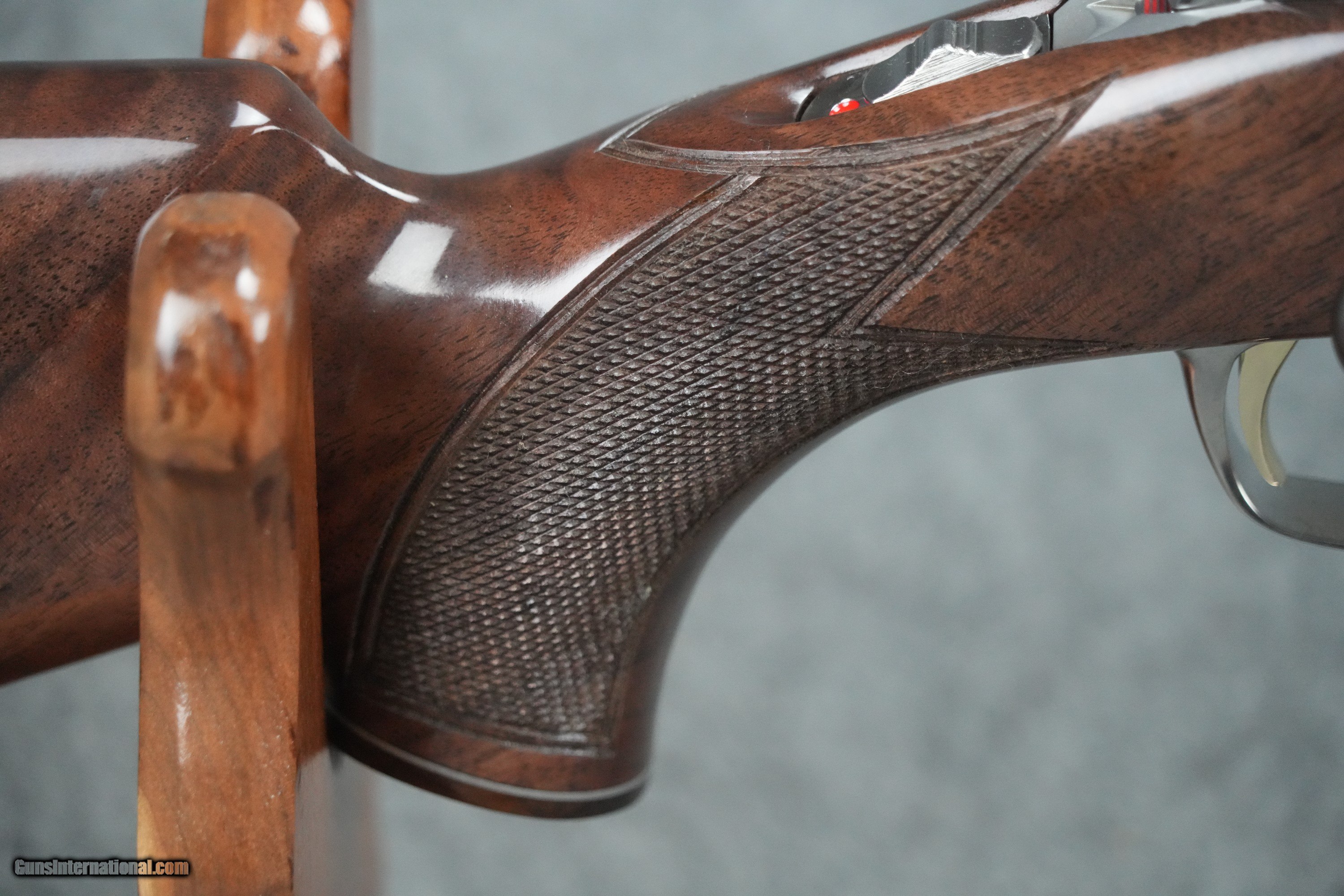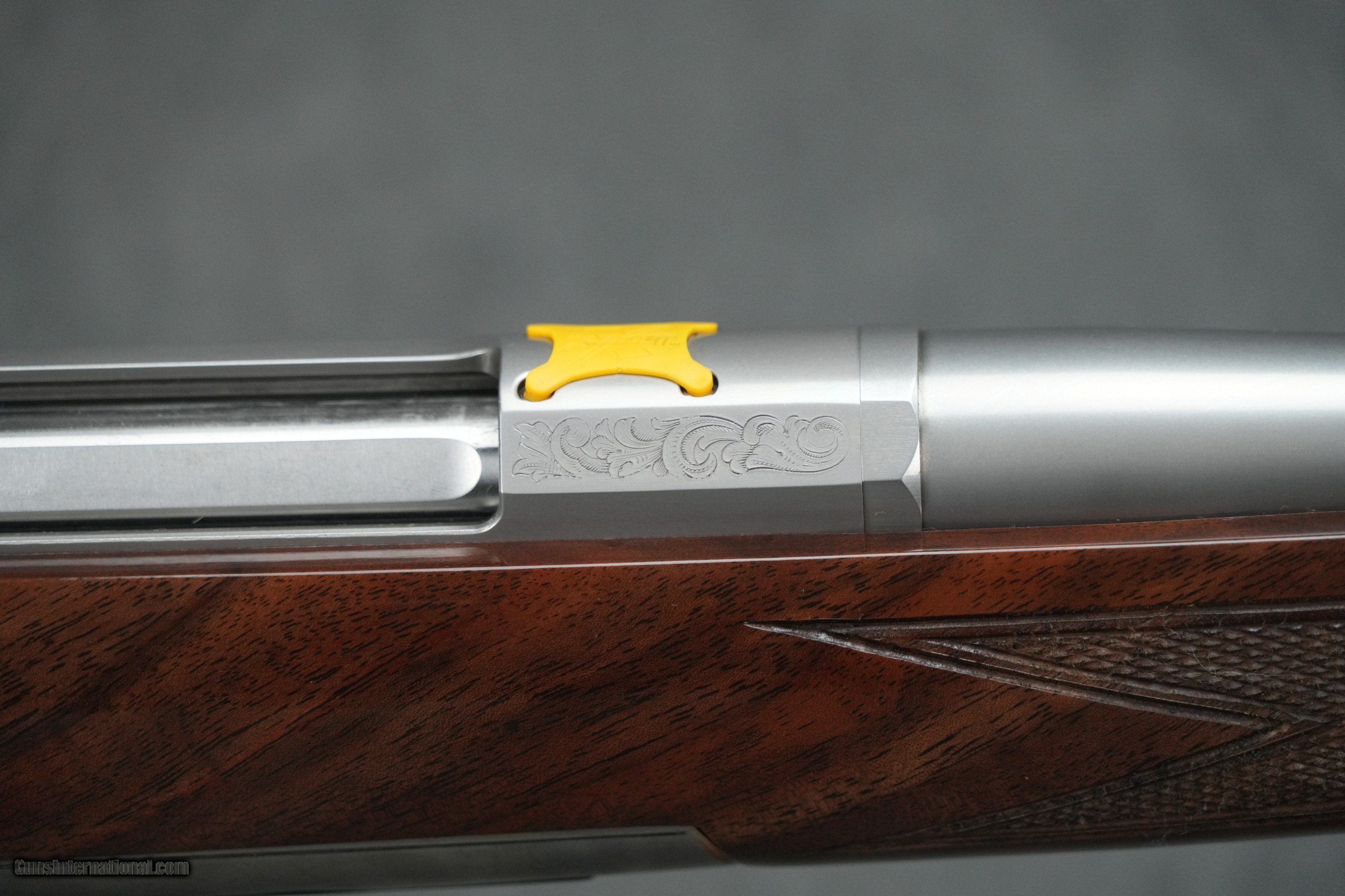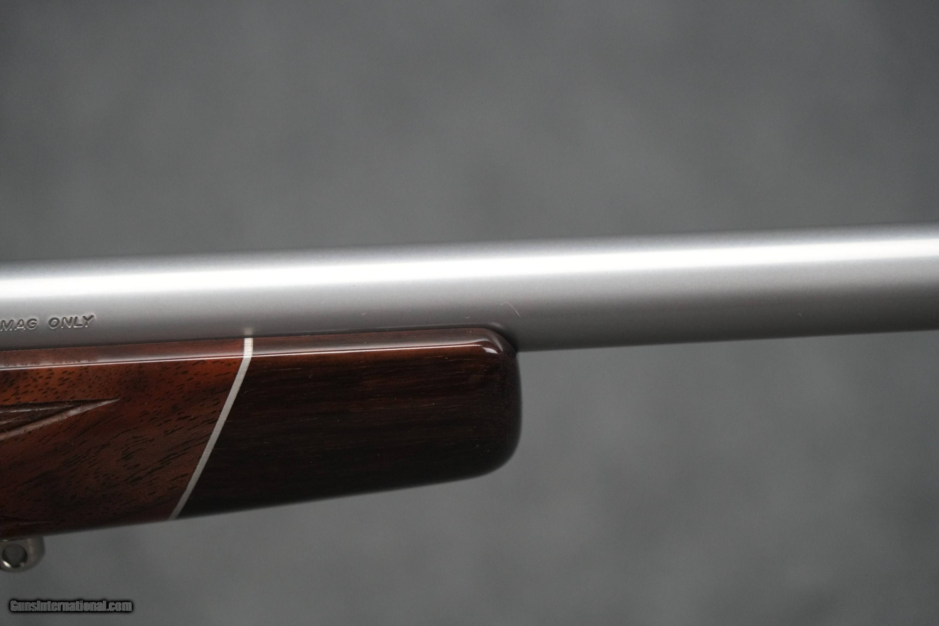 Description: Browning has over 50 years of experience with bolt-action high-powered rifles. Today's X-Bolt rifle inherits the strongest, most note-worthy features of its predecessors. The X-Bolt White Gold model has a Monte Carlo style stock, a feature recognized as the comb steps sharply down toward the heel of the buttstock, allowing more contact between the recoil pad of the stock and the shooter's shoulder. With this design, the recoil of the fired shell comes directly back or in-line with the stronger part of the inner shoulder, making the rifle more pleasant to shoot, especially when a long day at the range is expected. It is okay for some guns to be referred to as "beautiful" even though it is still a hard working hunting tool. The X-Bolt White Gold is beautifully adorned with a polished and engraved stainless steel receiver and stainless steel barrel. The stock is gloss-finished and finely checkered with rosewood fore-end and grip caps. X-Bolt White Gold Medallion Features Polished, engraved stainless steel receiver Sporter contour barrel for the ideal blend of accuracy and weight savings Raised cheekpiece Gloss finish Grade IV/V checkered walnut stock with rosewood fore-end tip and grip cap Action Length Long Action Caliber 300 Win Mag Barrel Length 26 Overall Length 46 3/4 Length of Pull 13 5/8 Drop at Comb 3/4 Drop at Heel 1 7/16 Weight 7 lbs 0 oz Magazine Capacity 3 Twist Rate 10 Barrel Finish Satin Stock Finish Gloss Wood Grade Grade IV/V Receiver Finish Satin Chamber Finish Polished Barrel Material Stainless Barrel Contour Sporter Stock Material Black Walnut Recoil Pad Inflex 1, Small Pistol Grip Cap Rosewood Checkering Cut 18 LPI Sling Swivel Studs Nickel Receiver Material Stainless Trigger Finish Gold Plated Bolt Slide Finish High Gloss Magazine Type Detachable Trigger Material Alloy Trigger Guard Material Alloy Trigger Guard Engraving Buck Mark in Gold Floor Plate Material Composite Drilled and Tapped for Scope Yes SOLD Rifle Caliber: .300 Winchester Magnum Manufacturer: Browning Model: X-Bolt White Gold Medallion Barrel Length: 26" Barrel Condition: BRAND NEW |