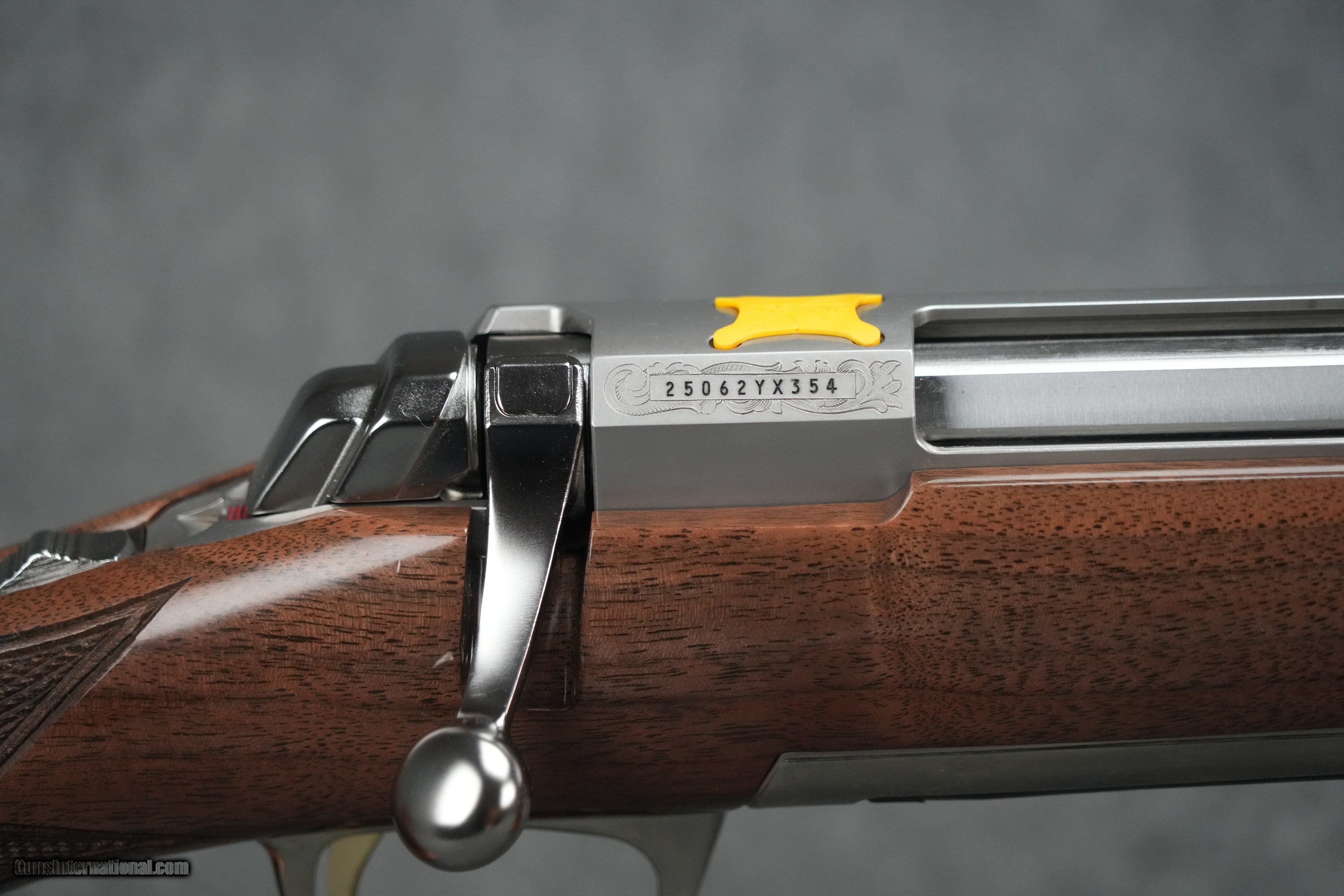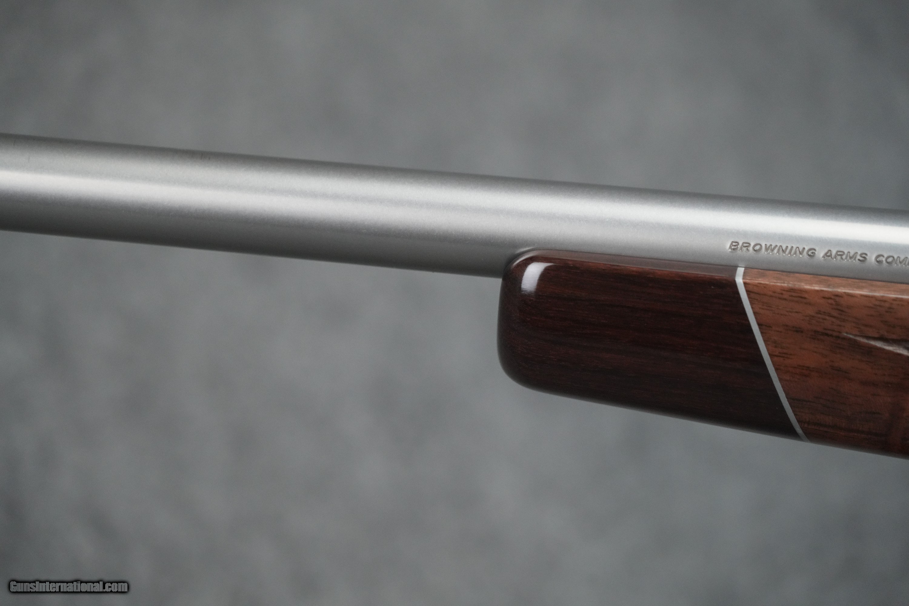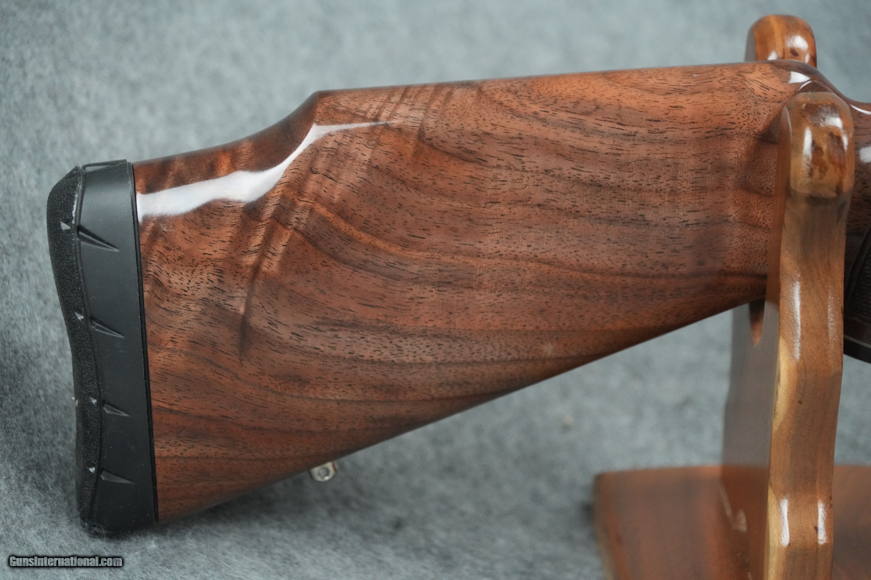 Description: Browning has over 50 years of experience with bolt-action high-powered rifles. Today's X-Bolt rifle inherits the strongest, most note-worthy features of its predecessors. The X-Bolt White Gold model has a Monte Carlo style stock, a feature recognized as the comb steps sharply down toward the heel of the buttstock, allowing more contact between the recoil pad of the stock and the shooter's shoulder. With this design, the recoil of the fired shell comes directly back or in-line with the stronger part of the inner shoulder, making the rifle more pleasant to shoot, especially when a long day at the range is expected. It is okay for some guns to be referred to as "beautiful" even though it is still a hard working hunting tool. The X-Bolt White Gold is beautifully adorned with a polished and engraved stainless steel receiver and stainless steel barrel. The stock is gloss-finished and finely checkered with rosewood fore-end and grip caps. X-Bolt White Gold Medallion Features Polished, engraved stainless steel receiver Sporter contour barrel for the ideal blend of accuracy and weight savings Raised cheekpiece Gloss finish Grade IV/V checkered walnut stock with rosewood fore-end tip and grip cap Action Length Long Action Caliber 300 Win Mag Barrel Length 26 Overall Length 46 3/4 Length of Pull 13 5/8 Drop at Comb 3/4 Drop at Heel 1 7/16 Weight 7 lbs 0 oz Magazine Capacity 3 Twist Rate 10 Barrel Finish Satin Stock Finish Gloss Wood Grade Grade IV/V Receiver Finish Satin Chamber Finish Polished Barrel Material Stainless Barrel Contour Sporter Stock Material Black Walnut Recoil Pad Inflex 1, Small Pistol Grip Cap Rosewood Checkering Cut 18 LPI Sling Swivel Studs Nickel Receiver Material Stainless Trigger Finish Gold Plated Bolt Slide Finish High Gloss Magazine Type Detachable Trigger Material Alloy Trigger Guard Material Alloy Trigger Guard Engraving Buck Mark in Gold Floor Plate Material Composite Drilled and Tapped for Scope Yes SOLD Rifle Caliber: .300 Winchester Magnum Manufacturer: Browning Model: X-Bolt White Gold Medallion Barrel Length: 26" Barrel Condition: BRAND NEW |