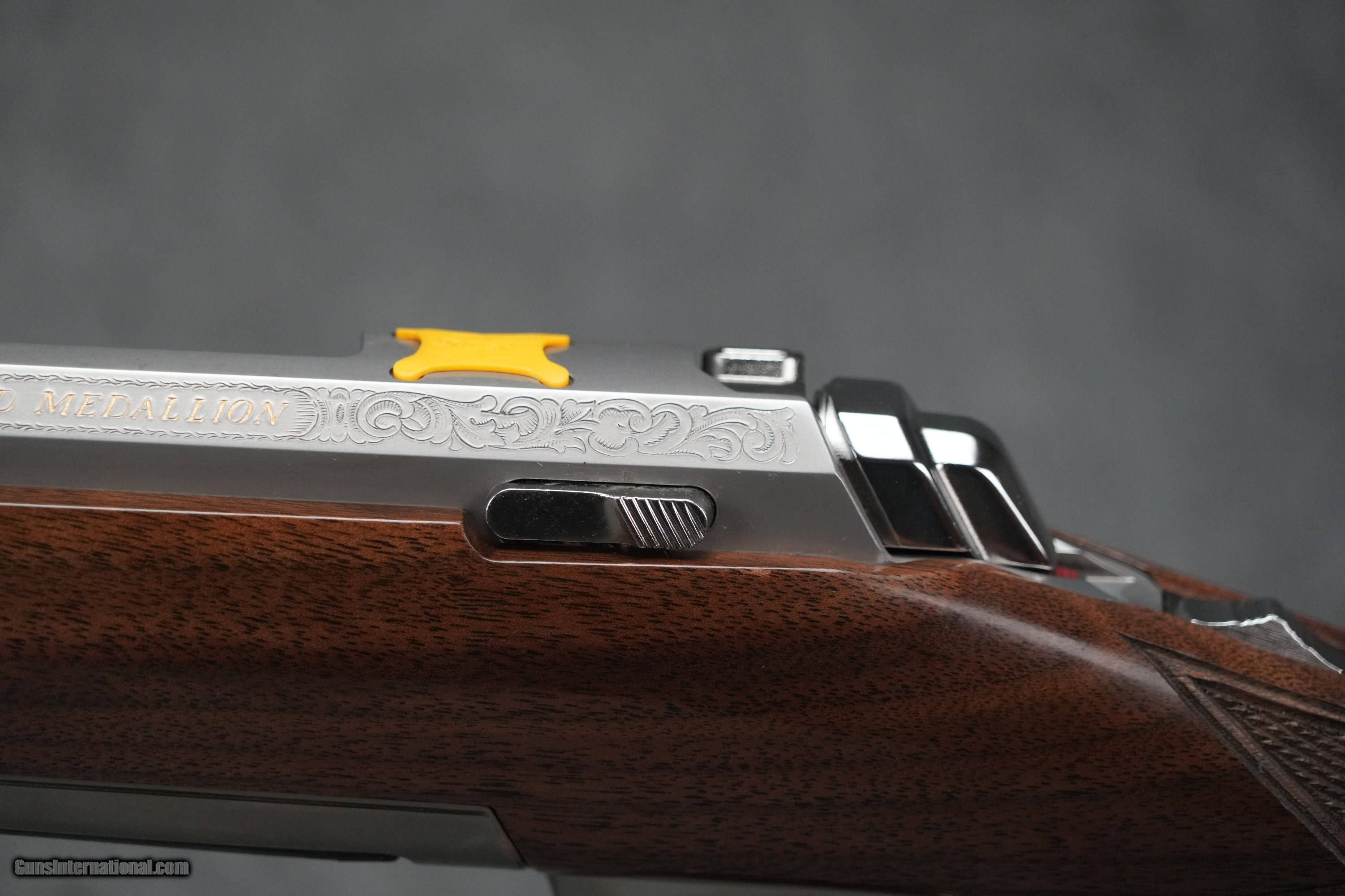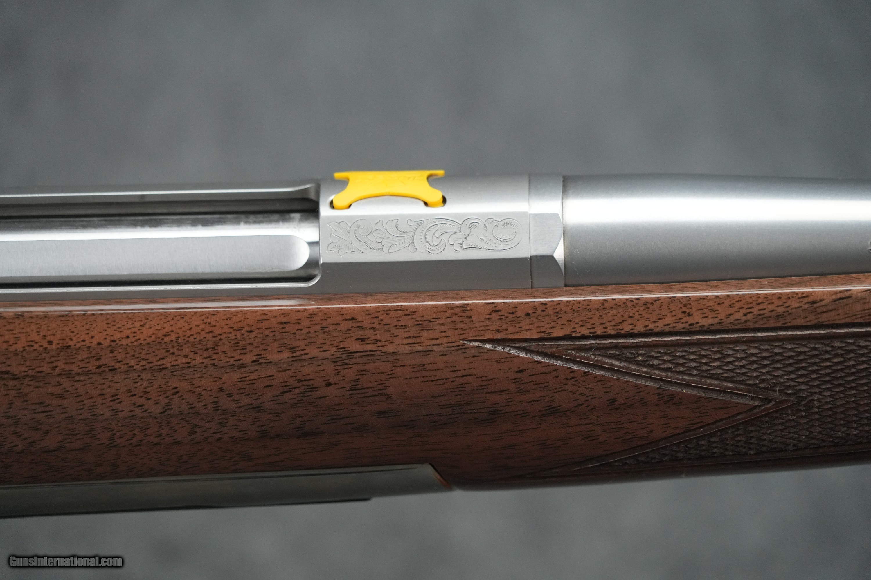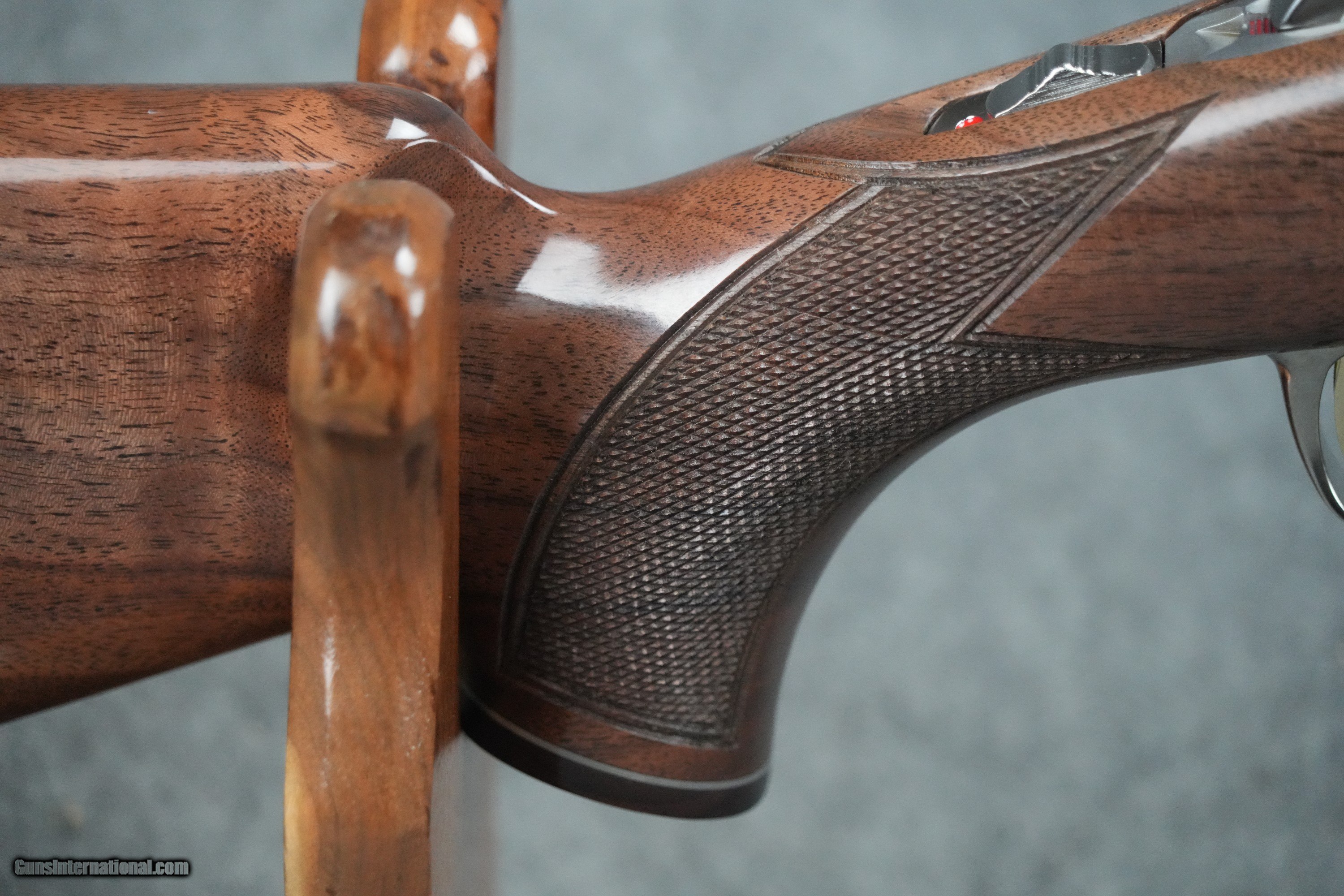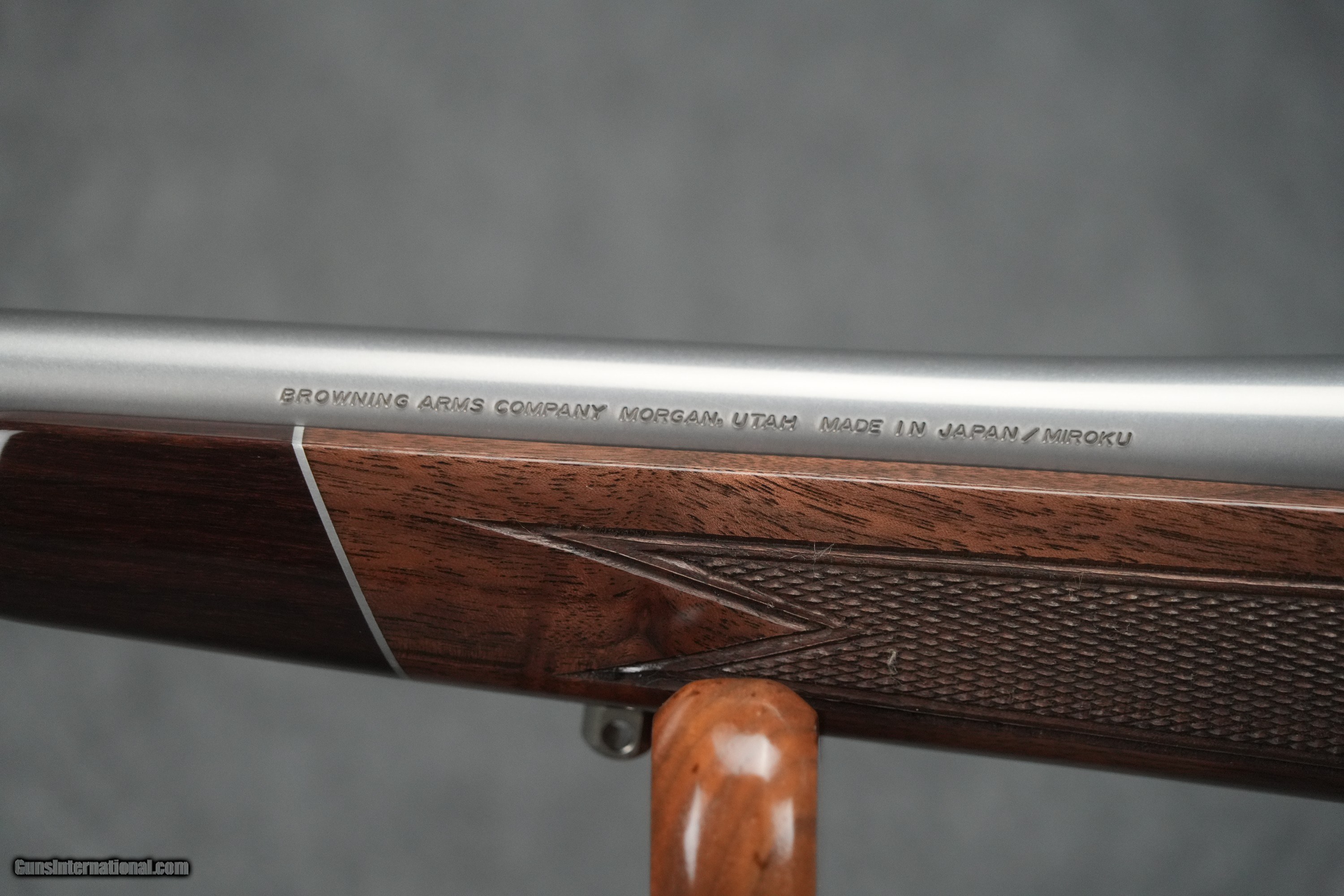 Description: Browning has over 50 years of experience with bolt-action high-powered rifles. Today's X-Bolt rifle inherits the strongest, most note-worthy features of its predecessors. The X-Bolt White Gold model has a Monte Carlo style stock, a feature recognized as the comb steps sharply down toward the heel of the buttstock, allowing more contact between the recoil pad of the stock and the shooter's shoulder. With this design, the recoil of the fired shell comes directly back or in-line with the stronger part of the inner shoulder, making the rifle more pleasant to shoot, especially when a long day at the range is expected. It is okay for some guns to be referred to as "beautiful" even though it is still a hard working hunting tool. The X-Bolt White Gold is beautifully adorned with a polished and engraved stainless steel receiver and stainless steel barrel. The stock is gloss-finished and finely checkered with rosewood fore-end and grip caps. X-Bolt White Gold Medallion Features Polished, engraved stainless steel receiver Sporter contour barrel for the ideal blend of accuracy and weight savings Raised cheekpiece Gloss finish Grade IV/V checkered walnut stock with rosewood fore-end tip and grip cap Action Length Long Action Caliber 300 Win Mag Barrel Length 26 Overall Length 46 3/4 Length of Pull 13 5/8 Drop at Comb 3/4 Drop at Heel 1 7/16 Weight 7 lbs 0 oz Magazine Capacity 3 Twist Rate 10 Barrel Finish Satin Stock Finish Gloss Wood Grade Grade IV/V Receiver Finish Satin Chamber Finish Polished Barrel Material Stainless Barrel Contour Sporter Stock Material Black Walnut Recoil Pad Inflex 1, Small Pistol Grip Cap Rosewood Checkering Cut 18 LPI Sling Swivel Studs Nickel Receiver Material Stainless Trigger Finish Gold Plated Bolt Slide Finish High Gloss Magazine Type Detachable Trigger Material Alloy Trigger Guard Material Alloy Trigger Guard Engraving Buck Mark in Gold Floor Plate Material Composite Drilled and Tapped for Scope Yes SOLD Rifle Caliber: .300 Winchester Magnum Manufacturer: Browning Model: X-Bolt White Gold Medallion Barrel Length: 26" Barrel Condition: BRAND NEW |