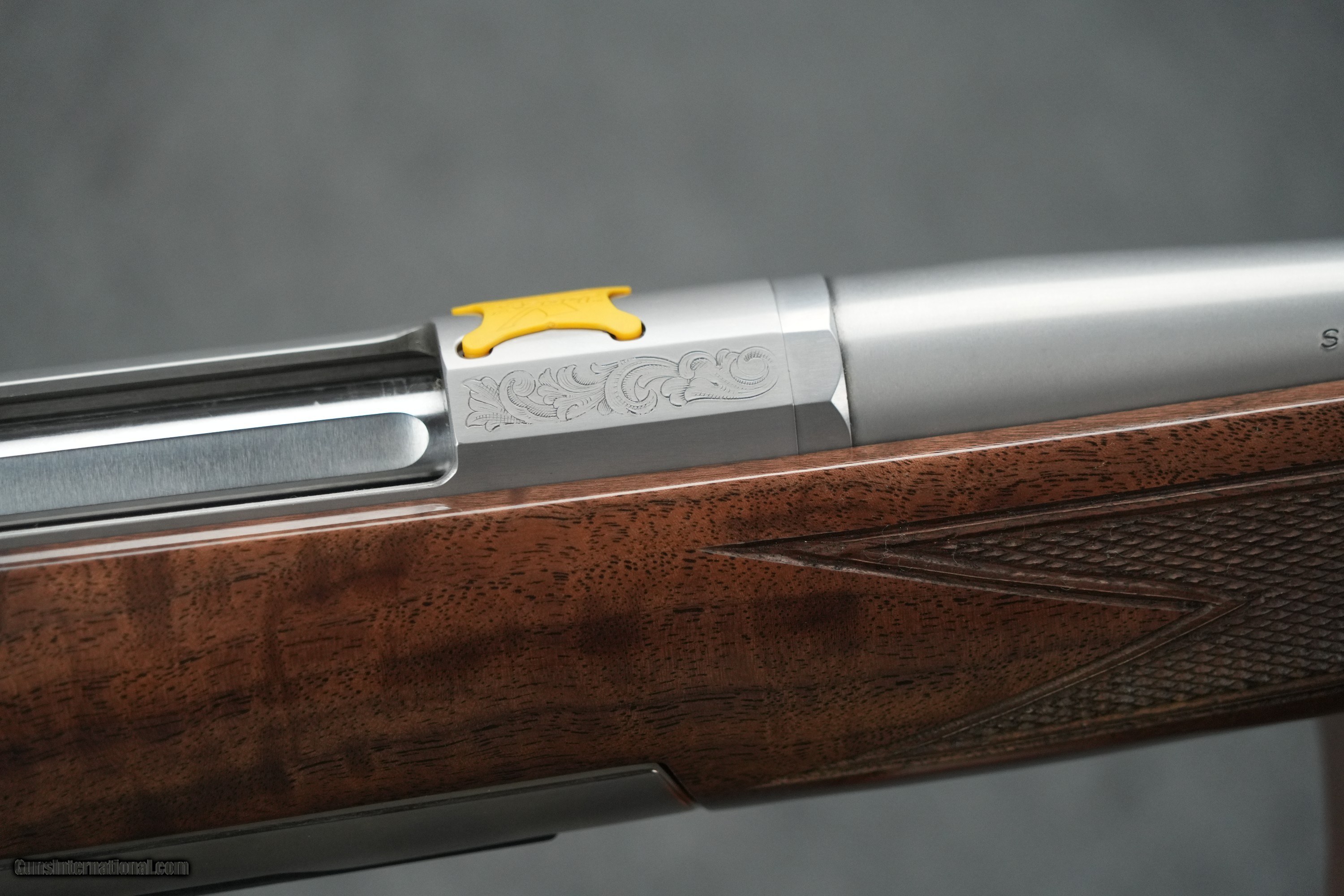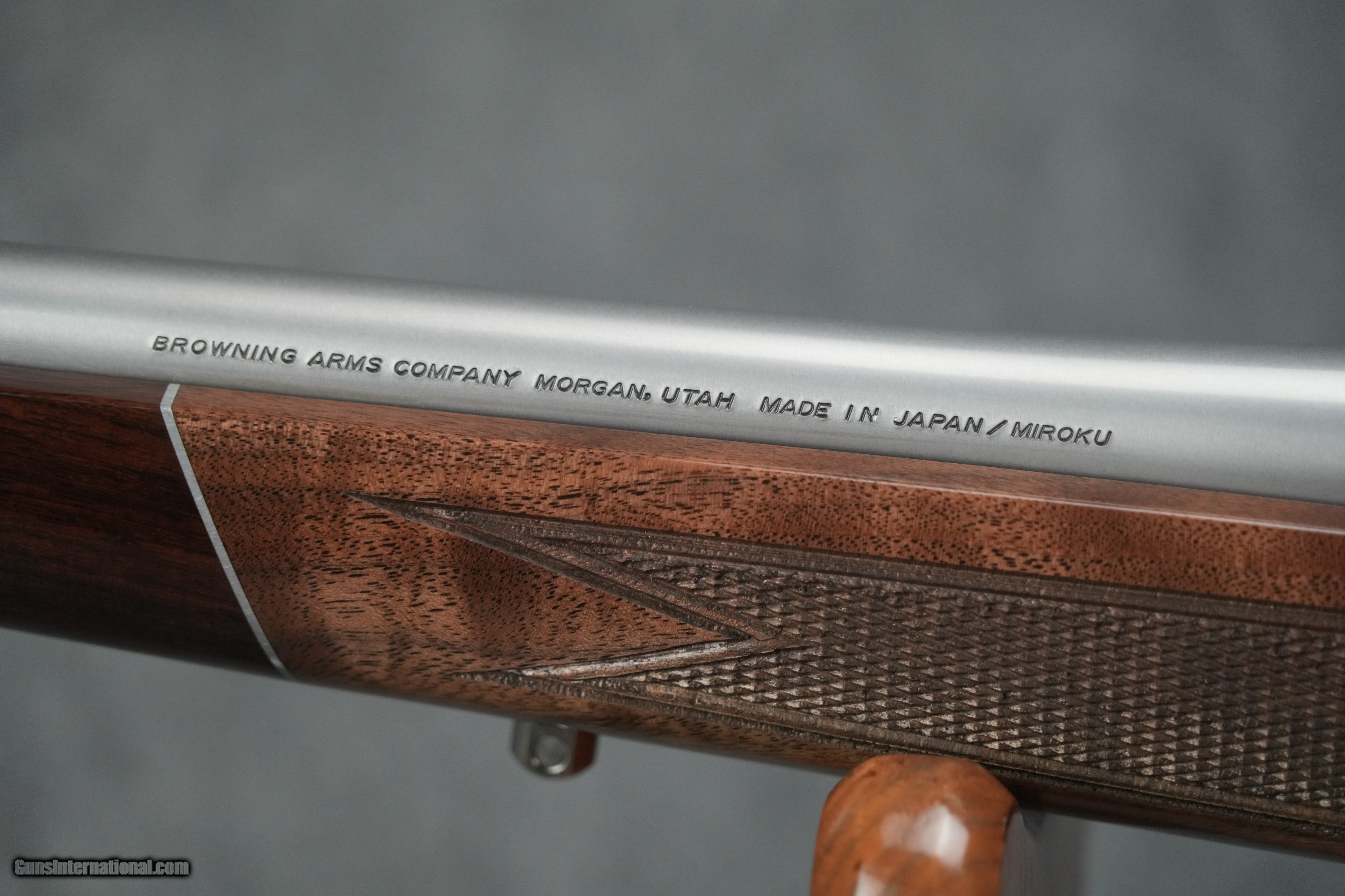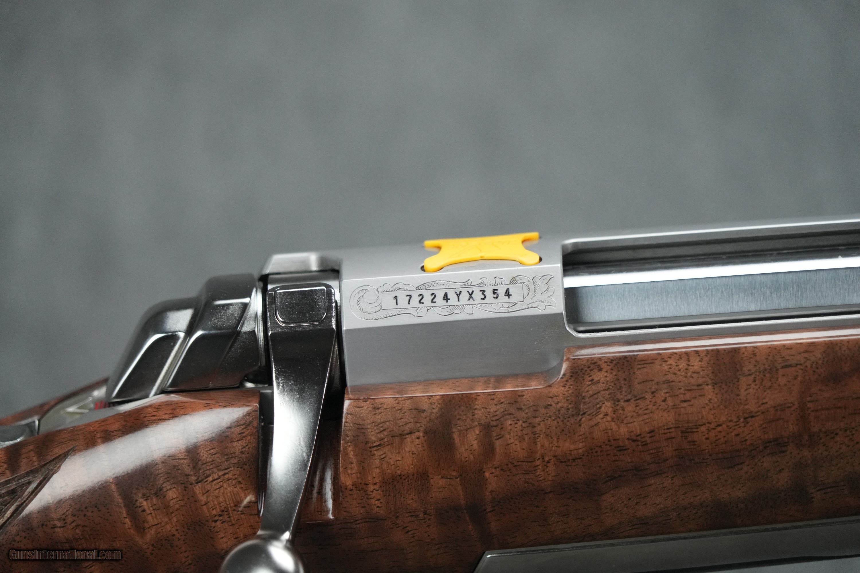 Description: Browning has over 50 years of experience with bolt-action high-powered rifles. Today's X-Bolt rifle inherits the strongest, most note-worthy features of its predecessors. The X-Bolt White Gold model has a Monte Carlo style stock, a feature recognized as the comb steps sharply down toward the heel of the buttstock, allowing more contact between the recoil pad of the stock and the shooter's shoulder. With this design, the recoil of the fired shell comes directly back or in-line with the stronger part of the inner shoulder, making the rifle more pleasant to shoot, especially when a long day at the range is expected. It is okay for some guns to be referred to as "beautiful" even though it is still a hard working hunting tool. The X-Bolt White Gold is beautifully adorned with a polished and engraved stainless steel receiver and stainless steel barrel. The stock is gloss-finished and finely checkered with rosewood fore-end and grip caps. X-Bolt White Gold Medallion Features Polished, engraved stainless steel receiver Sporter contour barrel for the ideal blend of accuracy and weight savings Raised cheekpiece Gloss finish Grade IV/V checkered walnut stock with rosewood fore-end tip and grip cap Action Length Short Action Caliber 308 Win Barrel Length 22 Overall Length 41 3/4 Length of Pull 13 5/8 Drop at Comb 3/4 Drop at Heel 1 7/16 Magazine Capacity 4 Twist Rate 12 Barrel Finish Satin Stock Finish Gloss Wood Grade Grade IV/V Receiver Finish Satin Chamber Finish Polished Barrel Material Stainless Barrel Contour Sporter Stock Material Black Walnut Recoil Pad Inflex 1, Small Pistol Grip Cap Rosewood Checkering Cut 18 LPI Sling Swivel Studs Nickel Receiver Material Stainless Trigger Finish Gold Plated Bolt Slide Finish High Gloss Magazine Type Detachable Trigger Material Alloy Trigger Guard Material Alloy Trigger Guard Engraving Buck Mark in Gold Floor Plate Material Composite Drilled and Tapped for Scope Yes SOLD Rifle Caliber: .308 Winchester Manufacturer: Browning Model: X-Bolt White Gold Medallion Barrel Length: 22" Barrel Condition: BRAND NEW |