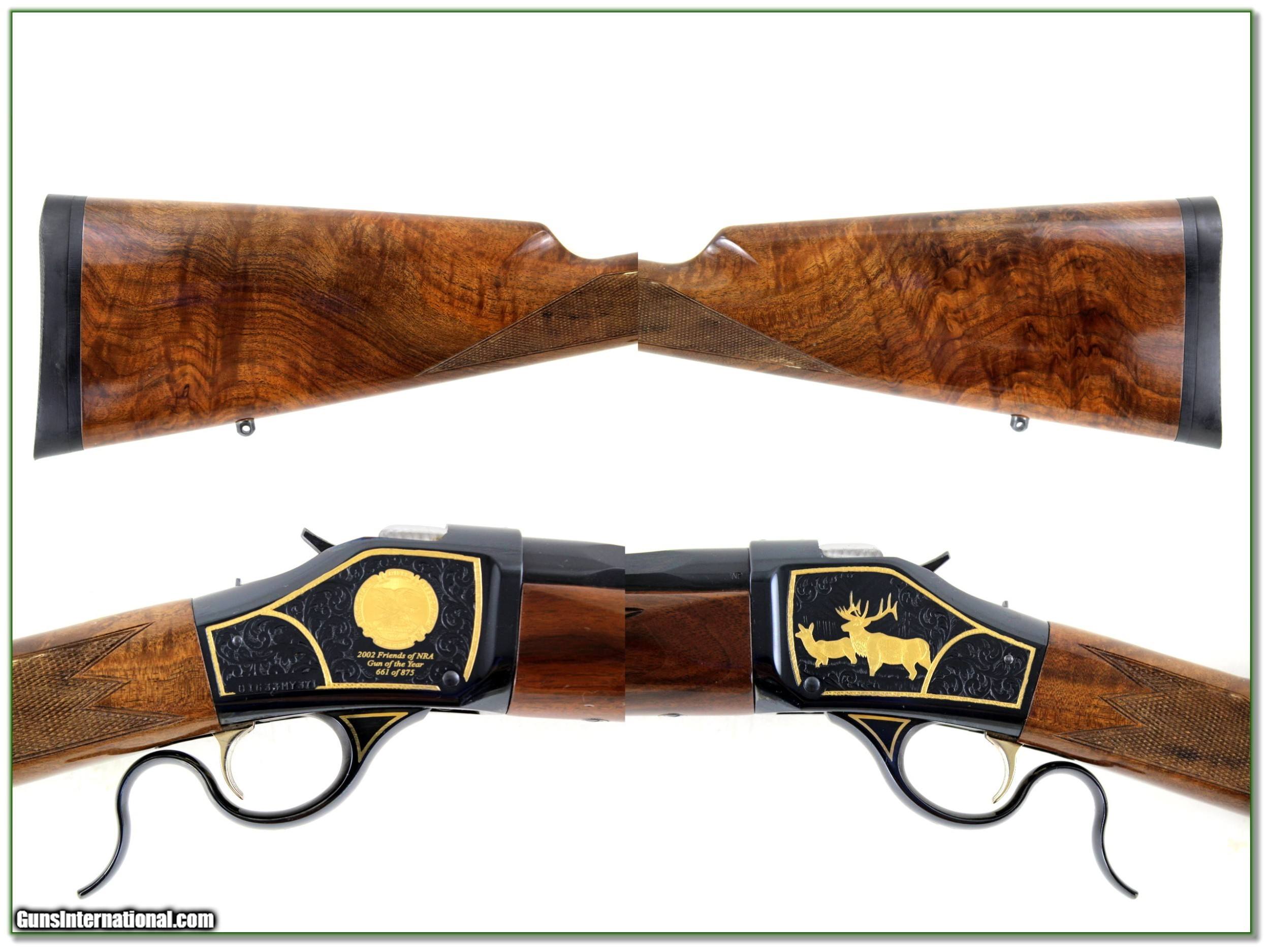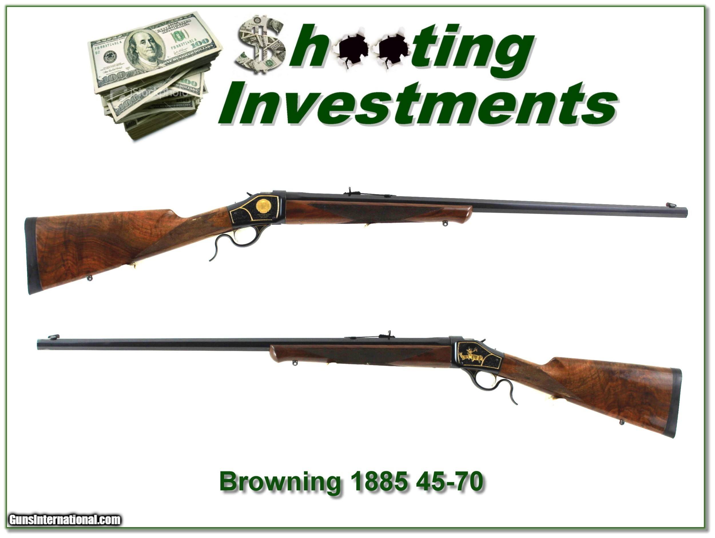 Description: This is a beautiful Browning 1885 Hi-Wall High Grade in 45-70. It is a 2002 NRA gun with gold Elk on one side and NRA emblem on the other. It has a long 28in octagonal barrel with high gloss blue and beautiful high-grade wood. I only find a couple minor handing marks. It will make a nice big bore! It is a real Shooting Investment! Shipping and insurance is $49. Please email me with any questions or larger pictures. (Consign your quality firearms with Shooting Investments for only 12%! Let me know if you have any you would like to sell!) 22-1062 Payment: Payment is by Money Order, Cashiers Check or Personal Check. I can now also accept Credit Cards (MasterCard, Visa, Discover & American Express) with a 3% convenience fee. Shipping: The shipping charge will be listed in each description. It is $49 for most long guns. Some heavy guns, over 48in boxes or those insured for over $2000 will be higher. Shipments to Alaska and Hawaii are higher because air shipment is required. Most firearms are shipped on Tuesday and Thursday and usually in 5 days of receipt of payment. We package all shipments carefully and insure them. Optics are shipped Priority Mail and most other non-firearm shipments are shipped First Class. Returns: Our return policy is simple. If for any reason you are not pleased with your purchase, you may return your item for a full refund of purchase price. Ammunition cannot be returned. It is important to us that you are happy. Guns cannot be fired or dissembled before returning them and they must be returned in the same condition as received. Notification of a return must occur with-in 3 days of receipt at your dealer. Shipping, convenience and dealer fees are not refundable and are the responsibility of the buyer. Lay-a-way: If needed, we offer a 60 day lay-a-way option on most firearms. It is 1/3 now, 1/3 in 30 days and 1/3 in 60 days. Lay-a-way firearm sales are final and if not completed the first payment cannot be returned. Consigning your firearms with Shooting Investments: We will help you get top dollar for your firearms. While most local guns shops charge 20% or more, our fee is only 12% with a minimum of $75. At your local gun shop it might take months to sell. Selling on-line provides instant access to thousands of interested buyers. You won’t find any other on-line dealer willing to sell your firearms for only 12% or listing every gun on 3 separate s. Selling through an House typically costs the seller 15% and the buyer an addition 15% (so 30%) and you have to wait several months to sell and longer to receive funds. If properly priced, we will sell your firearms in a few weeks. Send us an email or give us a call and we’ll explain how easy it is for you to get top dollar. Trading: Trading for use is really just buying your gun to re-sell. If you have a gun you want to trade, please email a picture and we will let you know what we can give or it. You will always get more if we sell it for you on consignment. Help for California Buyers: We are happy to ship to California. It is the buyer’s responsibility to make sure any item you buy is legal in your state. We are also happy to help with your purchase of a firearm from someone other than us. If you see a gun you would like to buy but the seller can’t or won’t ship to California they can ship to use and we’ll then ship it to your California dealer. The cost for this service is only $30 + shipping. Let us know if we can help! SOLD |
