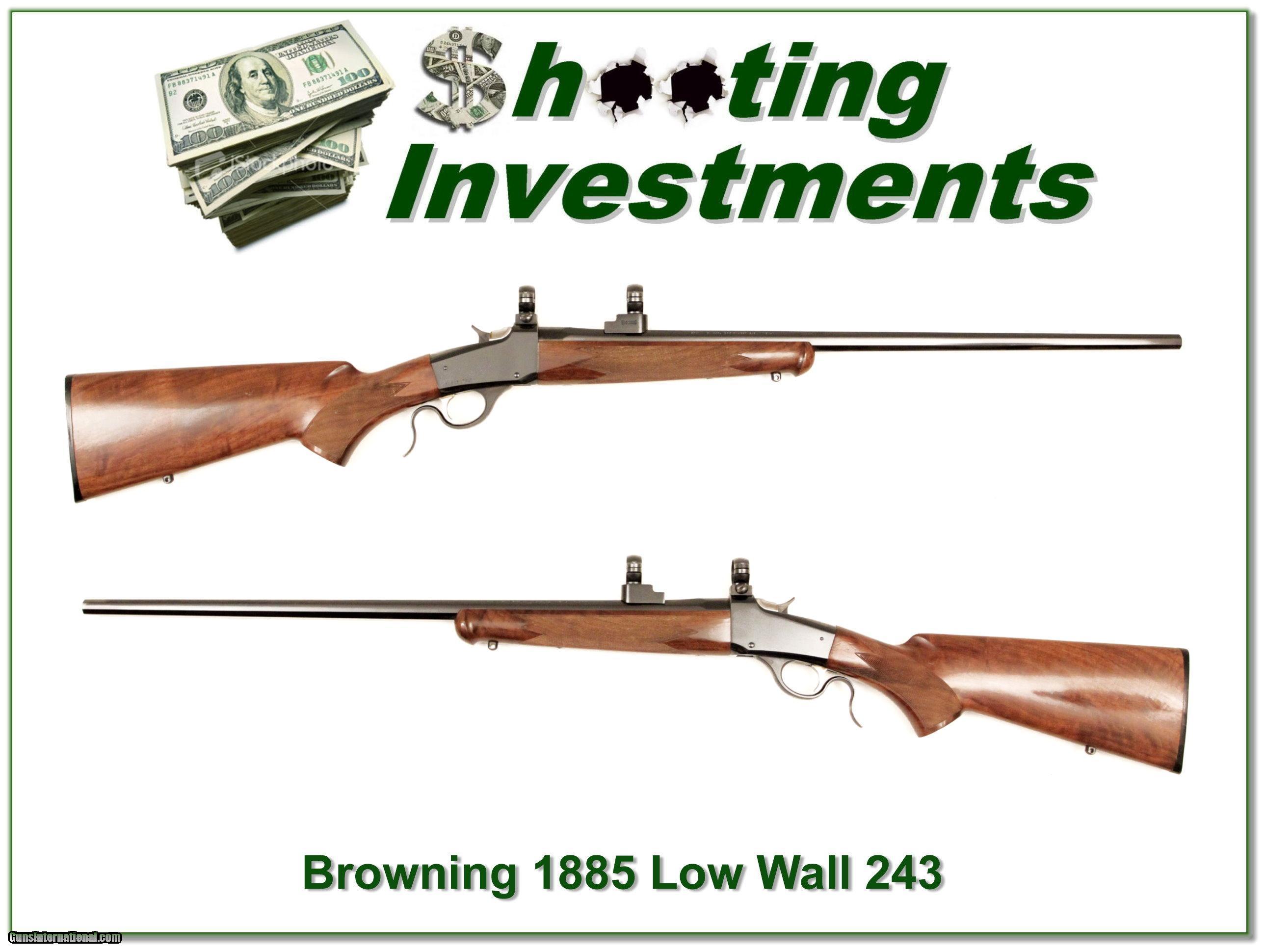 Description: This is a very nice Browning 1885 in 243 Winchester. The blue is excellent and shows no wear. The wood have beautiful figure only a few minor marks. It comes with factory bases and rings as shown. This is one you can use yet still expect to increase in value over time. It is a Shooting Investment for sure! Shipping and insurance is $35 or $15 more if you want it shipped in a new Plano hard case. Please email me with any questions or larger pictures. (I now consign quality firearms only 10%! Let me know if you have any you would like to sell!) [16-0668] Payment: Payment is by Money Order, Cashiers Check or Personal Check. I can now also accept MasterCard and Visa with a 3% convenience fee. PayPal can be used for some items but never firearms. Please let us know if you would like to pay via PayPal. Shipping: The shipping charge will be listed in each description. It is $35 for most guns. Some heavy guns or those insured for over $2000 will be higher. Shipments to Alaska and Hawaii are higher because air shipment is required. Most firearms are shipped within 5 days of receipt of payment. We prefer shipping at the beginning of the week to avoid firearms in transit over weekends. We package all shipments carefully and insure them for the full purchase price, rounded up to the next $100. In the unlikely event that damage occurs, it is important that you save all packaging material for the claims process. Optics are shipped Priority Mail and most other non-firearm shipments are shipped First Class. Returns: Our return policy is simple. If for any reason you are not pleased with your purchase, you may return your item for a refund. The only exception is ammunition, it cannot be returned. It is important to us that you are happy. Guns cannot be fired or dissembled before returning them and must be returned in the same condition as received. Notification of a return must occur with-in 3 days of receipt at your dealer. Shipping, convenience and dealer fees are not refundable and are the responsibility of the buyer. Lay-a-way: If needed, we offer a 60 day lay-a-way option on most firearms. It is 1/3 now, 1/3 in 30 days and 1/3 in 60 days. Lay-a-way firearm sales are final. Consigning your firearms with Shooting Investments: We will help you get top dollar for your firearms. While most local guns shops charge 20% or more, our fee is only 10% with a minimum of $50. At your local gun shop it might take months to sell. Selling on-line provides instant access to thousands of interested buyers. You won’t find any other on-line dealer willing to sell your firearms for only 10% or listing every gun on 4 separate s. Selling through an House typically costs the seller 15% and the buyer an addition 15% (so 30%) and you have to wait several months to sell and longer to receive funds. If properly priced, we will sell your firearms in a week or two. Send us an email or give us a call and we’ll explain how easy it is for you to get top dollar. Trading: We collect guns and usually just trade for guns we want to add to our collections. We often sell guns for others wanting to purchase one of ours. We find this the most fair to both of us. Our Commission is only 10% and we hold the gun you want until yours sells. Please contact us if you want to sell one of yours to buy one of ours. Help for California Buyers: We are happy to ship to California. It is the buyer’s responsibility to make sure any item you buy is legal in your state. We are also happy to help with your purchase of a firearm from someone other than us. If you see a gun you would like to buy but the seller can’t or won’t ship to California we can help. You buy the gun and have it shipped to us. We’ll then ship it to your California dealer. The cost for this service is only $30 + shipping. Let me know if we can help! SOLD |