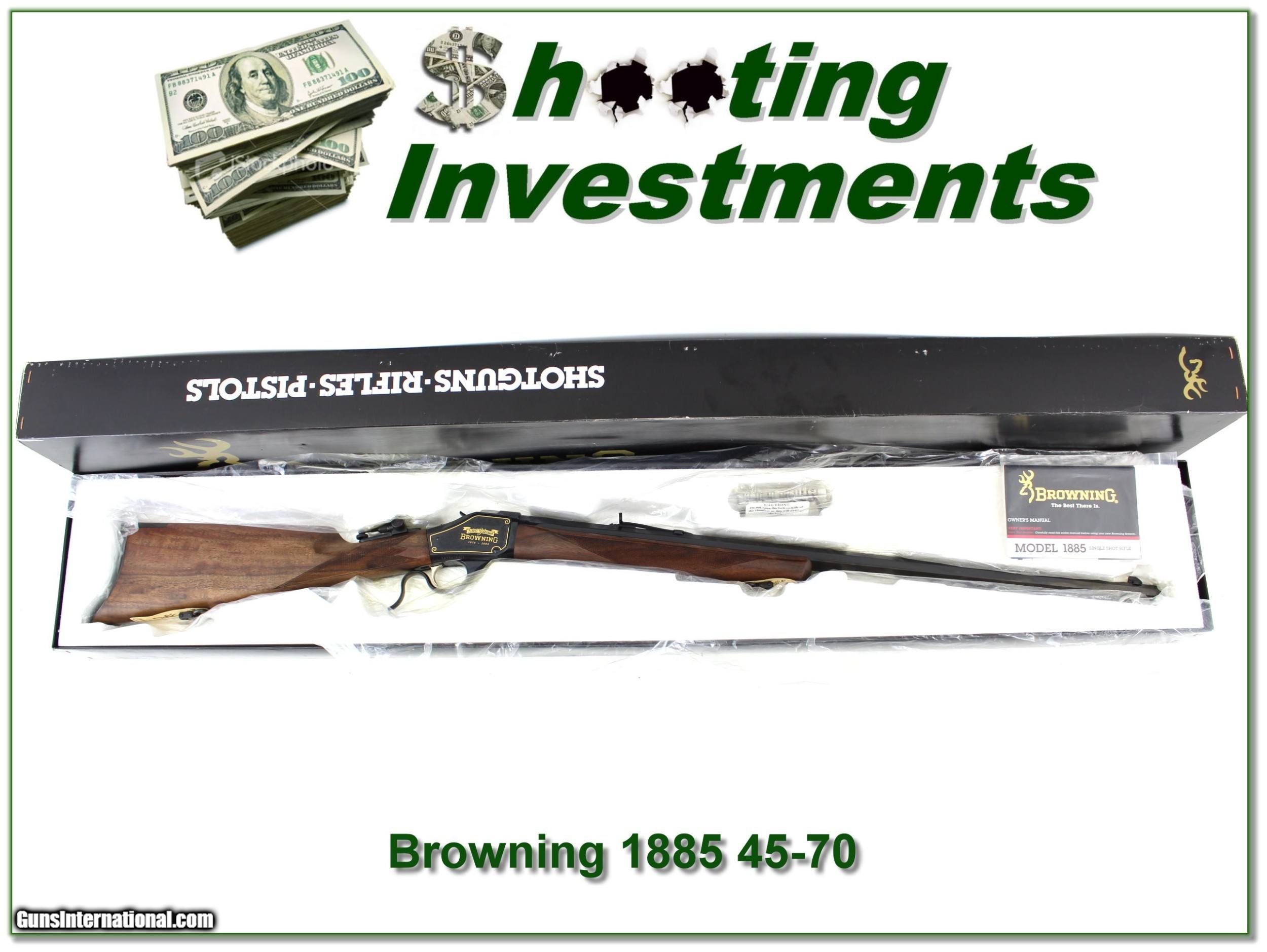 Description: Collectors, shooters and hunters, this is a new and unfired Browning 1885 in 45-70. It is the 125th Anniversary model. These are the traditional Hunters with high grade oil finished stocks and factory tang rear sights. The have 28in octagonal barrels. You can’t find one nicer this one. It comes in original box with papers. I am selling this one on consignment and as such lay-a-way can’t be used. It does of course have the standard 3-day inspection. Shipping and insurance is $39. Please email me with any questions or larger pictures. (Consign your quality firearms with Shooting Investments for only 12%! Let me know if you have any you would like to sell!) 21-0995 Payment: Payment is by Money Order, Cashiers Check or Personal Check. I can now also accept Credit Cards (MasterCard, Visa, Discover & American Express) with a 3% convenience fee. Shipping: The shipping charge will be listed in each description. It is $39 for most firearms. Some heavy guns or those insured for over $2000 will be higher. Shipments to Alaska and Hawaii are higher because air shipment is required. Most firearms are shipped on Tuesday and Thursday and usually in 5 days of receipt of payment. We package all shipments carefully and insure them. Optics are shipped Priority Mail and most other non-firearm shipments are shipped First Class. Returns: Our return policy is simple. If for any reason you are not pleased with your purchase, you may return your item for a full refund of purchase price. Ammunition cannot be returned. It is important to us that you are happy. Guns cannot be fired or dissembled before returning them and they must be returned in the same condition as received. Notification of a return must occur with-in 3 days of receipt at your dealer. Shipping, convenience and dealer fees are not refundable and are the responsibility of the buyer. Lay-a-way: If needed, we offer a 60 day lay-a-way option on most firearms. It is 1/3 now, 1/3 in 30 days and 1/3 in 60 days. Lay-a-way firearm sales are final and if not completed the first payment cannot be returned. Consigning your firearms with Shooting Investments: We will help you get top dollar for your firearms. While most local guns shops charge 20% or more, our fee is only 12% with a minimum of $75. At your local gun shop it might take months to sell. Selling on-line provides instant access to thousands of interested buyers. You won’t find any other on-line dealer willing to sell your firearms for only 12% or listing every gun on 3 separate s. Selling through an House typically costs the seller 15% and the buyer an addition 15% (so 30%) and you have to wait several months to sell and longer to receive funds. If properly priced, we will sell your firearms in a few weeks. Send us an email or give us a call and we’ll explain how easy it is for you to get top dollar. Trading: Trading for use is really just buying your gun to re-sell. If you have a gun you want to trade, please email a picture and we will let you know what we can give or it. You will always get more if we sell it for you on consignment. Help for California Buyers: We are happy to ship to California. It is the buyer’s responsibility to make sure any item you buy is legal in your state. We are also happy to help with your purchase of a firearm from someone other than us. If you see a gun you would like to buy but the seller can’t or won’t ship to California they can ship to use and we’ll then ship it to your California dealer. The cost for this service is only $30 + shipping. Let us know if we can help! SOLD |