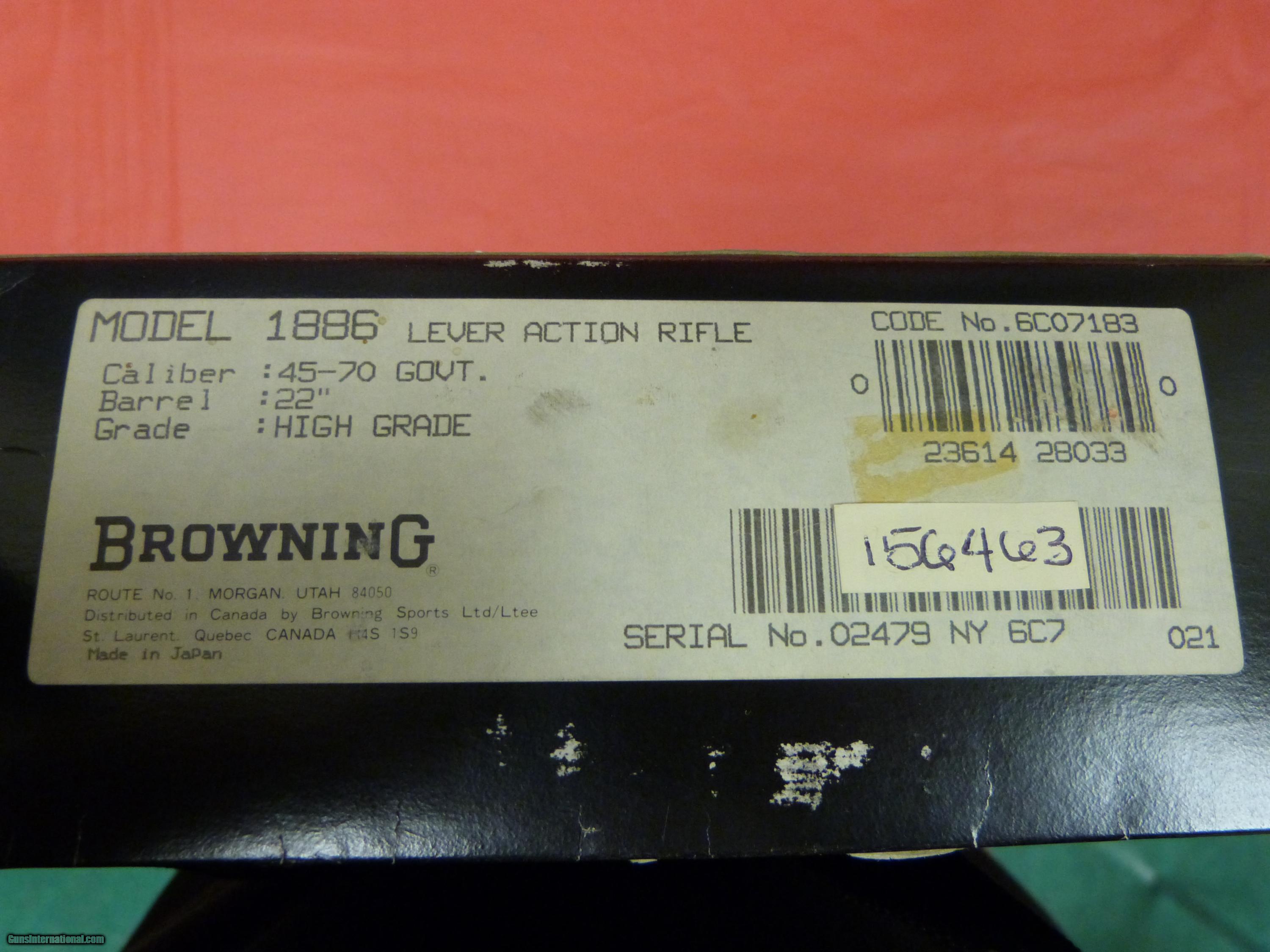 Description: Browning 1886 high grade chanbered in 45/70 22" bbl. This gun is new old stock. Brand new in box. Only $2295,This gun is an early gun with no tang safety ,FREE shipping . Please ask for Steve or Bob when calling. 716-833-2581 or 716-835-1546 SOLD Manufacturer: Browning Model: 1886 Caliber Info: 45/70 Condition: NIB Barrels: 22 |