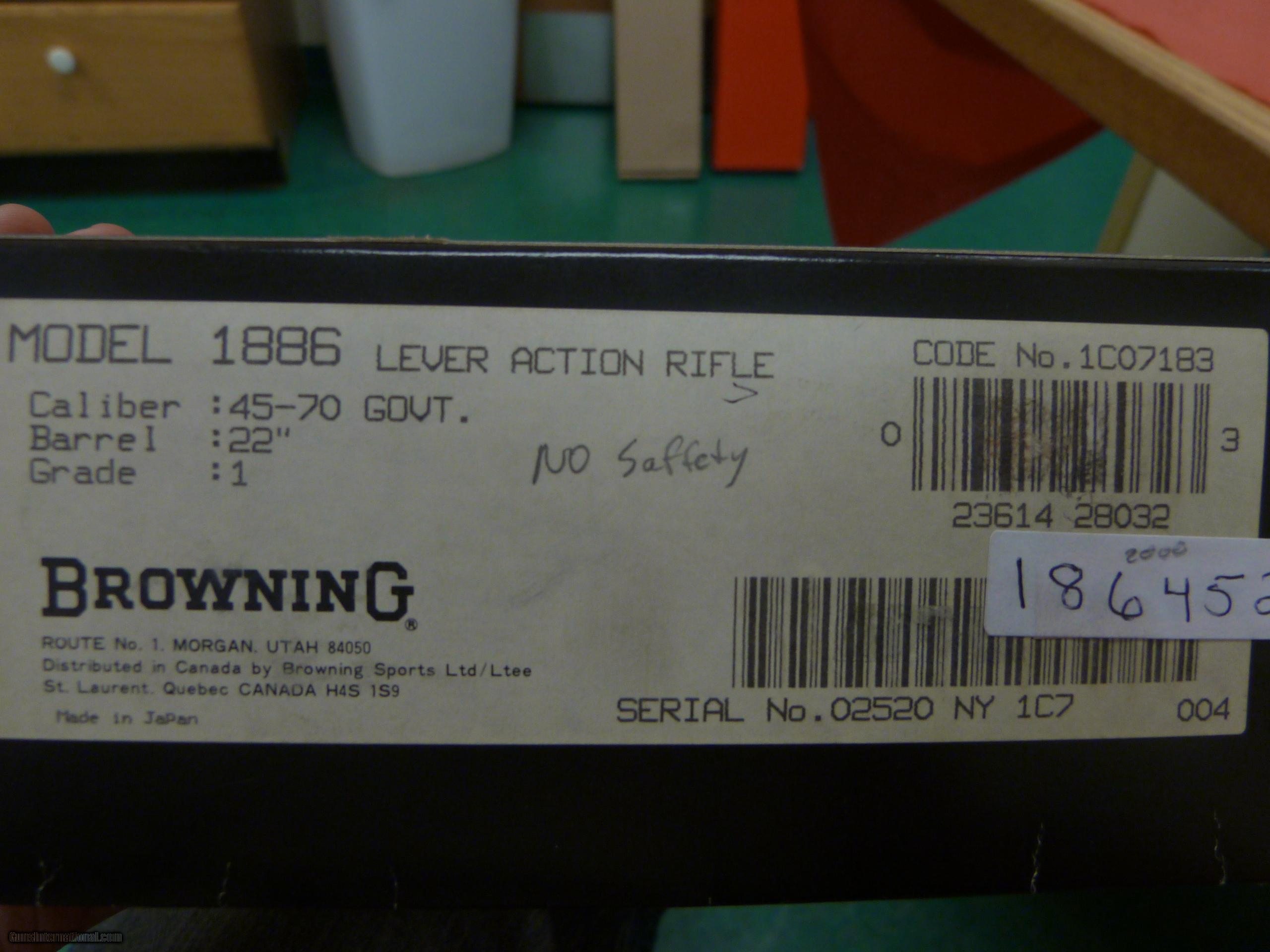 Description: Browning 1886 lever action 45/70 22" bbl, grade 1, no safety, brand ne win box, perfect collector gun. Only $2000 $40 shipping and no 3% cc fees. Please ask for Steve or Bob when calling 716-833-2581 or 716-835-1546. SOLD Manufacturer: Browning Model: 1886 Caliber Info: 45/70 Condition: NIB Barrels: 22 |