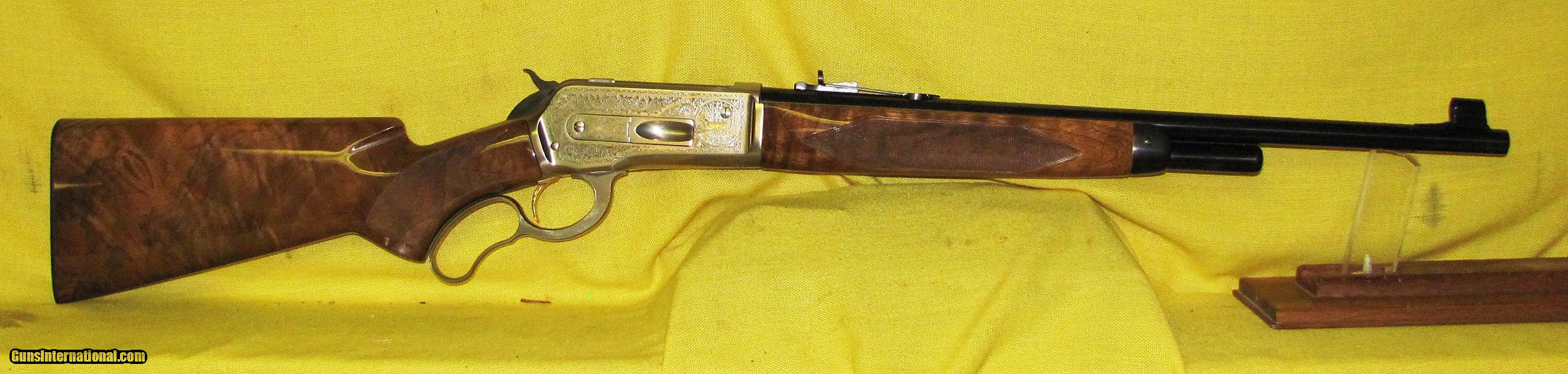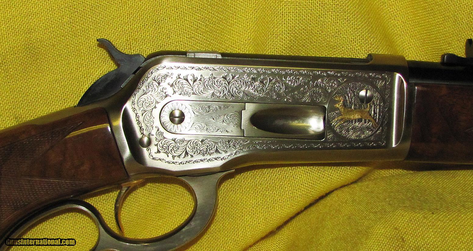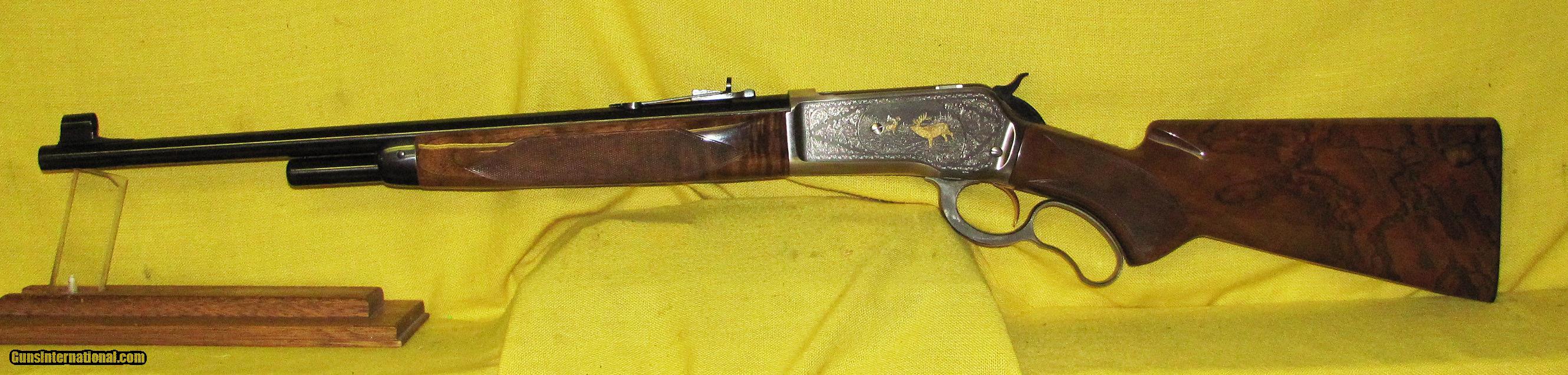Description: BROWNING 71 DELUXE (CARBINE) IN .348 WINCHESTER CAL., WITH 20" BARREL. COLOR SILVER/BLUE. CONDITION 99% LIKE NEW. SERIAL NUMBER 02178PR707. BROWNING MODEL 71 HI GRADE CARBINE, LIKE NEW HI LUSTER CHECKERED STOCK AND FORE ARM, MIRROR BORE, EXCELLENT SCROLL ENGRAVED RECEIVER WITH GOLD INLAYS OF ELK ON THE LEFT SIDE AND A BUCK ON THE RIGHT, 99% FACTORY FINISH, LIKE NEW CONDITION, NO BOX OR PAPERS. OUR NEW STOCK # D31946. SOLD |