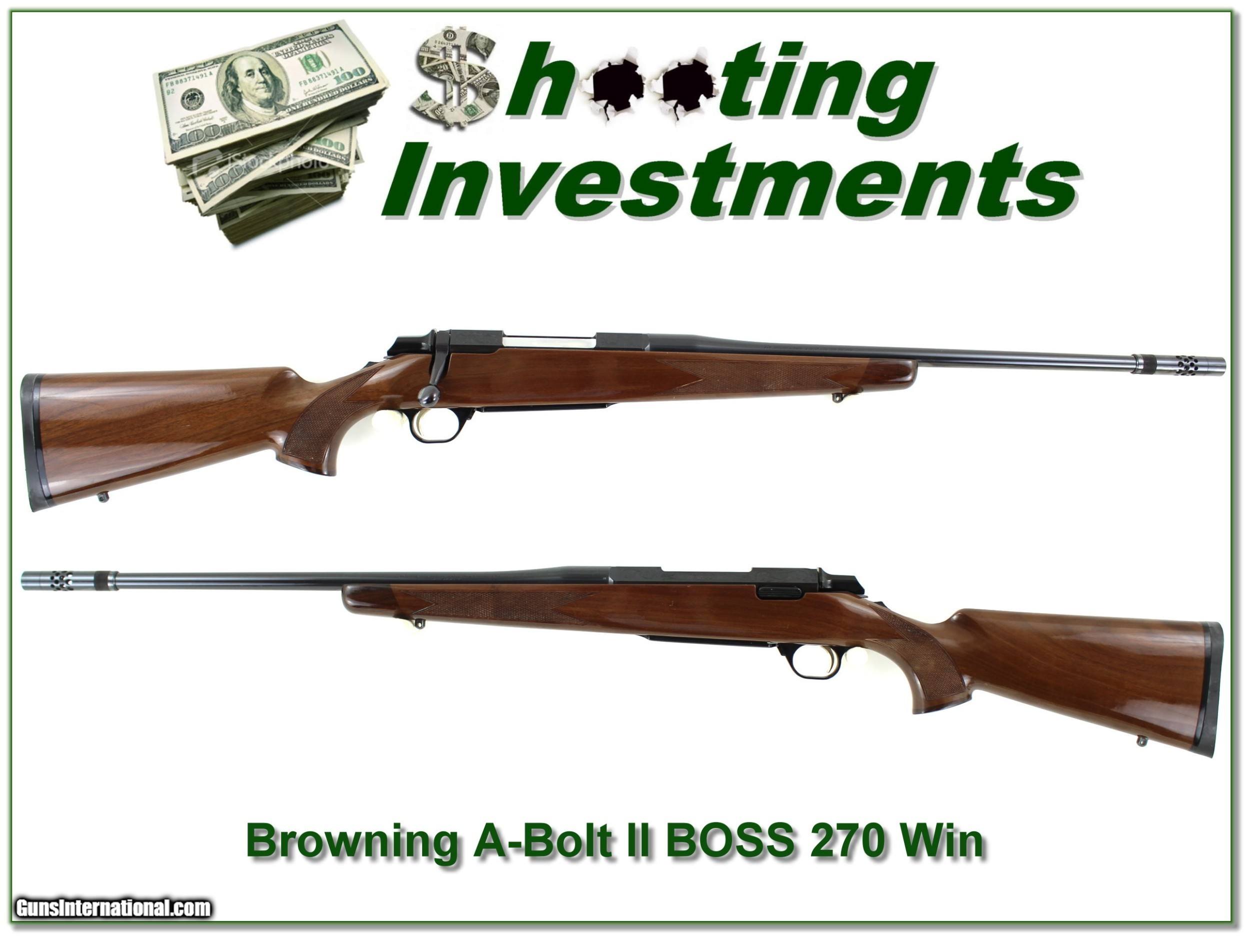 Description: This is an excellent condition Browning A-Bolt II in 270 Winchester. It has the harder to find BOSS which reduces recoil to near rimfire levels and can be used to tune the barrel for accuracy. The metal looks new and it has a 22in barrel including the BOSS. I find only a few insignificant handing marks on the wood. It will make a very nice hunting gun. DO NOT confuse with the cheap A-Bolt 3 or X-Bolt. This is an all-metal no longer made A-Bolt II! Shipping and insurance is $39. Please email me with any questions or larger pictures. (Consign your quality firearms with Shooting Investments for only 12%! Let me know if you have any you would like to sell!) 20-0559 Payment: Payment is by Money Order, Cashiers Check or Personal Check. I can now also accept Credit Cards (MasterCard, Visa, Discover & American Express) with a 3% convenience fee. Shipping: The shipping charge will be listed in each description. It is $39 for most firearms. Some heavy guns or those insured for over $2000 will be higher. Shipments to Alaska and Hawaii are higher because air shipment is required. Most firearms are shipped on Tuesday and Thursday and usually in 5 days of receipt of payment. We package all shipments carefully and insure them. Optics are shipped Priority Mail and most other non-firearm shipments are shipped First Class. Returns: Our return policy is simple. If for any reason you are not pleased with your purchase, you may return your item for a full refund of purchase price. Ammunition cannot be returned. It is important to us that you are happy. Guns cannot be fired or dissembled before returning them and they must be returned in the same condition as received. Notification of a return must occur with-in 3 days of receipt at your dealer. Shipping, convenience and dealer fees are not refundable and are the responsibility of the buyer. Lay-a-way: If needed, we offer a 60 day lay-a-way option on most firearms. It is 1/3 now, 1/3 in 30 days and 1/3 in 60 days. Lay-a-way firearm sales are final and if not completed the first payment cannot be returned. Consigning your firearms with Shooting Investments: We will help you get top dollar for your firearms. While most local guns shops charge 20% or more, our fee is only 12% with a minimum of $75. At your local gun shop it might take months to sell. Selling on-line provides instant access to thousands of interested buyers. You won’t find any other on-line dealer willing to sell your firearms for only 12% or listing every gun on 3 separate s. Selling through an House typically costs the seller 15% and the buyer an addition 15% (so 30%) and you have to wait several months to sell and longer to receive funds. If properly priced, we will sell your firearms in a few weeks. Send us an email or give us a call and we’ll explain how easy it is for you to get top dollar. Trading: Trading for use is really just buying your gun to re-sell. If you have a gun you want to trade, please email a picture and we will let you know what we can give or it. You will always get more if we sell it for you on consignment. Help for California Buyers: We are happy to ship to California. It is the buyer’s responsibility to make sure any item you buy is legal in your state. We are also happy to help with your purchase of a firearm from someone other than us. If you see a gun you would like to buy but the seller can’t or won’t ship to California they can ship to use and we’ll then ship it to your California dealer. The cost for this service is only $30 + shipping. Let us know if we can help! Payment: Payment is by Money Order, Cashiers Check or Personal Check. I can now also accept Credit Cards (MasterCard, Visa, Discover & American Express) with a 3% convenience fee. Shipping: The shipping charge will be listed in each description. It is $39 for most firearms. Some heavy guns or those insured for over $2000 will be higher. Shipments to Alaska and Hawaii are higher because air shipment is required. Most firearms are shipped on Tuesday and Thursday and usually in 5 days of receipt of payment. We package all shipments carefully and insure them. Optics are shipped Priority Mail and most other non-firearm shipments are shipped First Class. Returns: Our return policy is simple. If for any reason you are not pleased with your purchase, you may return your item for a full refund of purchase price. Ammunition cannot be returned. It is important to us that you are happy. Guns cannot be fired or dissembled before returning them and they must be returned in the same condition as received. Notification of a return must occur with-in 3 days of receipt at your dealer. Shipping, convenience and dealer fees are not refundable and are the responsibility of the buyer. Lay-a-way: If needed, we offer a 60 day lay-a-way option on most firearms. It is 1/3 now, 1/3 in 30 days and 1/3 in 60 days. Lay-a-way firearm sales are final and if not completed the first payment cannot be returned. Consigning your firearms with Shooting Investments: We will help you get top dollar for your firearms. While most local guns shops charge 20% or more, our fee is only 12% with a minimum of $75. At your local gun shop it might take months to sell. Selling on-line provides instant access to thousands of interested buyers. You won’t find any other on-line dealer willing to sell your firearms for only 12% or listing every gun on 3 separate s. Selling through an House typically costs the seller 15% and the buyer an addition 15% (so 30%) and you have to wait several months to sell and longer to receive funds. If properly priced, we will sell your firearms in a few weeks. Send us an email or give us a call and we’ll explain how easy it is for you to get top dollar. Trading: Trading for use is really just buying your gun to re-sell. If you have a gun you want to trade, please email a picture and we will let you know what we can give or it. You will always get more if we sell it for you on consignment. Help for 