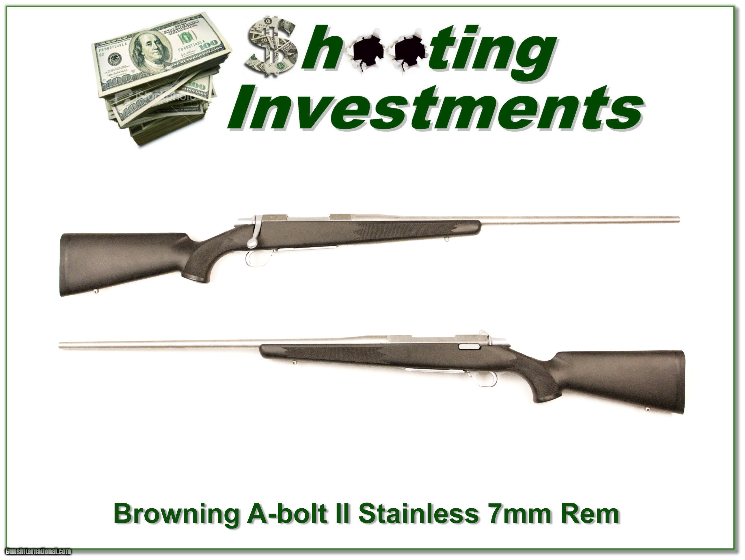 Description: This is an excellent near new condition Browning A-bolt II Stainless Stalker. It is a flat shooting 7mm Rem Mag. I am sure it never fired more than a few rounds and will make a great all-weather hunting gun. These A-bolts are no longer made and this one is sure to increase in value over time. That makes it a Shooting Investment. Shipping and insurance is $35 or $15 more if you want it shipped in a new Plano hard case. Please email me with any questions or larger pictures. (I now consign quality firearms only 10%! Let me know if you have any you would like to sell!) [16-0490] Payment: Payment is by Money Order, Cashiers Check or Personal Check. I can now also accept MasterCard and Visa with a 3% convenience fee. PayPal can be used for some items but never firearms. Please let us know if you would like to pay via PayPal. Shipping: The shipping charge will be listed in each description. It is $35 for most guns. Some heavy guns or those insured for over $2000 will be higher. Shipments to Alaska and Hawaii are higher because air shipment is required. Most firearms are shipped within 5 days of receipt of payment. We prefer shipping at the beginning of the week to avoid firearms in transit over weekends. We package all shipments carefully and insure them for the full purchase price, rounded up to the next $100. In the unlikely event that damage occurs, it is important that you save all packaging material for the claims process. Optics are shipped Priority Mail and most other non-firearm shipments are shipped First Class. Returns: Our return policy is simple. If for any reason you are not pleased with your purchase, you may return your item for a refund. The only exception is ammunition, it cannot be returned. It is important to us that you are happy. Guns cannot be fired or dissembled before returning them and must be returned in the same condition as received. Notification of a return must occur with-in 3 days of receipt at your dealer. Shipping, convenience and dealer fees are not refundable and are the responsibility of the buyer. Lay-a-way: If needed, we offer a 60 day lay-a-way option on most firearms. It is 1/3 now, 1/3 in 30 days and 1/3 in 60 days. Lay-a-way firearm sales are final. Consigning your firearms with Shooting Investments: We will help you get top dollar for your firearms. While most local guns shops charge 20% or more, our fee is only 10% with a minimum of $50. At your local gun shop it might take months to sell. Selling on-line provides instant access to thousands of interested buyers. You won’t find any other on-line dealer willing to sell your firearms for only 10% or listing every gun on 4 separate s. Selling through an House typically costs the seller 15% and the buyer an addition 15% (so 30%) and you have to wait several months to sell and longer to receive funds. If properly priced, we will sell your firearms in a week or two. Send us an email or give us a call and we’ll explain how easy it is for you to get top dollar. Trading: We collect guns and usually just trade for guns we want to add to our collections. We often sell guns for others wanting to purchase one of ours. We find this the most fair to both of us. Our Commission is only 10% and we hold the gun you want until yours sells. Please contact us if you want to sell one of yours to buy one of ours. Help for California Buyers: We are happy to ship to California. It is the buyer’s responsibility to make sure any item you buy is legal in your state. We are also happy to help with your purchase of a firearm from someone other than us. If you see a gun you would like to buy but the seller can’t or won’t ship to California we can help. You buy the gun and have it shipped to us. We’ll then ship it to your California dealer. The cost for this service is only $30 + shipping. Let me know if we can help! SOLD |