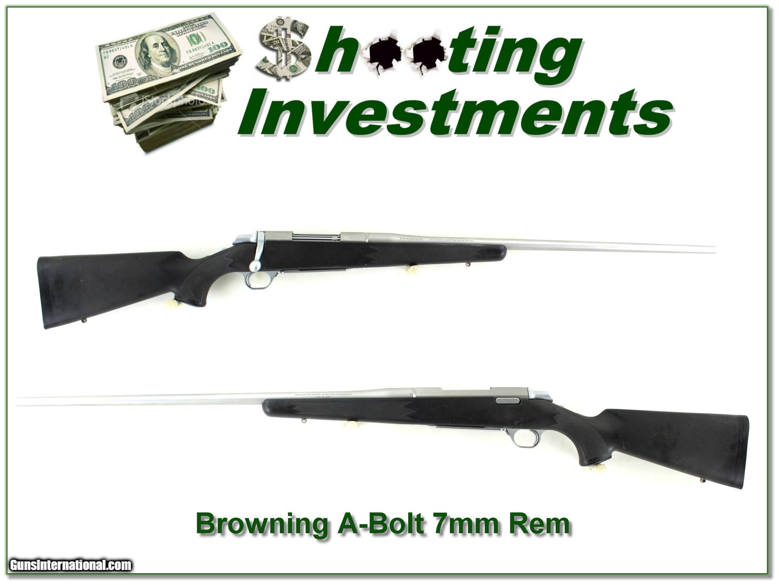 Description: Hard weather hunters, this is an excellent condition Browning A-Bolt Stainless Stalker in 7mm Remington Magnum. The metal is in top condition showing little use. It has a 26in barrel. The synthetic stock has only a few minor marks. This will make an excellent hunting gun and this is an all metal A-Bolt…not the plastic feeling X-Bolt. Shipping with insurance is $39. Please email me with any questions or larger pictures. (Consign your quality firearms with Shooting Investments for only 12%! Let me know if you have any you would like to sell!) 21-1613 Payment: Payment is by Money Order, Cashiers Check or Personal Check. I can now also accept Credit Cards (MasterCard, Visa, Discover & American Express) with a 3% convenience fee. Shipping: The shipping charge will be listed in each description. It is $39 for most firearms. Some heavy guns or those insured for over $2000 will be higher. Shipments to Alaska and Hawaii are higher because air shipment is required. Most firearms are shipped on Tuesday and Thursday and usually in 5 days of receipt of payment. We package all shipments carefully and insure them. Optics are shipped Priority Mail and most other non-firearm shipments are shipped First Class. Returns: Our return policy is simple. If for any reason you are not pleased with your purchase, you may return your item for a full refund of purchase price. Ammunition cannot be returned. It is important to us that you are happy. Guns cannot be fired or dissembled before returning them and they must be returned in the same condition as received. Notification of a return must occur with-in 3 days of receipt at your dealer. Shipping, convenience and dealer fees are not refundable and are the responsibility of the buyer. Lay-a-way: If needed, we offer a 60 day lay-a-way option on most firearms. It is 1/3 now, 1/3 in 30 days and 1/3 in 60 days. Lay-a-way firearm sales are final and if not completed the first payment cannot be returned. Consigning your firearms with Shooting Investments: We will help you get top dollar for your firearms. While most local guns shops charge 20% or more, our fee is only 12% with a minimum of $75. At your local gun shop it might take months to sell. Selling on-line provides instant access to thousands of interested buyers. You won’t find any other on-line dealer willing to sell your firearms for only 12% or listing every gun on 3 separate s. Selling through an House typically costs the seller 15% and the buyer an addition 15% (so 30%) and you have to wait several months to sell and longer to receive funds. If properly priced, we will sell your firearms in a few weeks. Send us an email or give us a call and we’ll explain how easy it is for you to get top dollar. Trading: Trading for use is really just buying your gun to re-sell. If you have a gun you want to trade, please email a picture and we will let you know what we can give or it. You will always get more if we sell it for you on consignment. Help for California Buyers: We are happy to ship to California. It is the buyer’s responsibility to make sure any item you buy is legal in your state. We are also happy to help with your purchase of a firearm from someone other than us. If you see a gun you would like to buy but the seller can’t or won’t ship to California they can ship to use and we’ll then ship it to your California dealer. The cost for this service is only $30 + shipping. Let us know if we can help! SOLD |