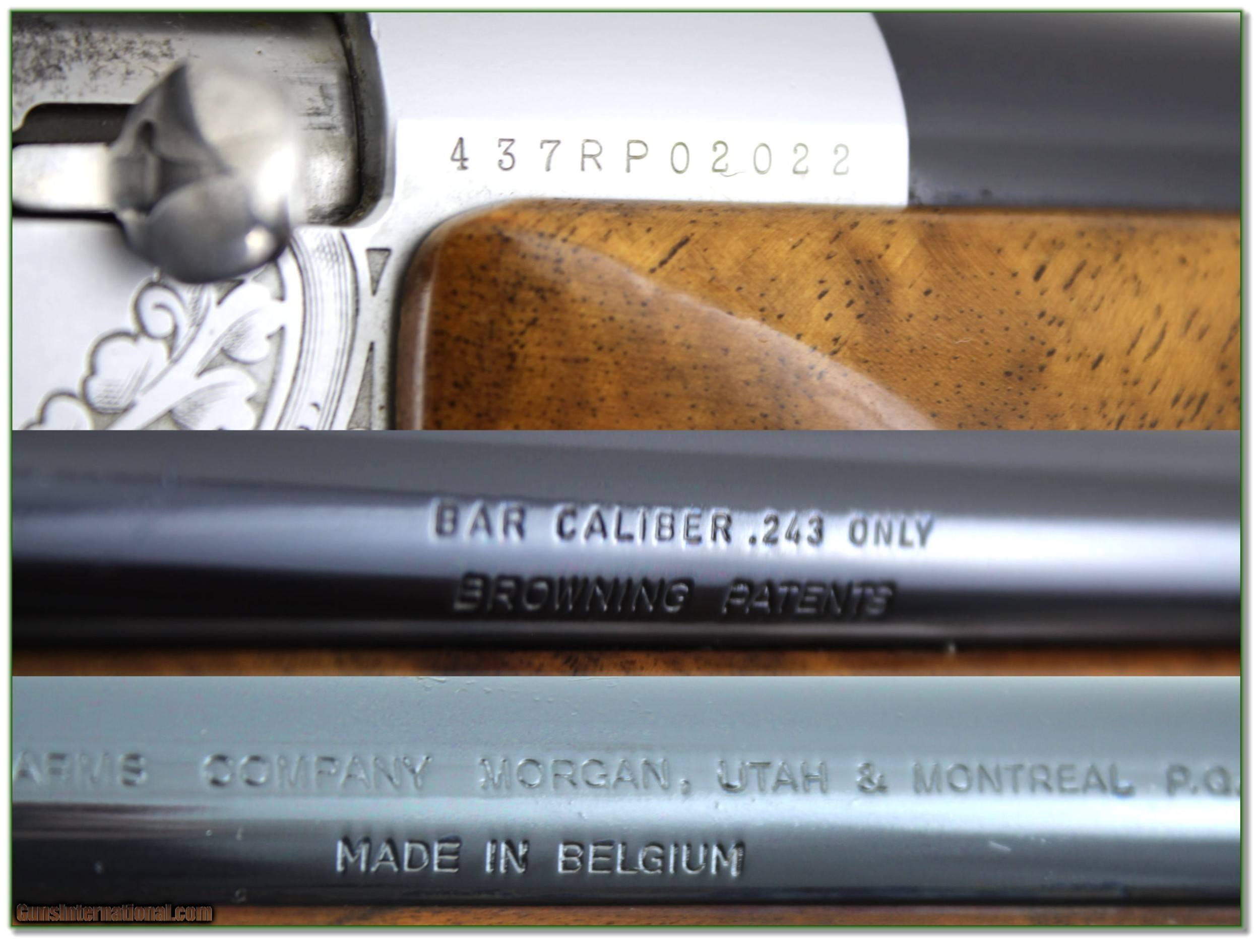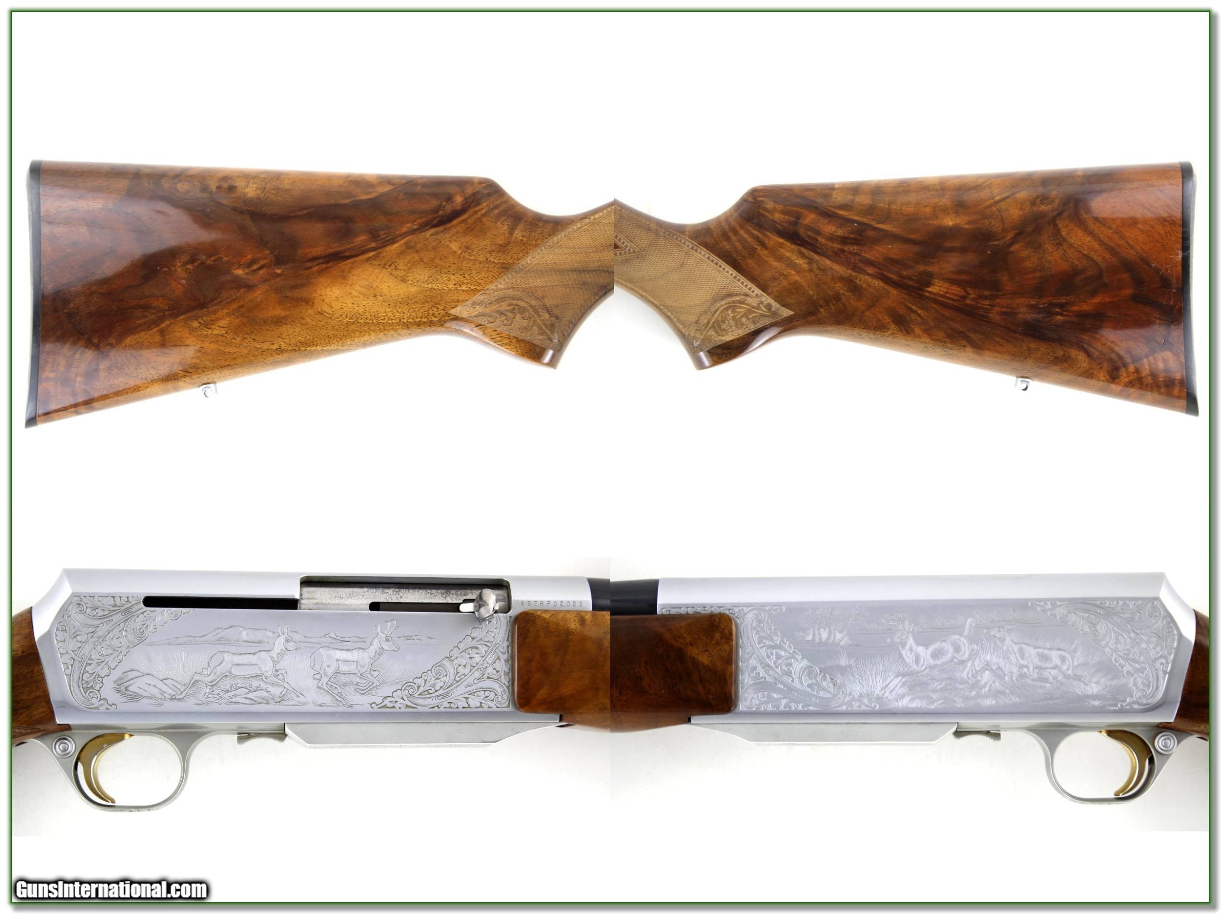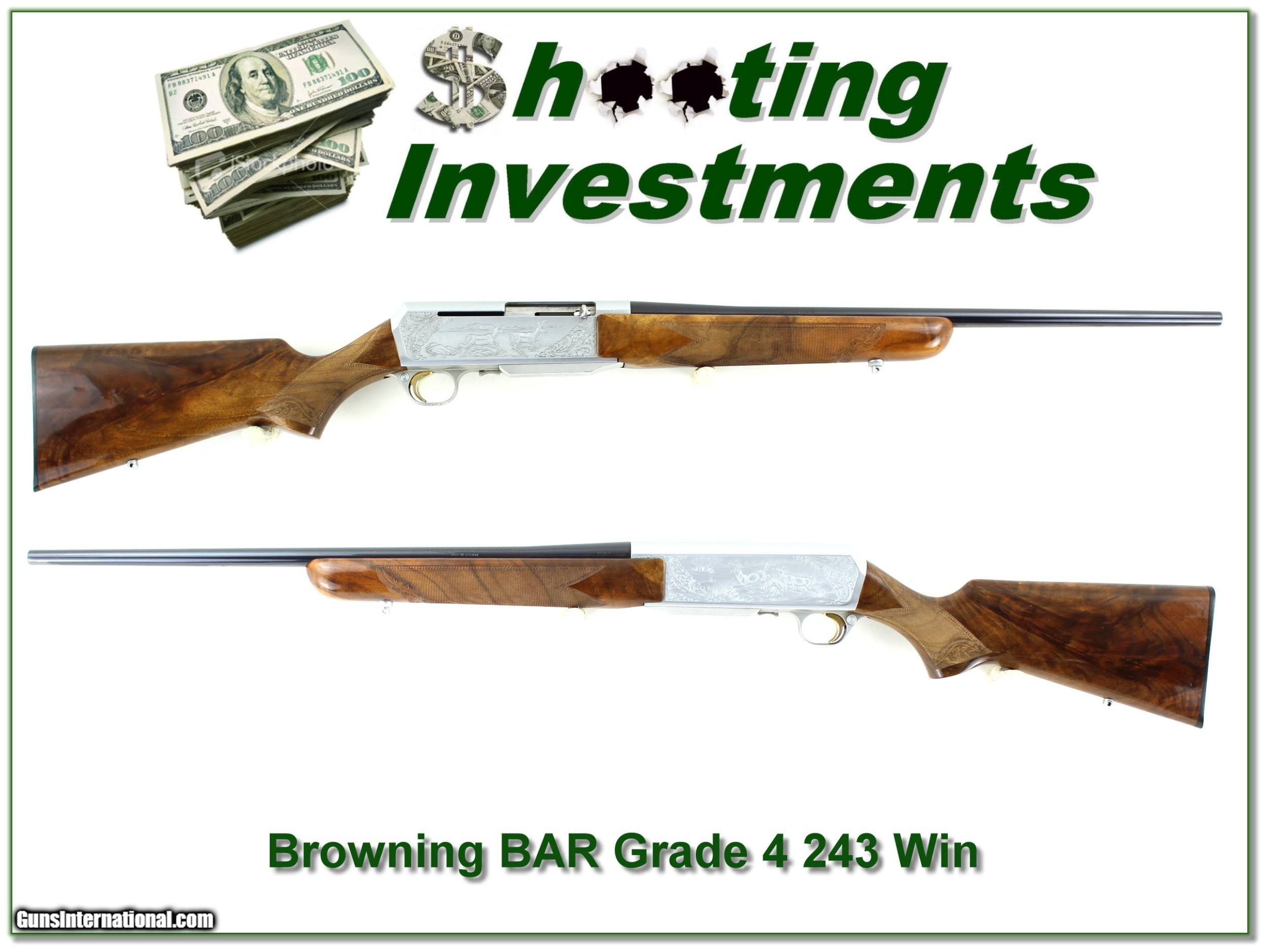 Description: Collectors and high-end hunters, this is a VERY hard to find BAR Grade 4 in 243 Winchester. These Grade 4’s were hand engraved and this one was signed by Baerten. These are all hard to find and the 243 is about the hardest. This one has outstanding wood colors and figure. It has been lightly used. The barrel and receiver looks perfect. I find some edge wear on the dropdown magazine and a few minor marks on the wood. It could easily be restored to perfect or I’d just keep it as is. It is a real Shooting Investment! Shipping and insurance is $69. Please email me with any questions or larger pictures. (Consign your quality firearms with Shooting Investments for only 12%! Let me know if you have any you would like to sell!) 21-0303 Payment: Payment is by Money Order, Cashiers Check or Personal Check. I can now also accept Credit Cards (MasterCard, Visa, Discover & American Express) with a 3% convenience fee. Shipping: The shipping charge will be listed in each description. It is $39 for most firearms. Some heavy guns or those insured for over $2000 will be higher. Shipments to Alaska and Hawaii are higher because air shipment is required. Most firearms are shipped on Tuesday and Thursday and usually in 5 days of receipt of payment. We package all shipments carefully and insure them. Optics are shipped Priority Mail and most other non-firearm shipments are shipped First Class. Returns: Our return policy is simple. If for any reason you are not pleased with your purchase, you may return your item for a full refund of purchase price. Ammunition cannot be returned. It is important to us that you are happy. Guns cannot be fired or dissembled before returning them and they must be returned in the same condition as received. Notification of a return must occur with-in 3 days of receipt at your dealer. Shipping, convenience and dealer fees are not refundable and are the responsibility of the buyer. Lay-a-way: If needed, we offer a 60 day lay-a-way option on most firearms. It is 1/3 now, 1/3 in 30 days and 1/3 in 60 days. Lay-a-way firearm sales are final and if not completed the first payment cannot be returned. Consigning your firearms with Shooting Investments: We will help you get top dollar for your firearms. While most local guns shops charge 20% or more, our fee is only 12% with a minimum of $75. At your local gun shop it might take months to sell. Selling on-line provides instant access to thousands of interested buyers. You won’t find any other on-line dealer willing to sell your firearms for only 12% or listing every gun on 3 separate s. Selling through an House typically costs the seller 15% and the buyer an addition 15% (so 30%) and you have to wait several months to sell and longer to receive funds. If properly priced, we will sell your firearms in a few weeks. Send us an email or give us a call and we’ll explain how easy it is for you to get top dollar. Trading: Trading for use is really just buying your gun to re-sell. If you have a gun you want to trade, please email a picture and we will let you know what we can give or it. You will always get more if we sell it for you on consignment. Help for California Buyers: We are happy to ship to California. It is the buyer’s responsibility to make sure any item you buy is legal in your state. We are also happy to help with your purchase of a firearm from someone other than us. If you see a gun you would like to buy but the seller can’t or won’t ship to California they can ship to use and we’ll then ship it to your California dealer. The cost for this service is only $30 + shipping. Let us know if we can help! SOLD |