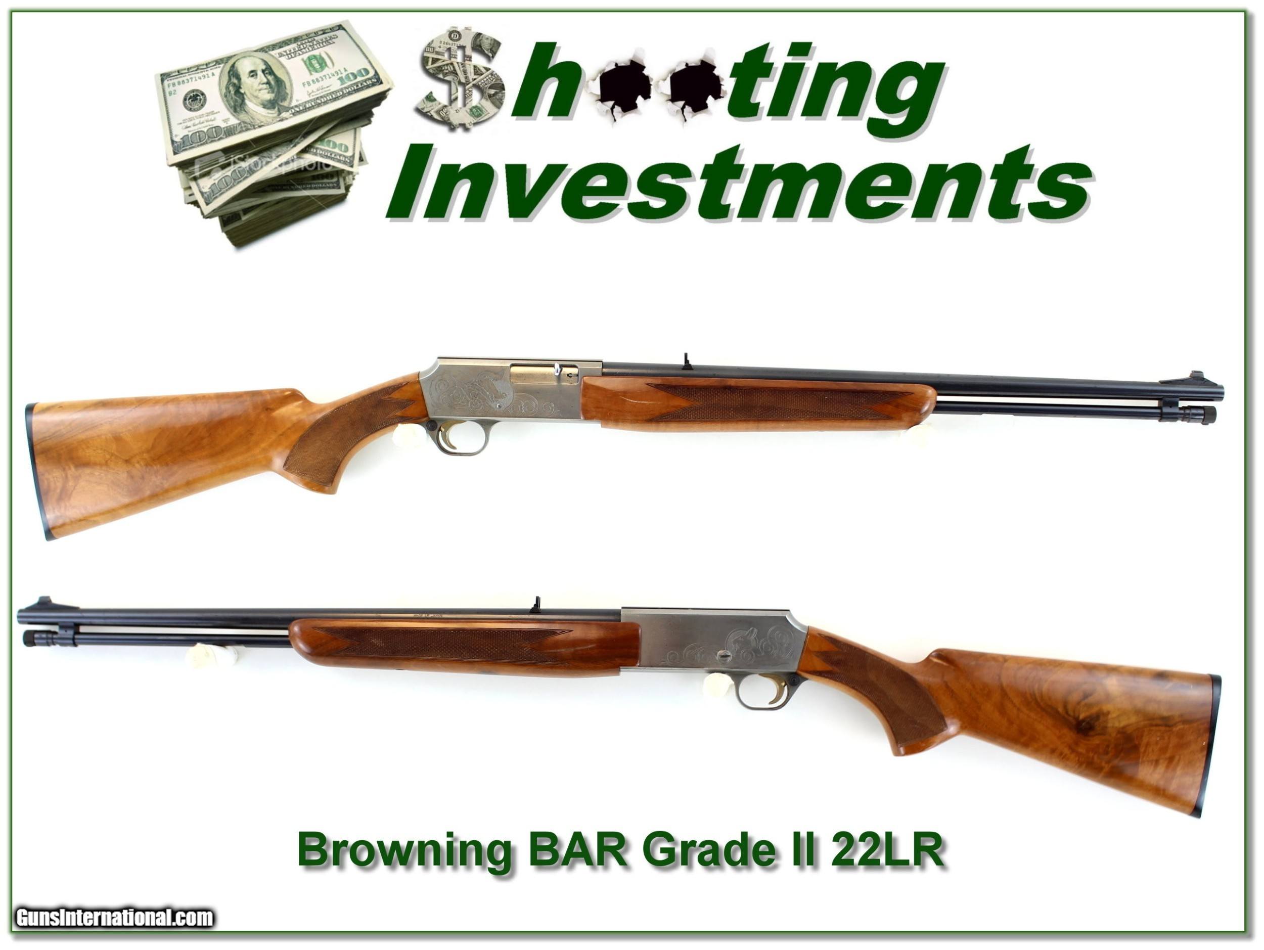 Description: This is a very nice and VERY hard to find Browning BAR Grade II 22LR. It has beautiful wood and a silver engraved receiver. The wood has only a few minor marks. The receiver has some light freckles typical of these guns. This one will make a nice addition to your collection. I am selling this one on consignment and as such lay-a-way can’t be used. It does of course have the standard 3-day inspection. Shipping with insurance is $39. Please email me with any questions or larger pictures. (Consign your quality firearms with Shooting Investments for only 12%! Let me know if you have any you would like to sell!) 20-0130 Payment: Payment is by Money Order, Cashiers Check or Personal Check. I can now also accept MasterCard and Visa with a 3% convenience fee. PayPal can be used for some items but never firearms. Please let us know if you would like to pay via PayPal. Shipping: The shipping charge will be listed in each description. It is $39 for most guns. Some heavy guns or those insured for over $2000 will be higher. Shipments to Alaska and Hawaii are higher because air shipment is required. Most firearms are shipped on Tuesday and Thursday and usually in 5 days of receipt of payment. We package all shipments carefully and insure them. Returns: Our return policy is simple. If for any reason you are not pleased with your purchase, you may return your item for a full refund of purchase price. Ammunition cannot be returned. It is important to us that you are happy. Guns cannot be fired or dissembled before returning them and they must be returned in the same condition as received. Notification of a return must occur with-in 3 days of receipt at your dealer. Shipping, convenience and dealer fees are not refundable and are the responsibility of the buyer. Lay-a-way: If needed, we offer a 60 day lay-a-way option on most firearms. It is 1/3 now, 1/3 in 30 days and 1/3 in 60 days. Lay-a-way firearm sales are final and if not completed the first payment cannot be returned. Consigning your firearms with Shooting Investments: We will help you get top dollar for your firearms. While most local guns shops charge 20% or more, our fee is only 12% with a minimum of $75. At your local gun shop it might take months to sell. Selling on-line provides instant access to thousands of interested buyers. You won’t find any other on-line dealer willing to sell your firearms for only 12% or listing every gun on 3 separate s. Selling through an House typically costs the seller 15% and the buyer an addition 15% (so 30%) and you have to wait several months to sell and longer to receive funds. If properly priced, we will sell your firearms in a few weeks. Send us an email or give us a call and we’ll explain how easy it is for you to get top dollar. Trading: Trading for use is really just buying your gun to re-sell. If you have a gun you want to trade, please email a picture and we will let you know what we can give or it. You will always get more if we sell it for you on consignment. Help for California Buyers: We are happy to ship to California. It is the buyer’s responsibility to make sure any item you buy is legal in your state. We are also happy to help with your purchase of a firearm from someone other than us. If you see a gun you would like to buy but the seller can’t or won’t ship to California they can ship to use and we’ll then ship it to your California dealer. The cost for this service is only $30 + shipping. Let us know if we can help! SOLD |